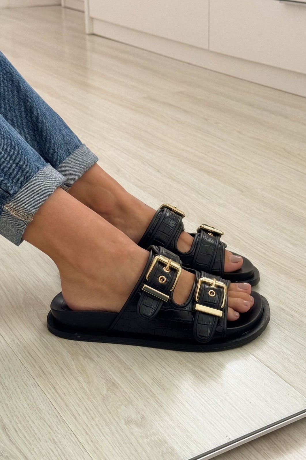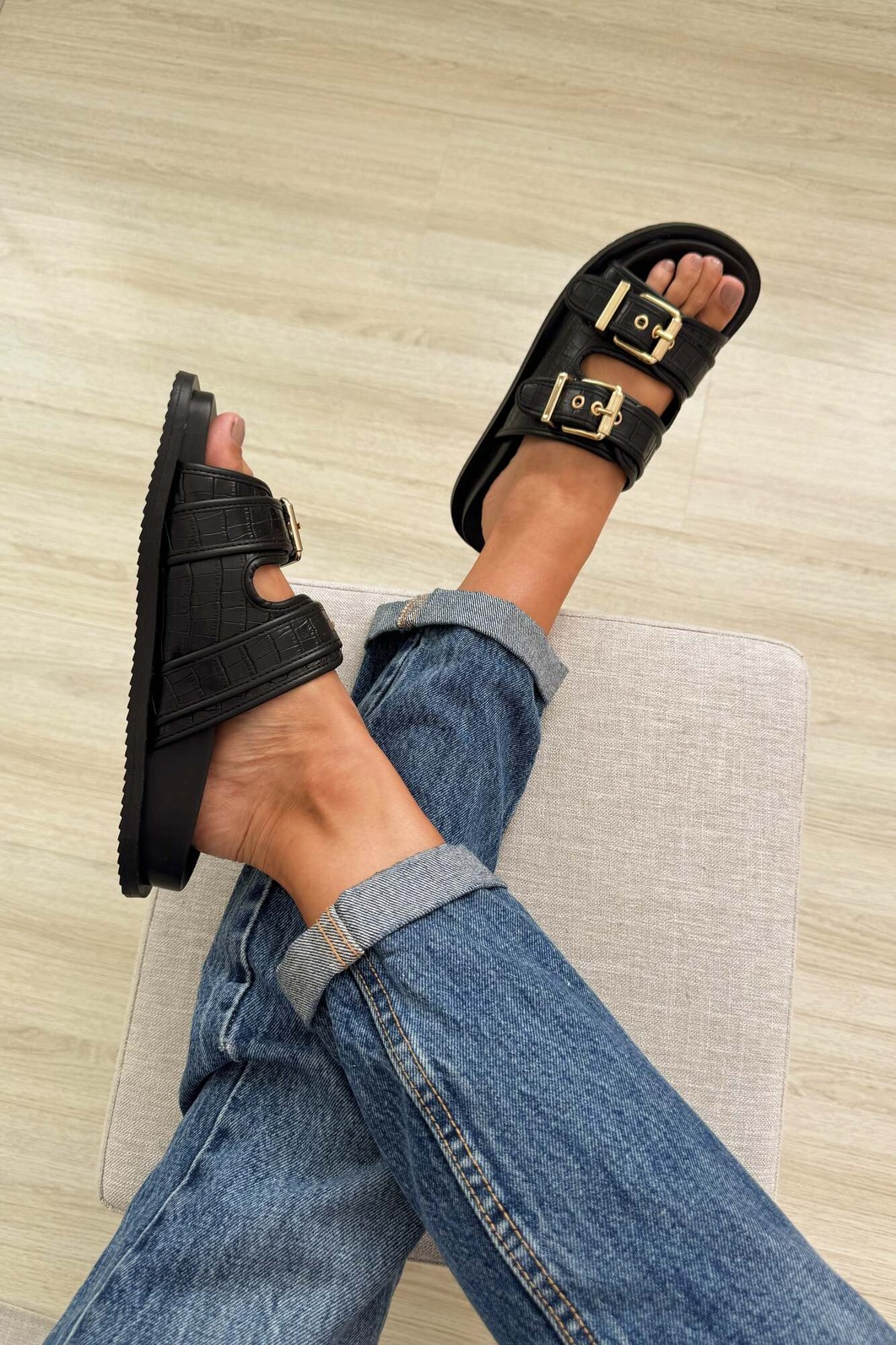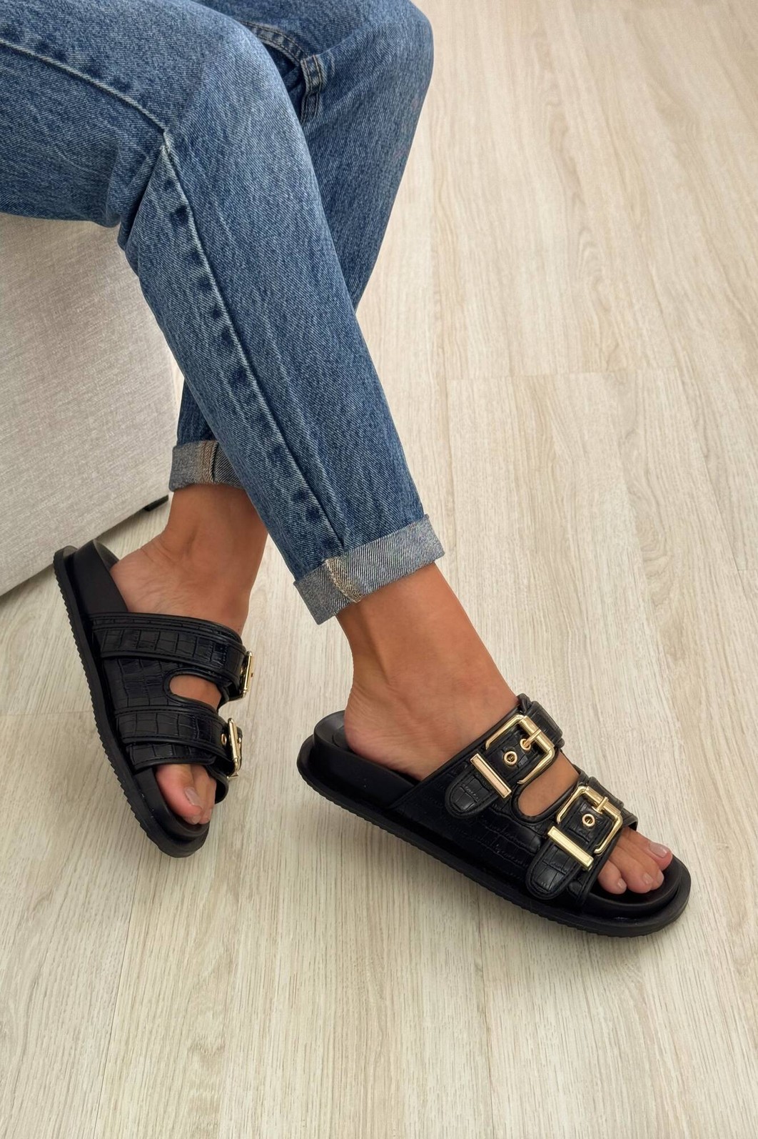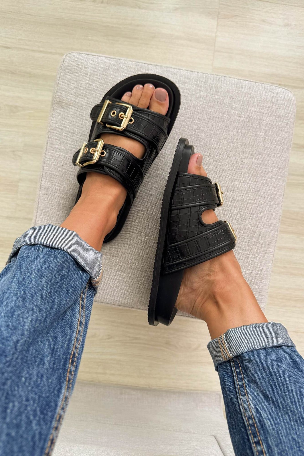 Detalhes: Textura croco, Duas fivelas douradas, Sola anatômica, Estilo birken contemporâneo
