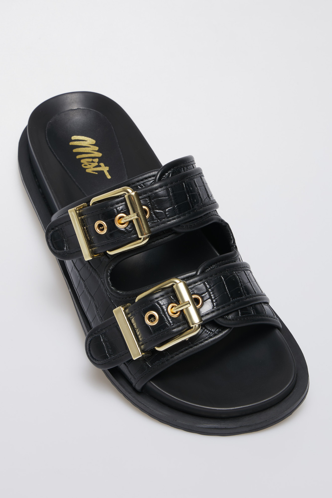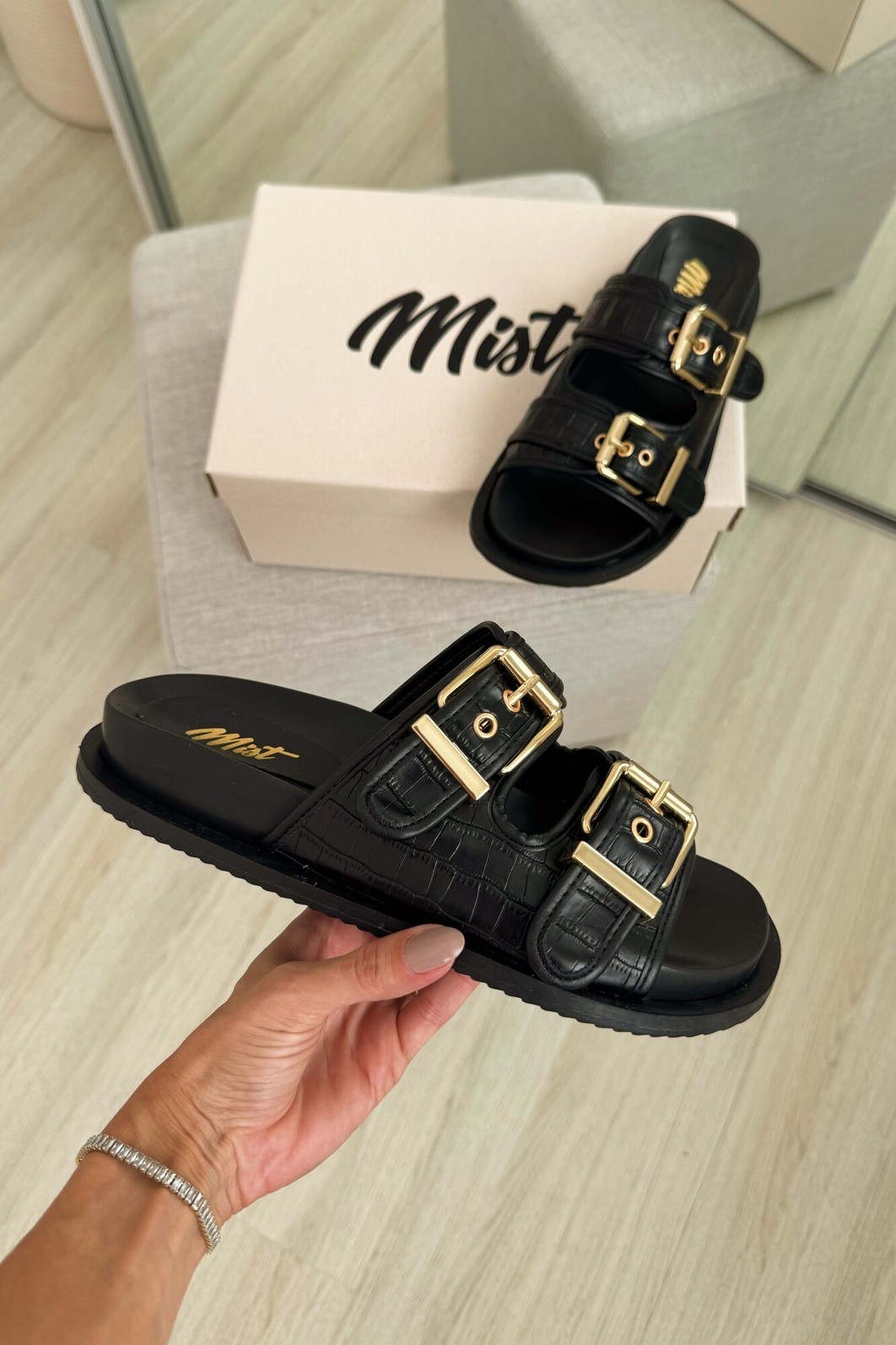 A Birken Croco Preta MIST une conforto e estilo contemporâneo. Seu acabamento em croco sintético preto traz sofisticação, enquanto as duas fivelas douradas adicionam um toque fashion.