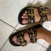 Suas duas tiras largas possuem imponentes fivelas douradas ajustáveis, garantindo o ajuste perfeito. A palmilha anatômica abraça o pé para um caminhar leve. Versátil, transita do jeans à alfaiataria, sendo a escolha ideal para levantar o visual com um toque premium.