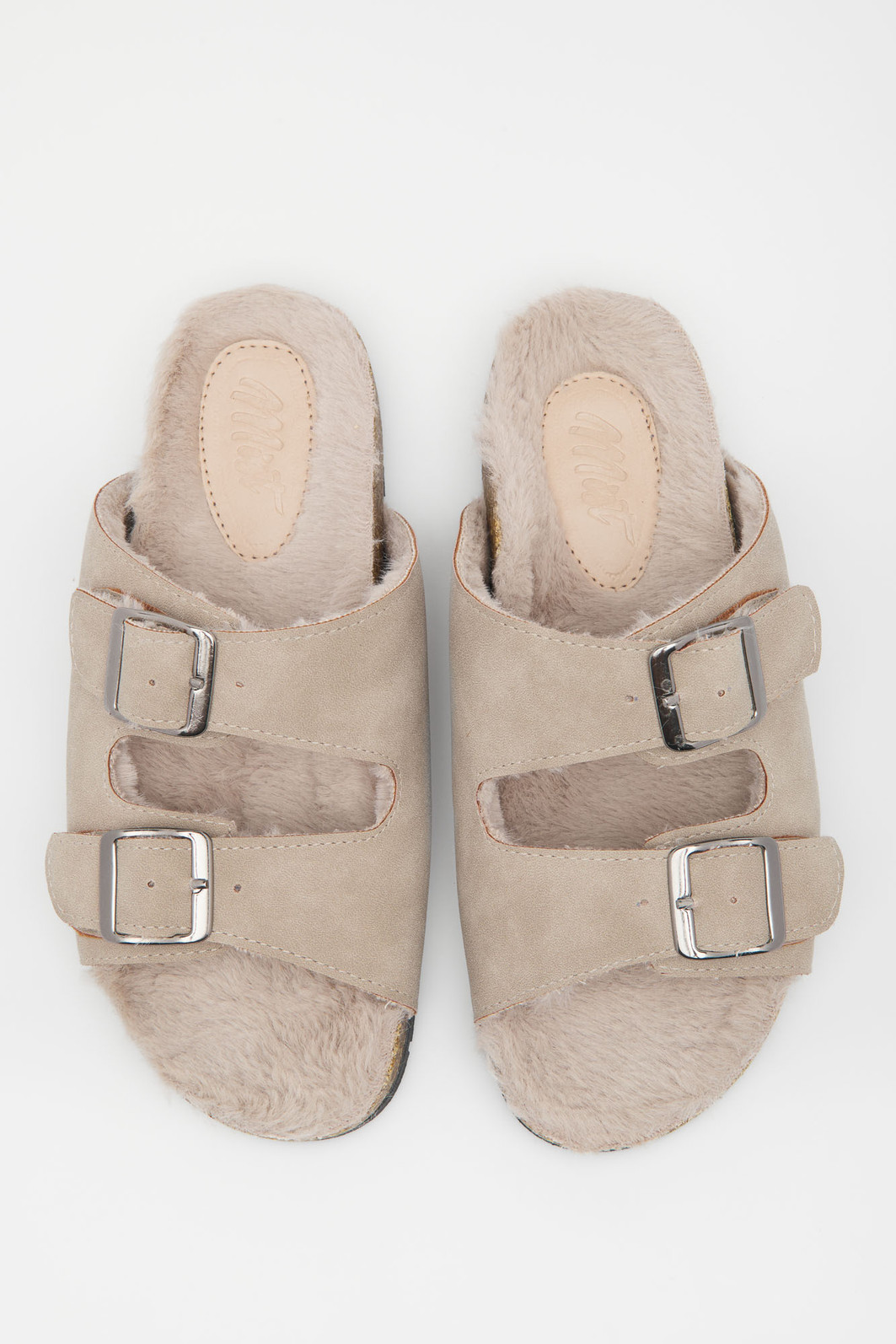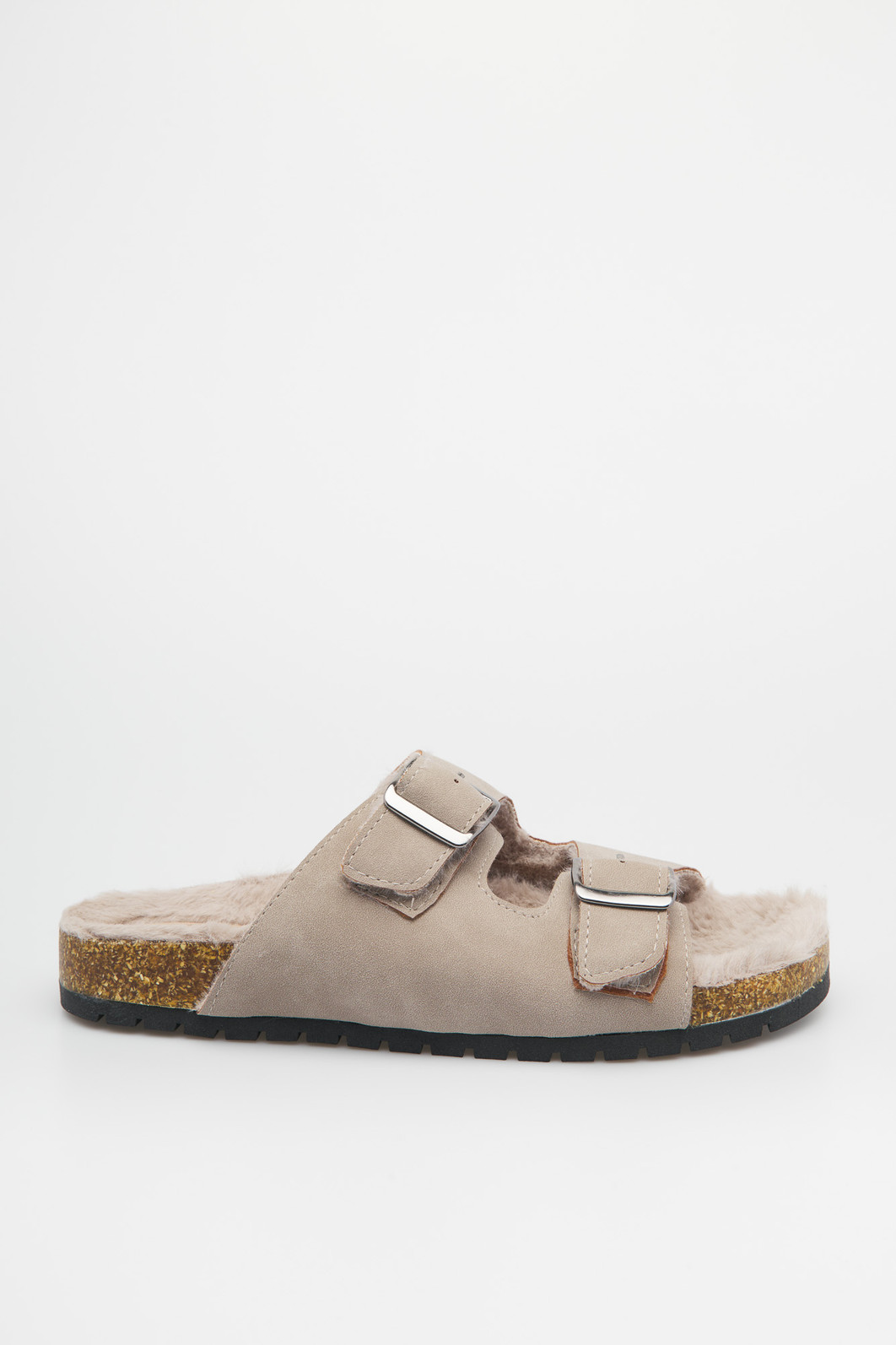 As fivelas prateadas garantem ajuste perfeito, enquanto o solado com textura que remete à cortiça proporciona estabilidade e leveza. Perfeita para relaxar em casa ou compor um visual comfy chic com jeans e tricô, é o abraço que seus pés merecem.