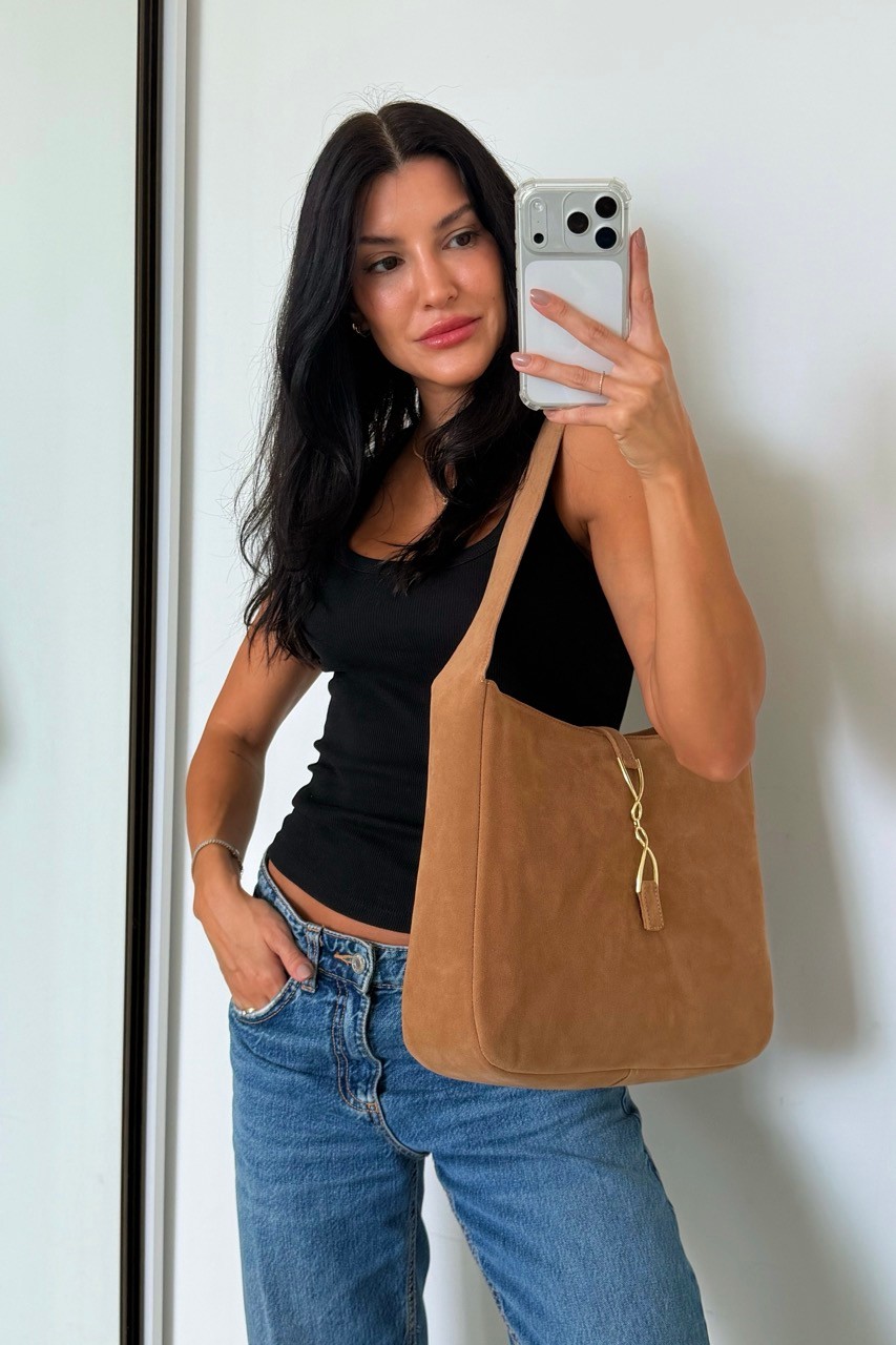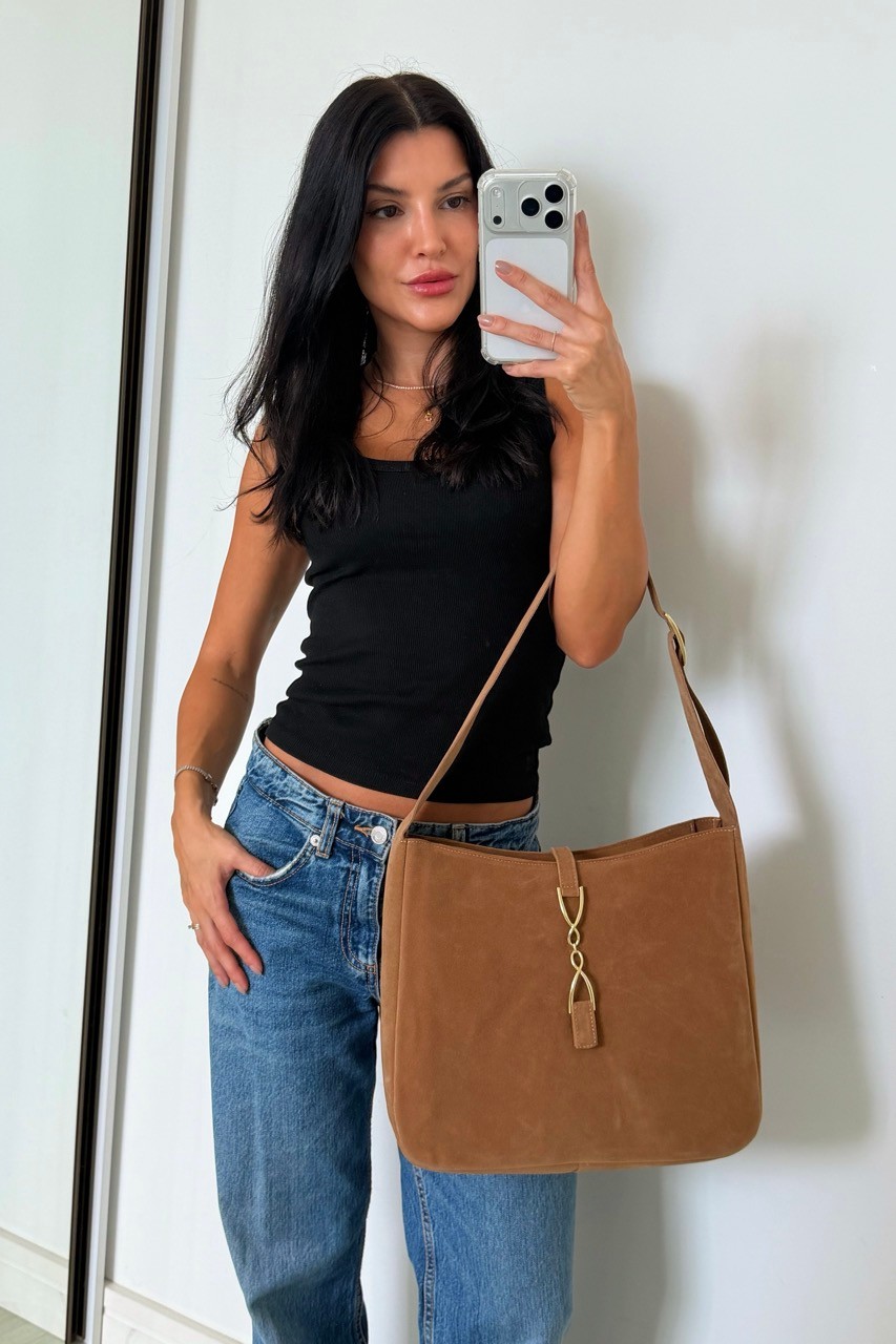 A Bolsa Nina Capuccino MIST foi criada para quem ama praticidade com estilo. Com design minimalista, combina o visual moderno das hobo bags com o toque sofisticado do suede macio, transformando qualquer look.
