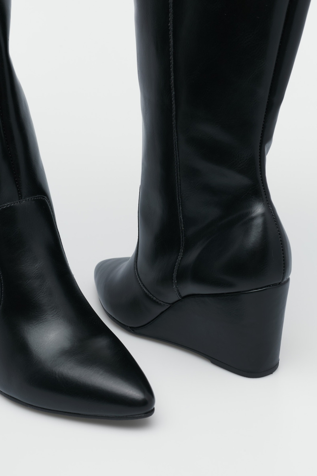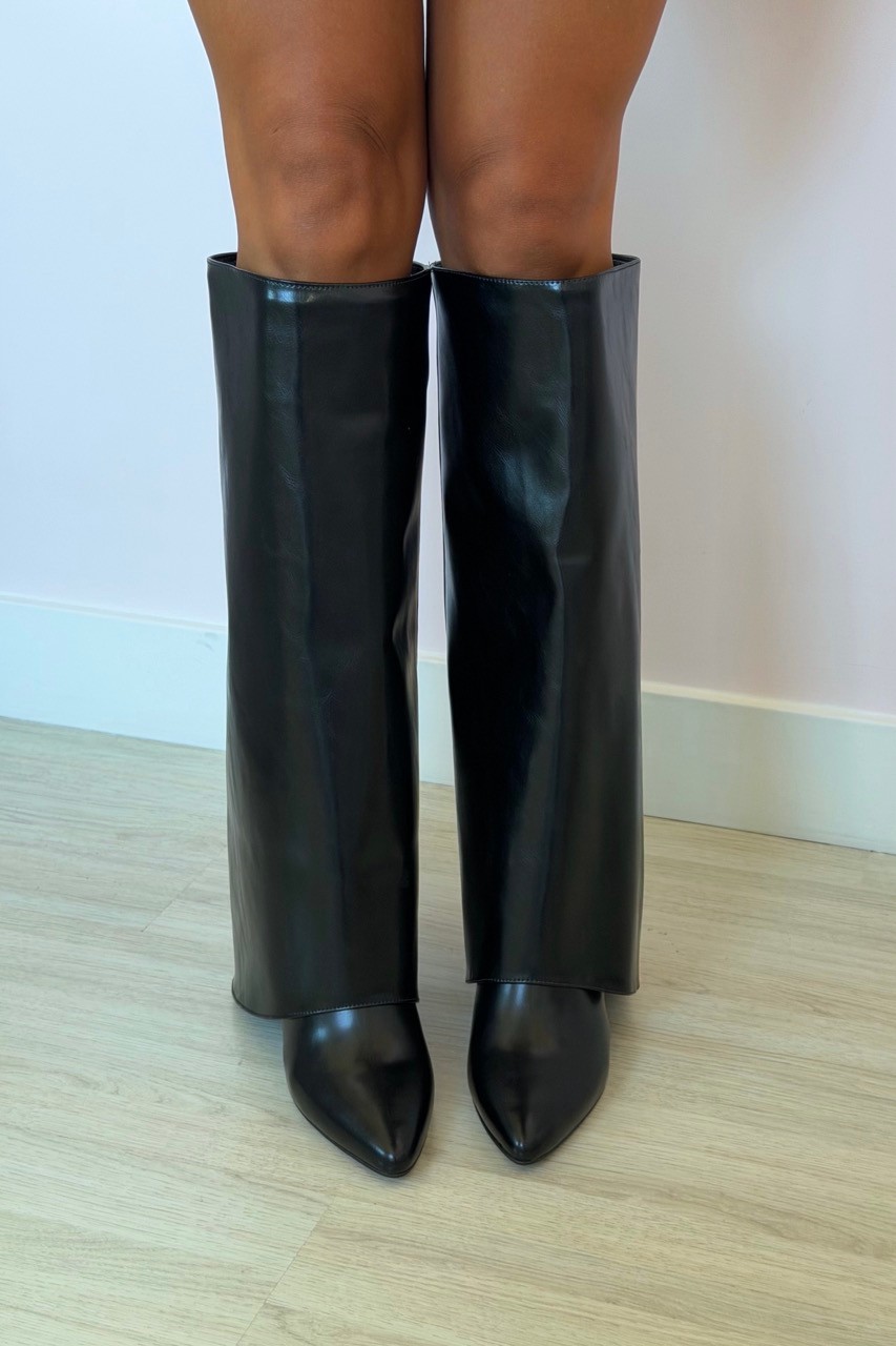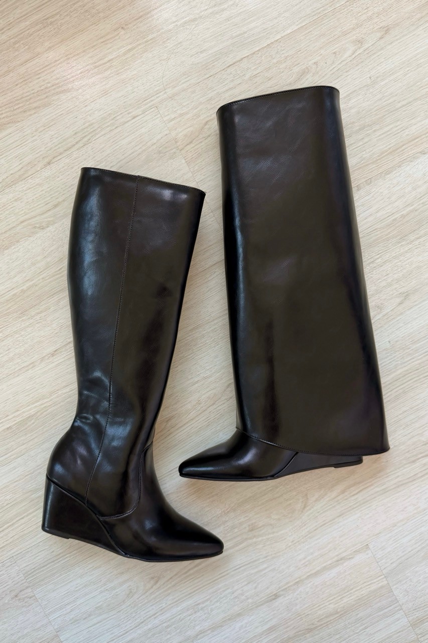 O salto anabela oferece estabilidade total, enquanto o bico fino alonga a silhueta. A cor preto é a tendência do inverno. O investimento inteligente para quem busca dois estilos em uma única bota poderosa.