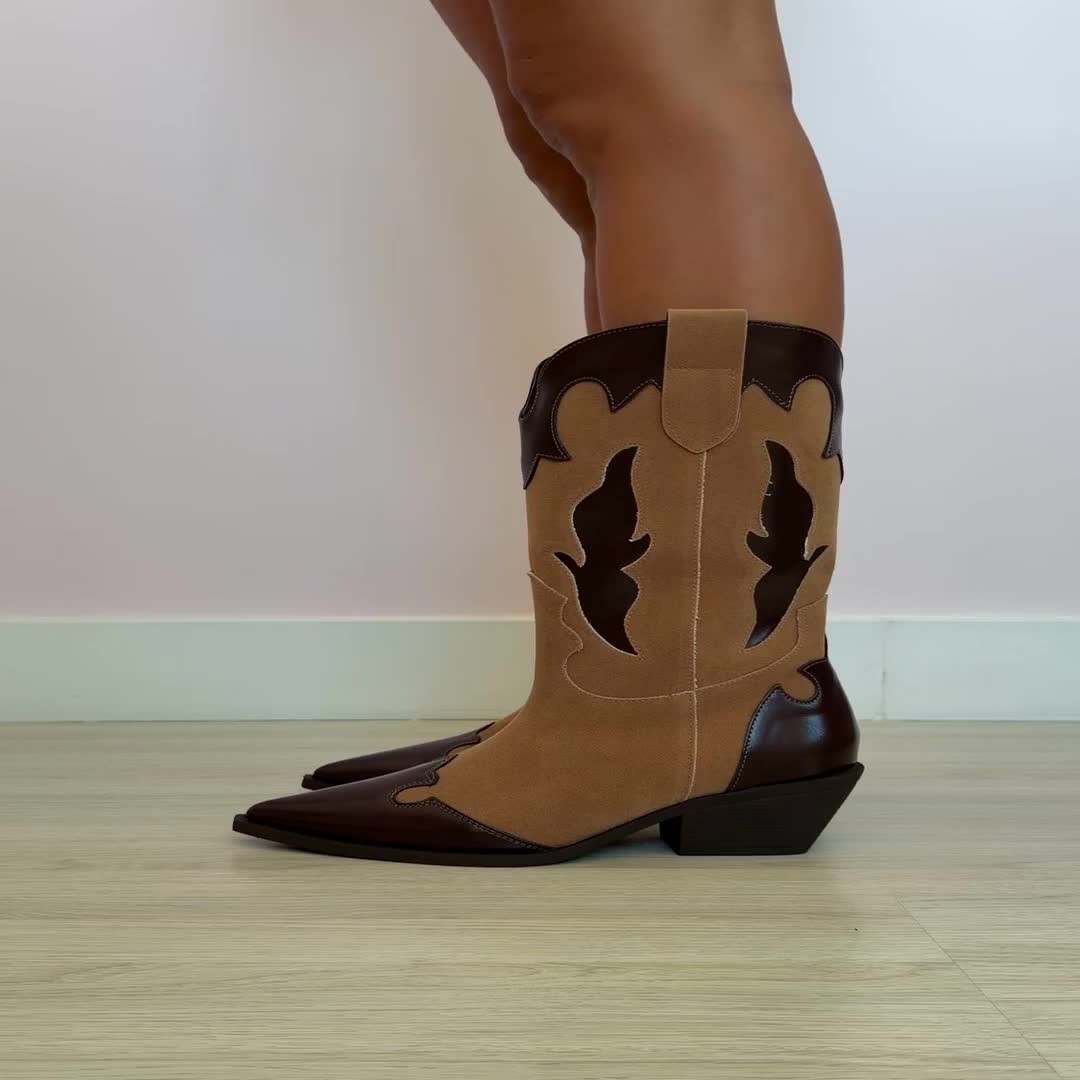 Entre na tendência Western com a Bota Ruby Capuccino MIST. Unindo a estética Cowboy Core com sofisticação urbana, ela apresenta uma combinação elegante de camurça capuccino com recortes em napa marrom café.