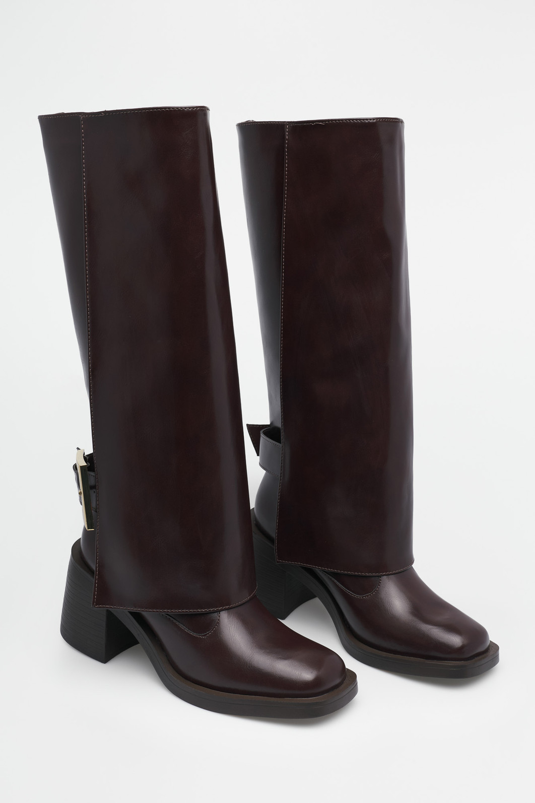O salto bloco geométrico garante estabilidade, enquanto a fivela lateral adiciona um ponto de luz e atitude. O tom Café oferece uma elegância atemporal e versátil, ideal para protagonizar suas produções com saias curtas ou looks oversized.