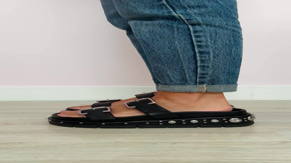 A Flat Carine Preto da MIST combina atitude e conforto em uma sandália flatform contemporânea. Suas duas tiras ajustáveis com fivelas prateadas e o solado robusto decorado com tachas metálicas garantem um visual de impacto.