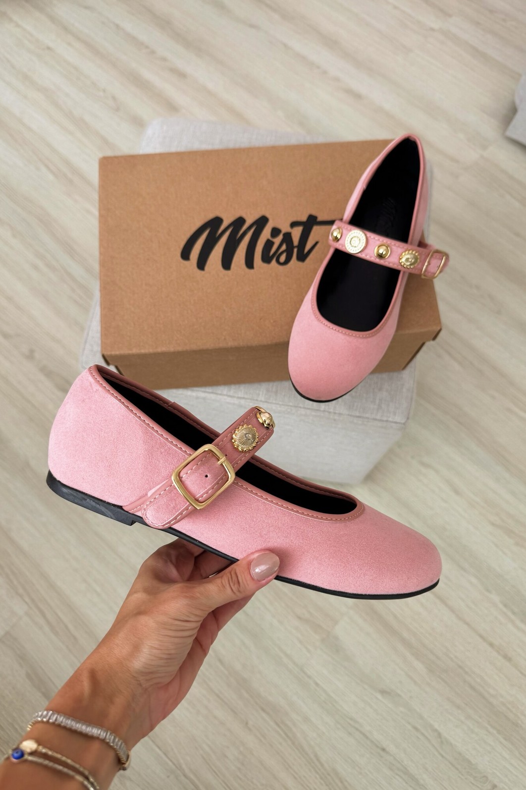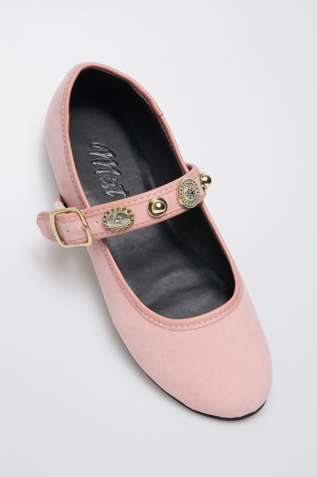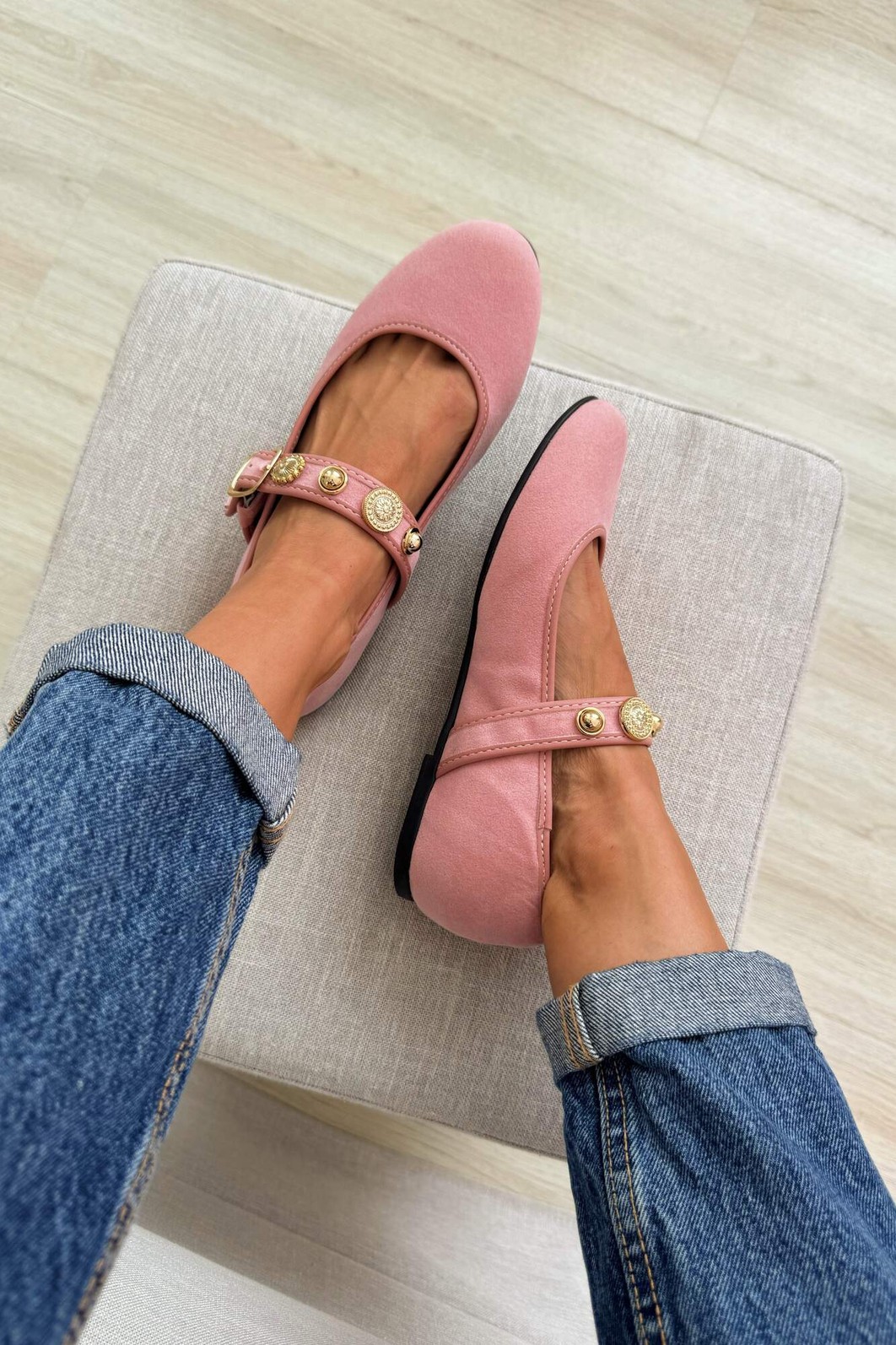 Sapatilha feminina Flat Cecília Rose MIST em camurça rosa com tira ajustável e fivela dourada. Design Mary Jane exclusivo com apliques dourados decorativos. Conforto e estilo para seu dia