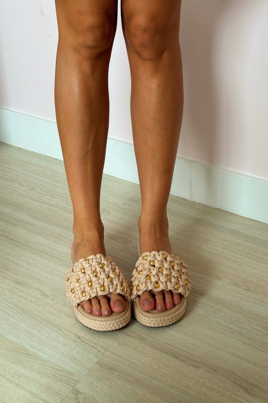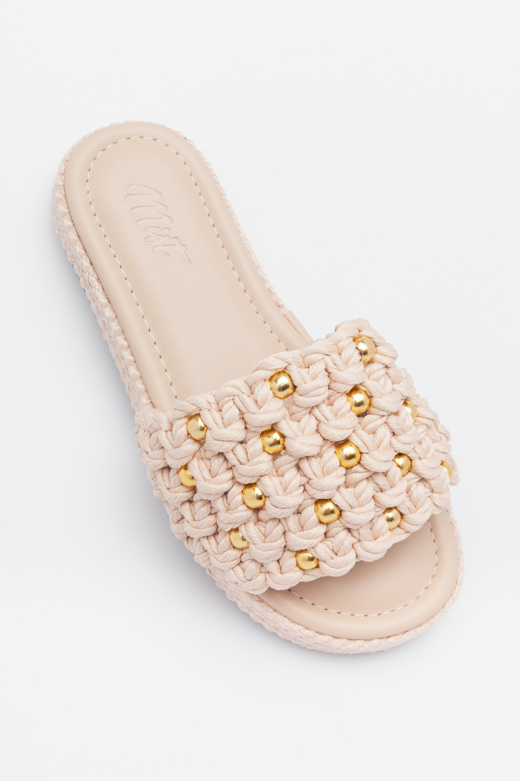 A Flat Diana Natural MIST é a rasteira que une delicadeza e sofisticação. Com design artesanal, traz uma trama em corda natural enriquecida por esferas douradas que adicionam brilho e charme ao modelo.