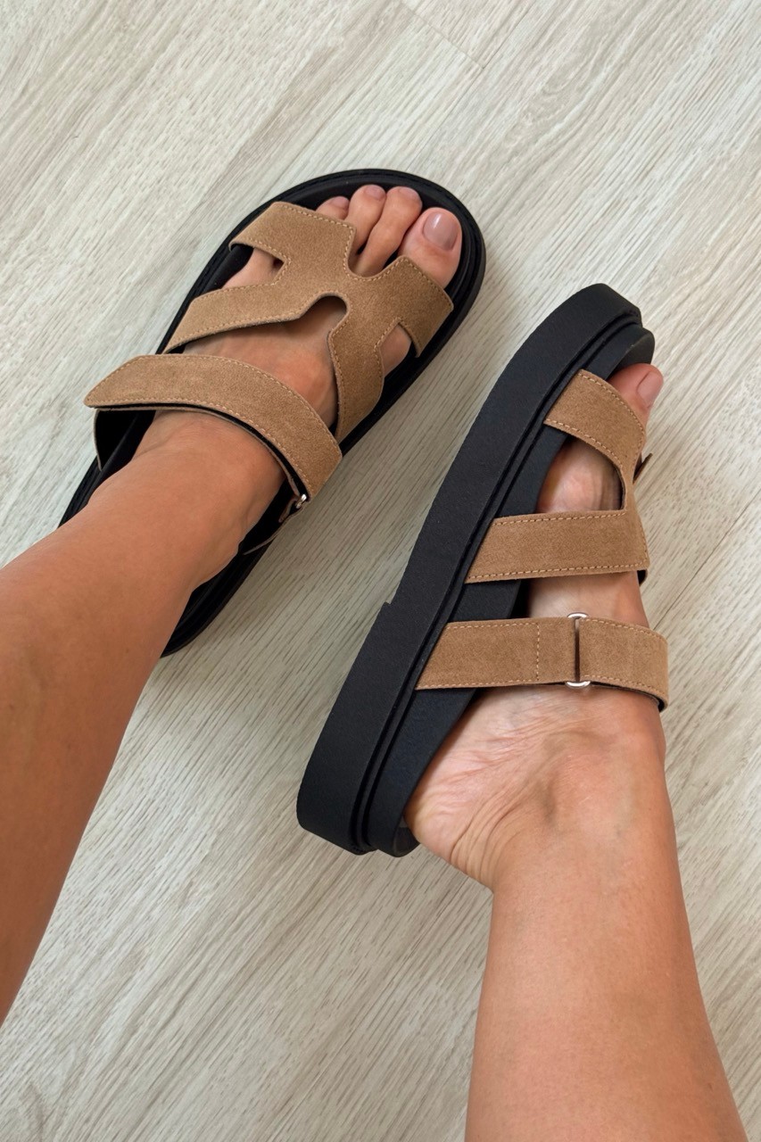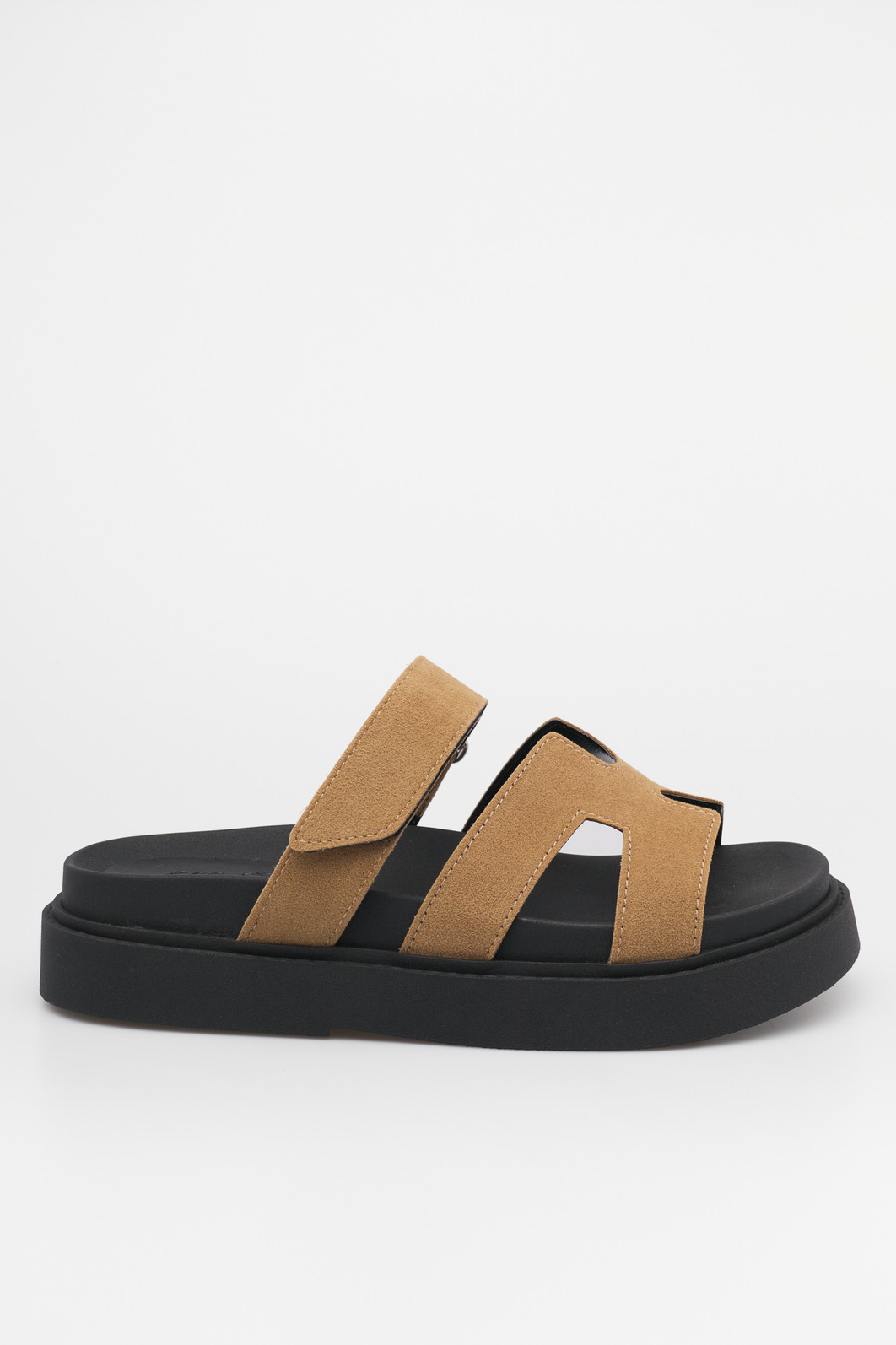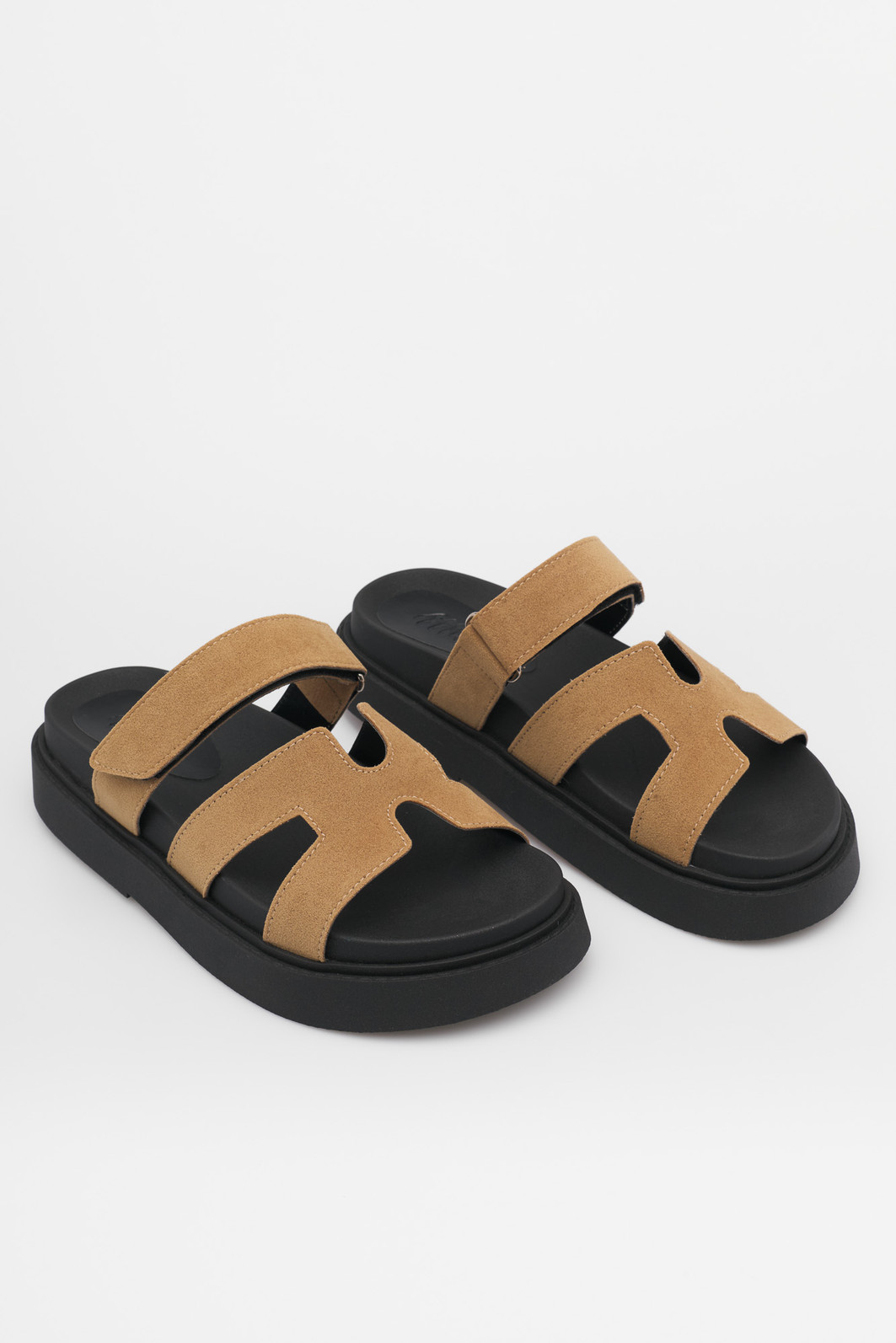 Detalhes: Tiras largas com recorte H, Sola preta contrastante