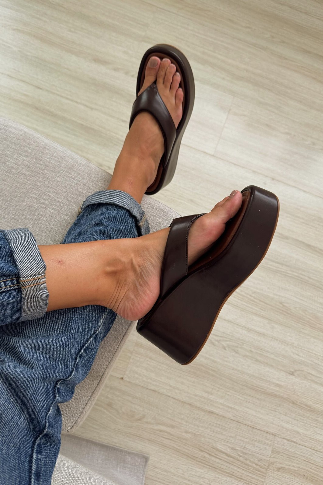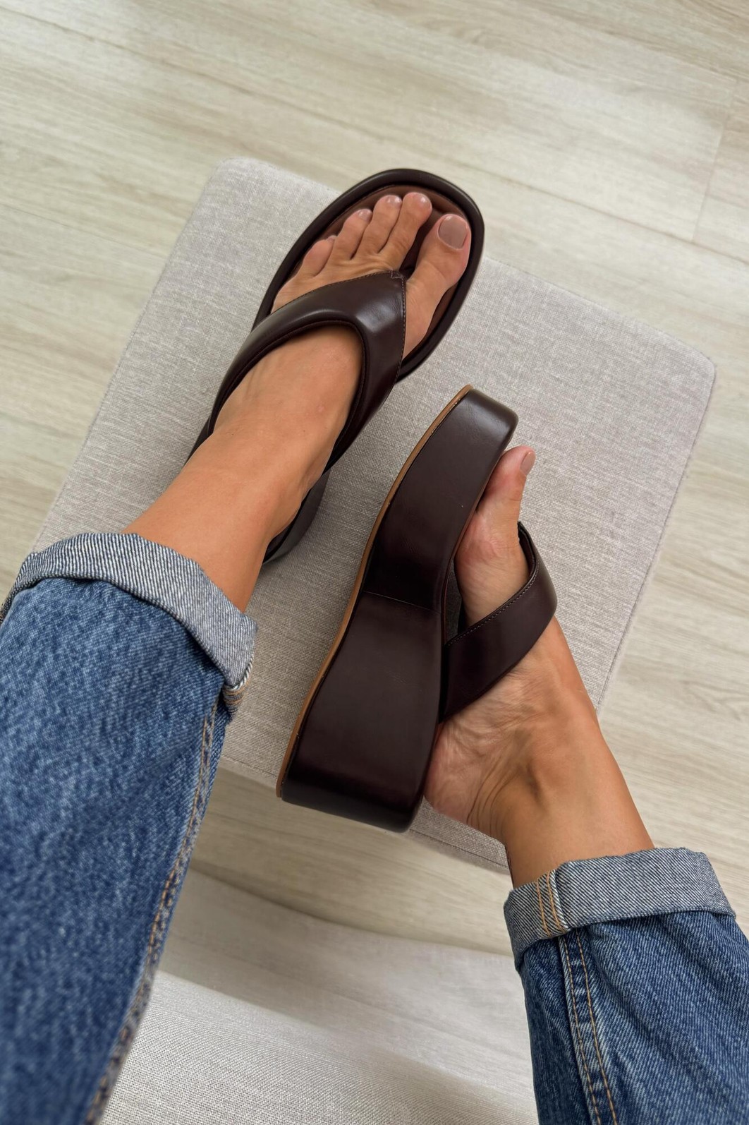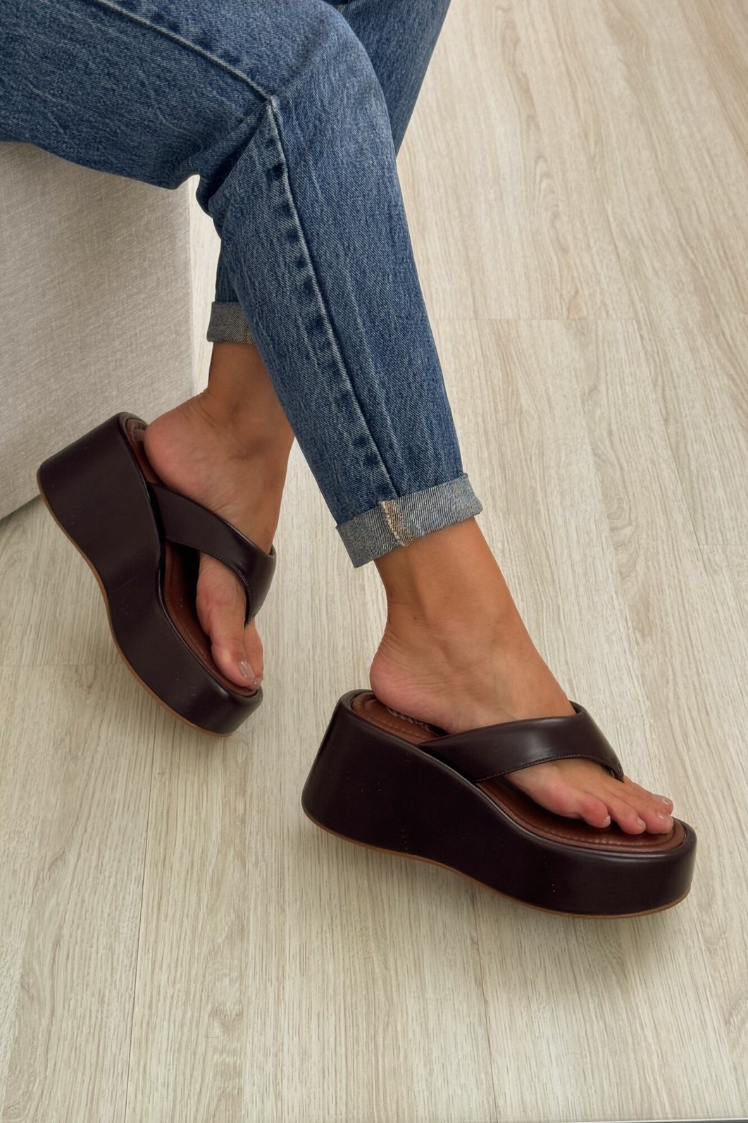 O Flat Iza Café MIST é um tamanco plataforma elegante e confortável. Com acabamento em napa sintética marrom e solado robusto, garante estabilidade e estilo em cada passo.