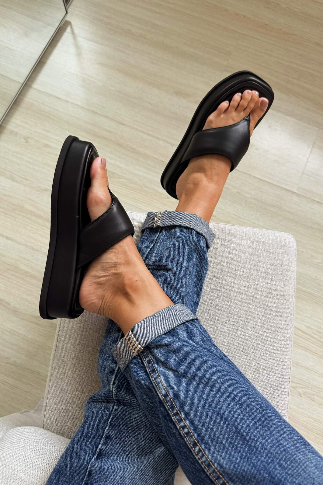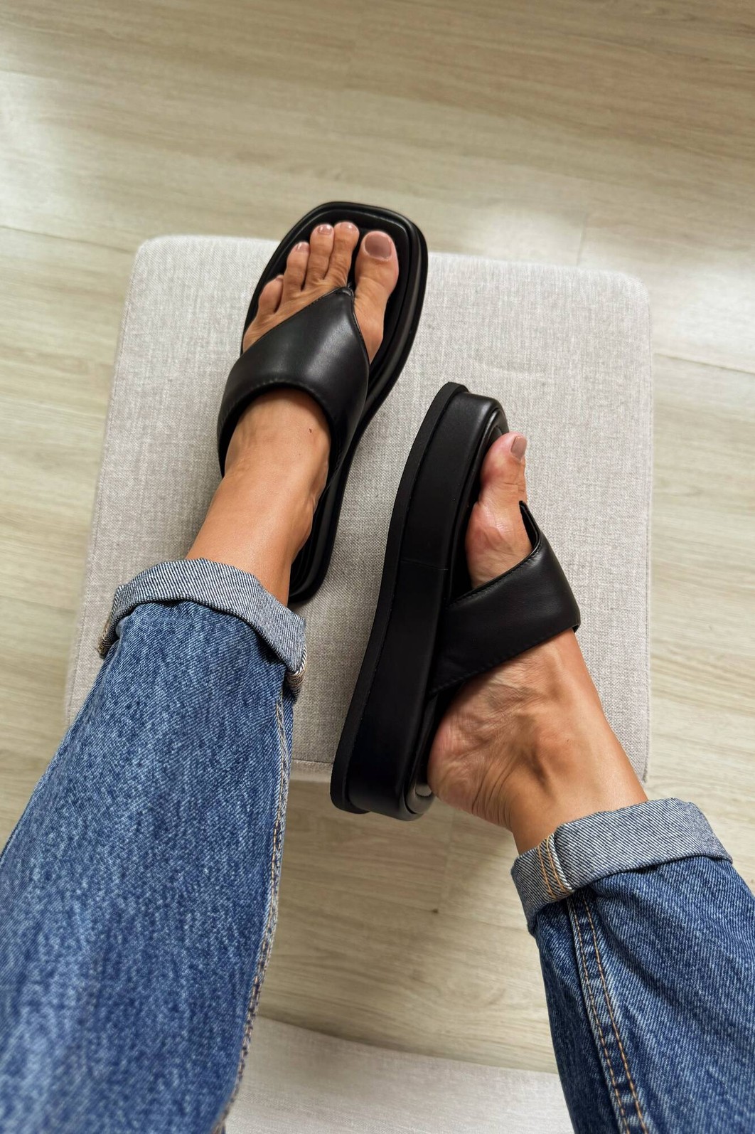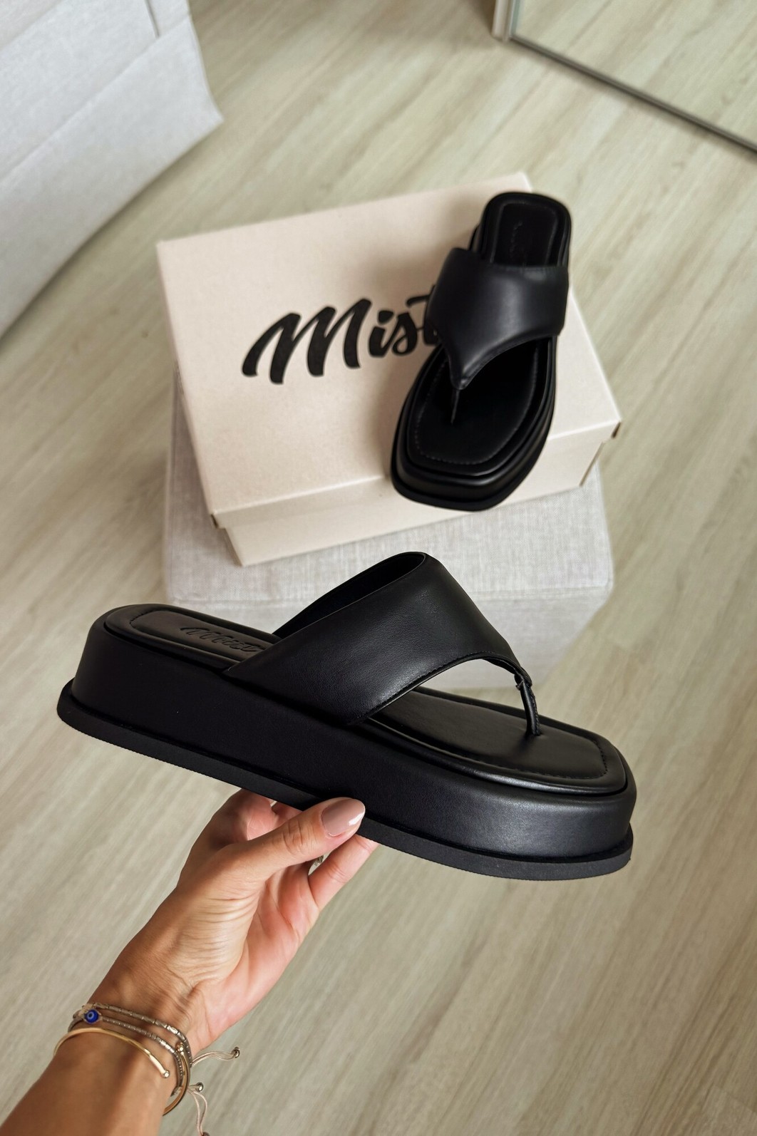 A Flat Lívia Preto MIST redefine a praticidade e elegância para o dia a dia. Com design minimalista, sua plataforma flatform proporciona elevação e conforto, enquanto a tira larga sobre o pé garante um ajuste firme e moderno.