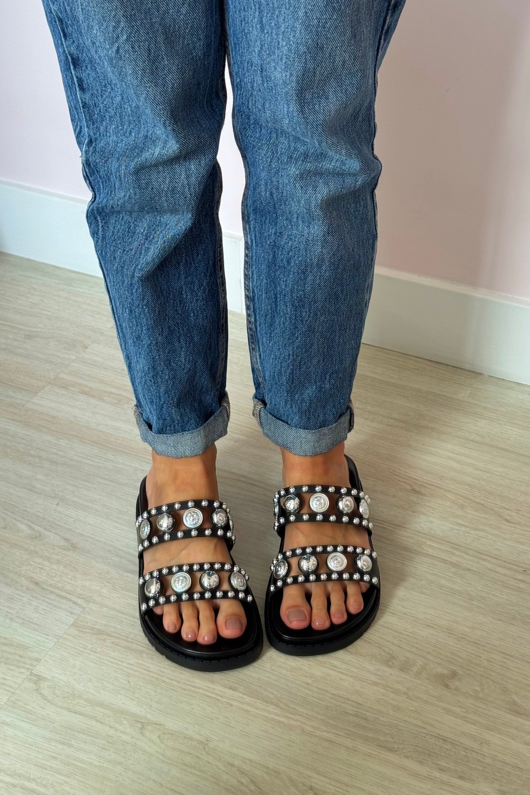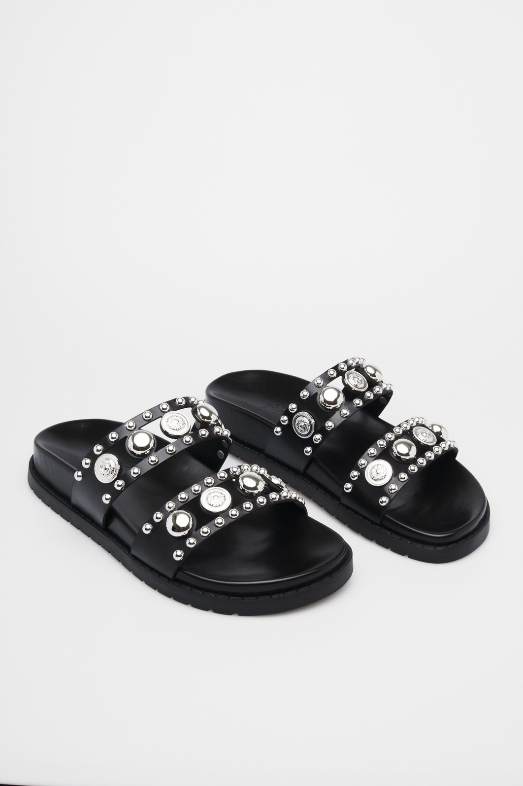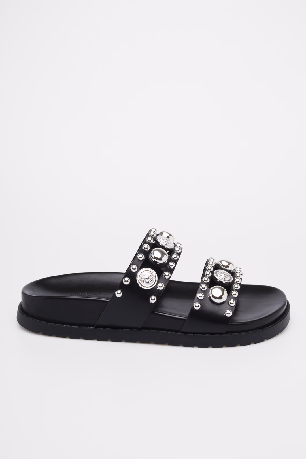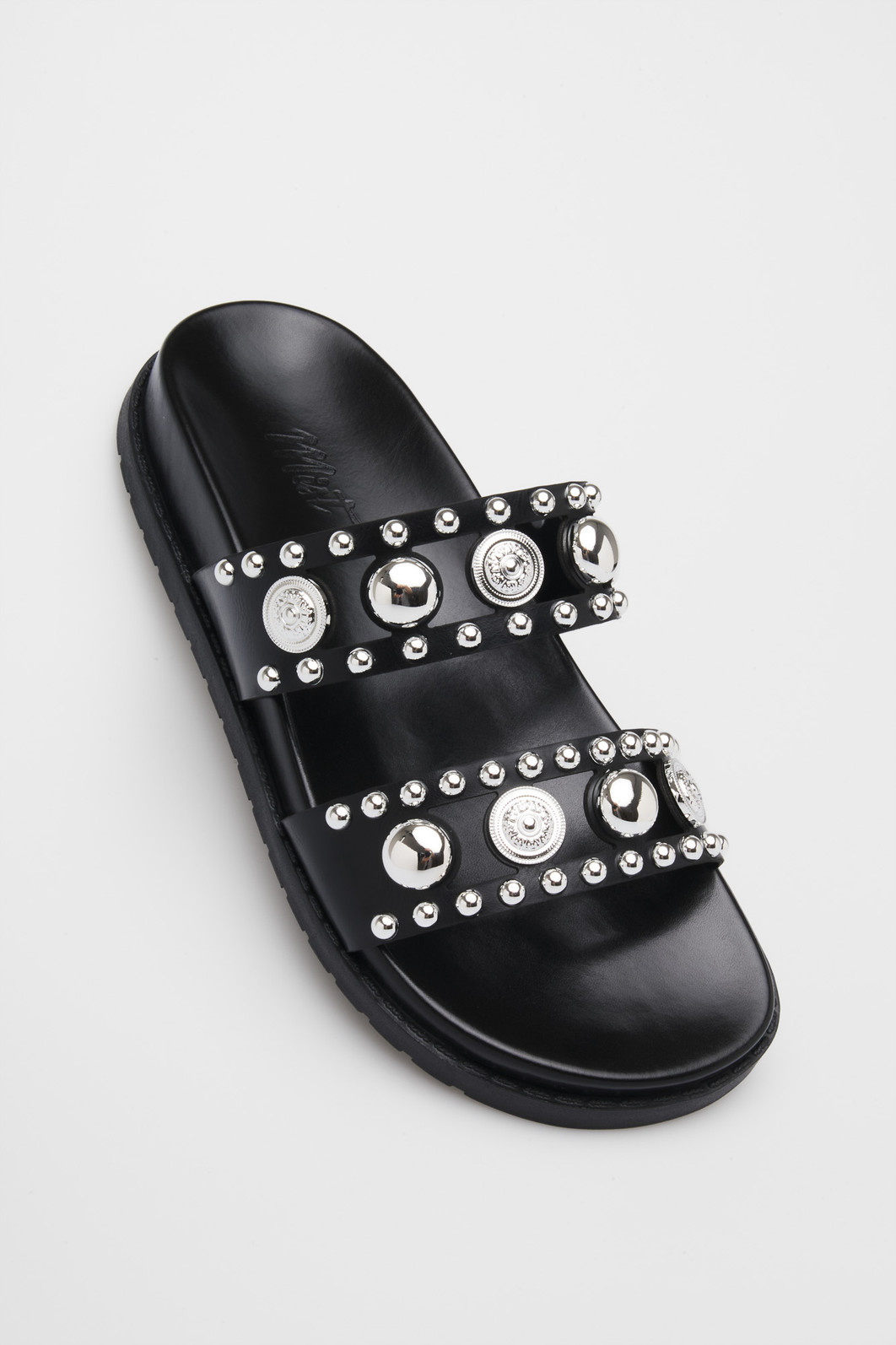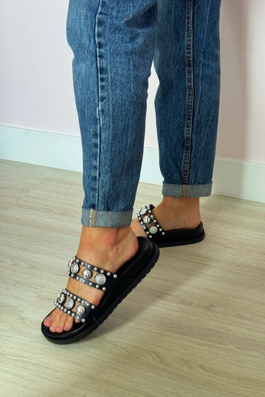 Detalhes: Tiras largas com tachas e maxi metais prateados