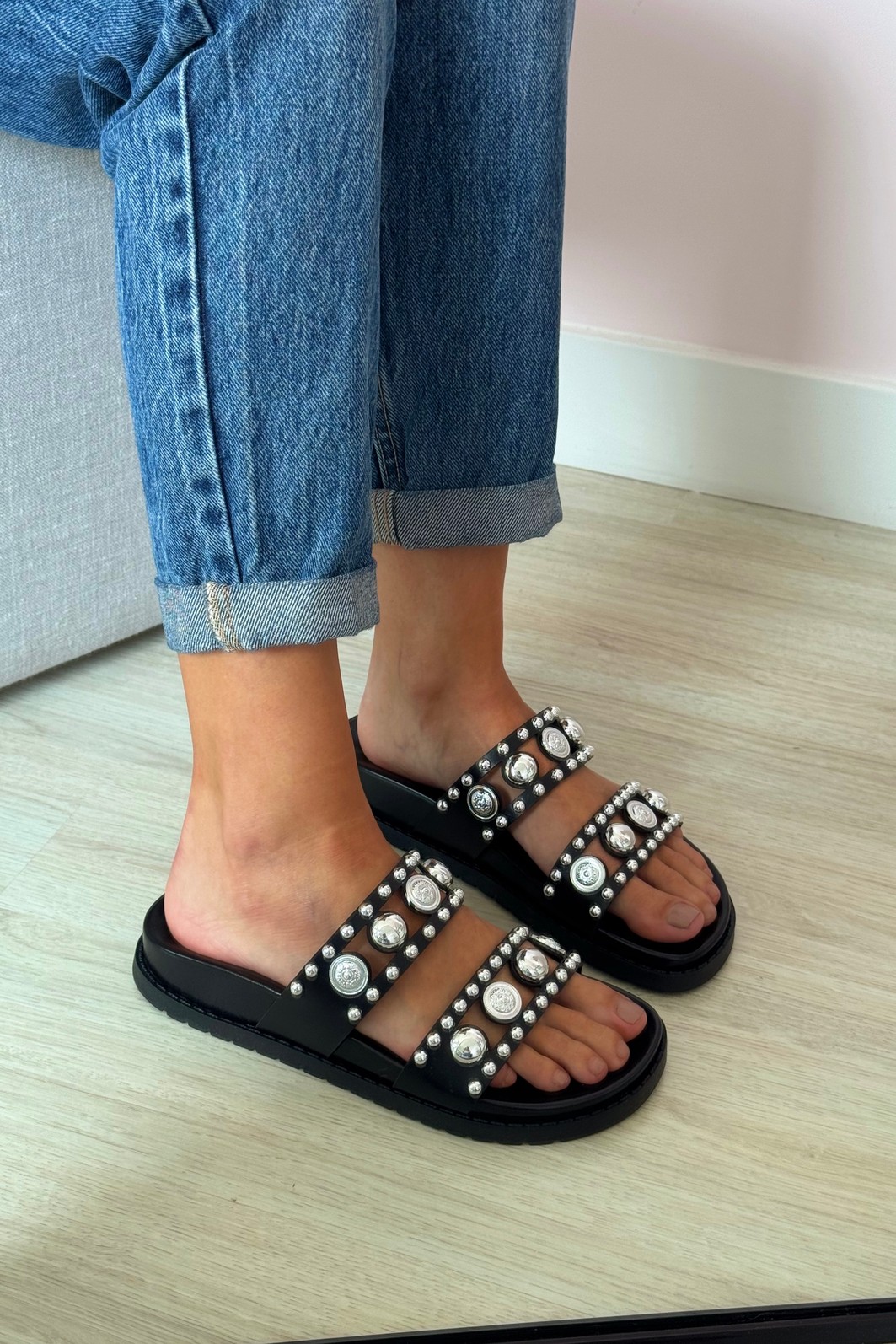 O design flat garante conforto para o dia todo. Versátil, a cor preta adiciona um toque rocker sofisticado a looks com jeans ou vestidos. Uma rasteira statement que transforma qualquer look básico em uma produção de personalidade.