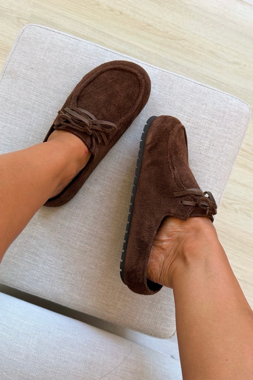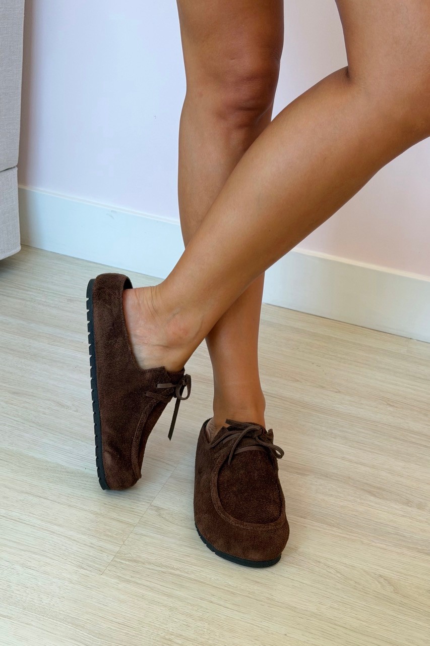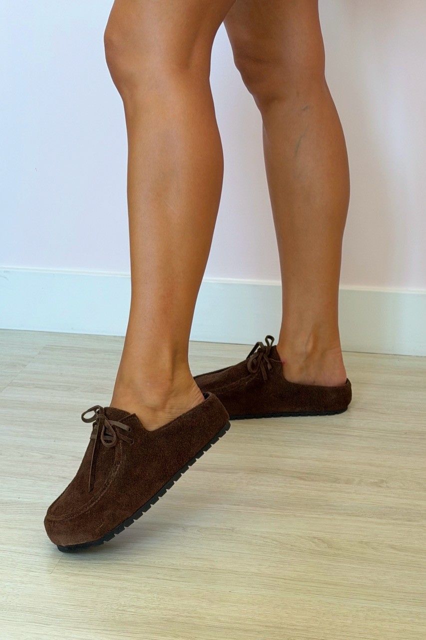 O Mule Clog Lis Marrom MIST traz o conforto da estética boho com um toque de sofisticação urbana. Confeccionado em camurça marrom café, este modelo estilo babuche destaca-se pela textura rica e pelo visual aconchegante.