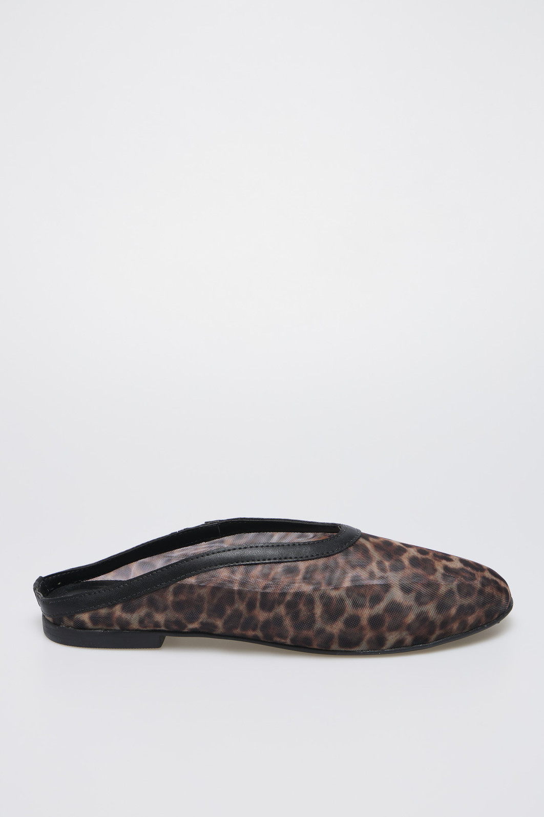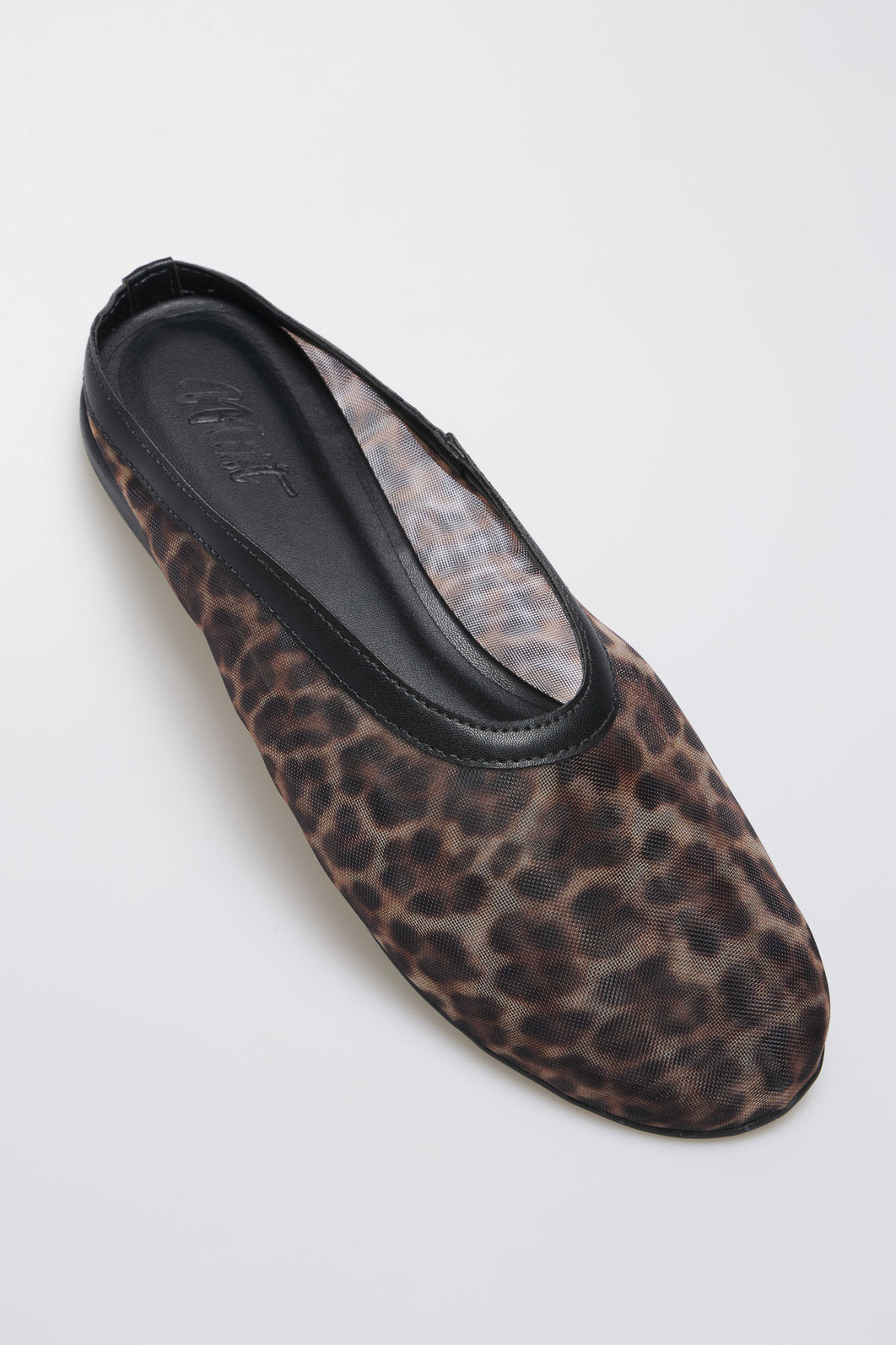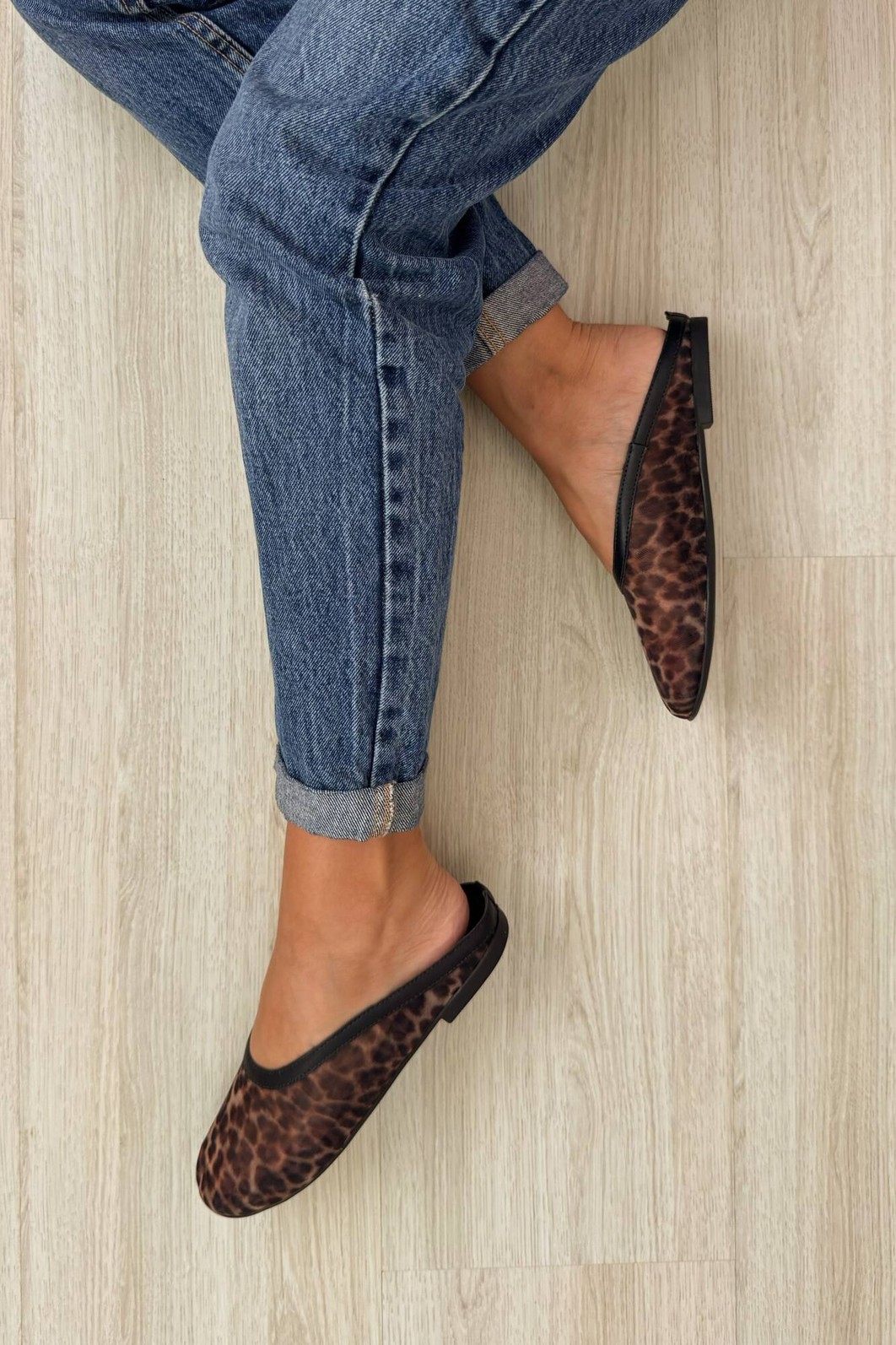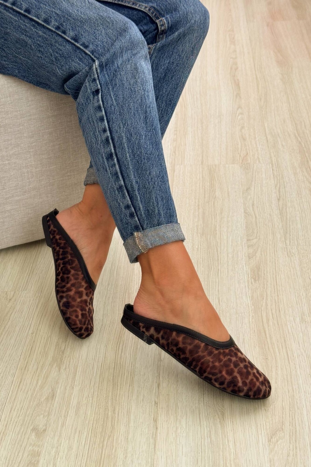 Mule feminino Elisa MIST em tecido animal print onça, acabamento em viés preto. Design flat minimalista. Conforto e estilo para looks modernos.