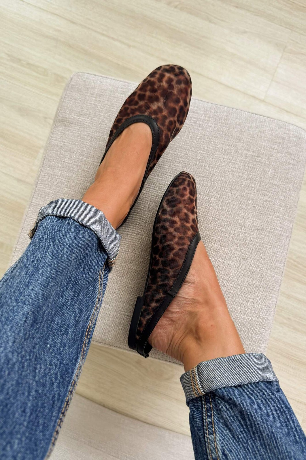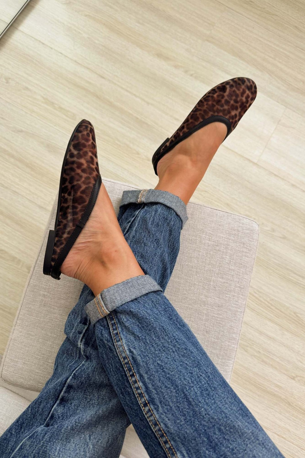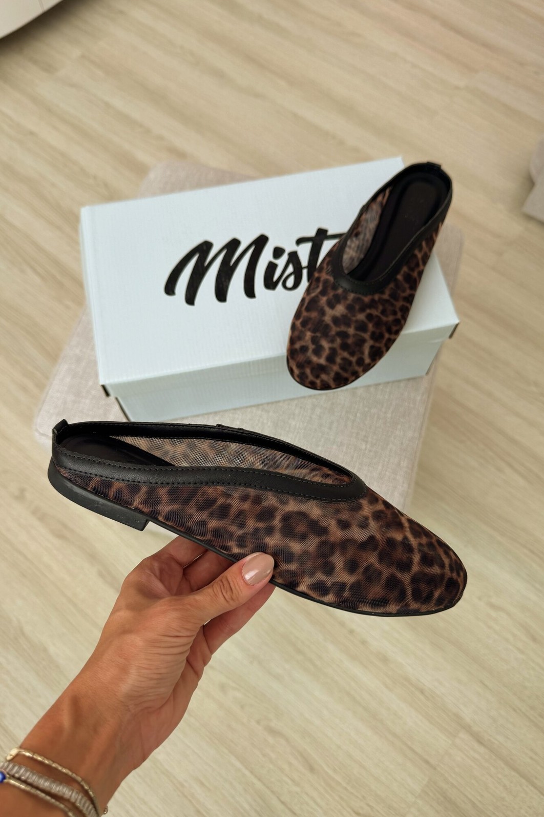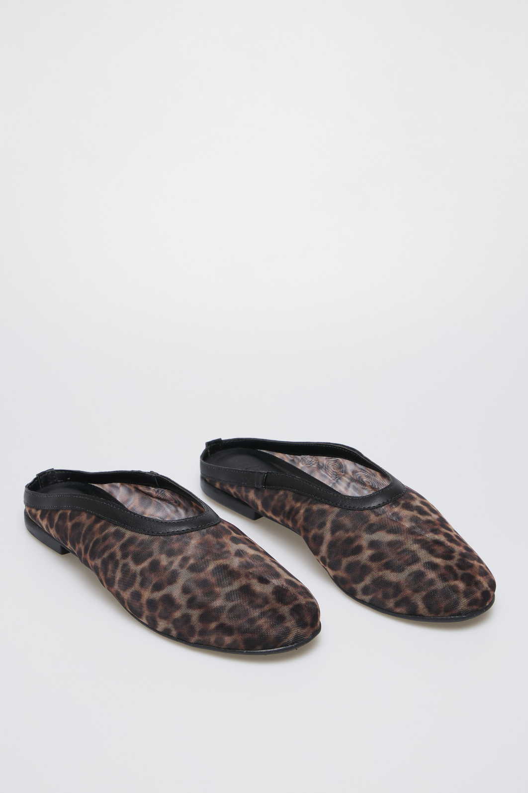 Mule feminino Elisa MIST em tecido animal print onça, acabamento em viés preto. Design flat minimalista. Conforto e estilo para looks modernos.