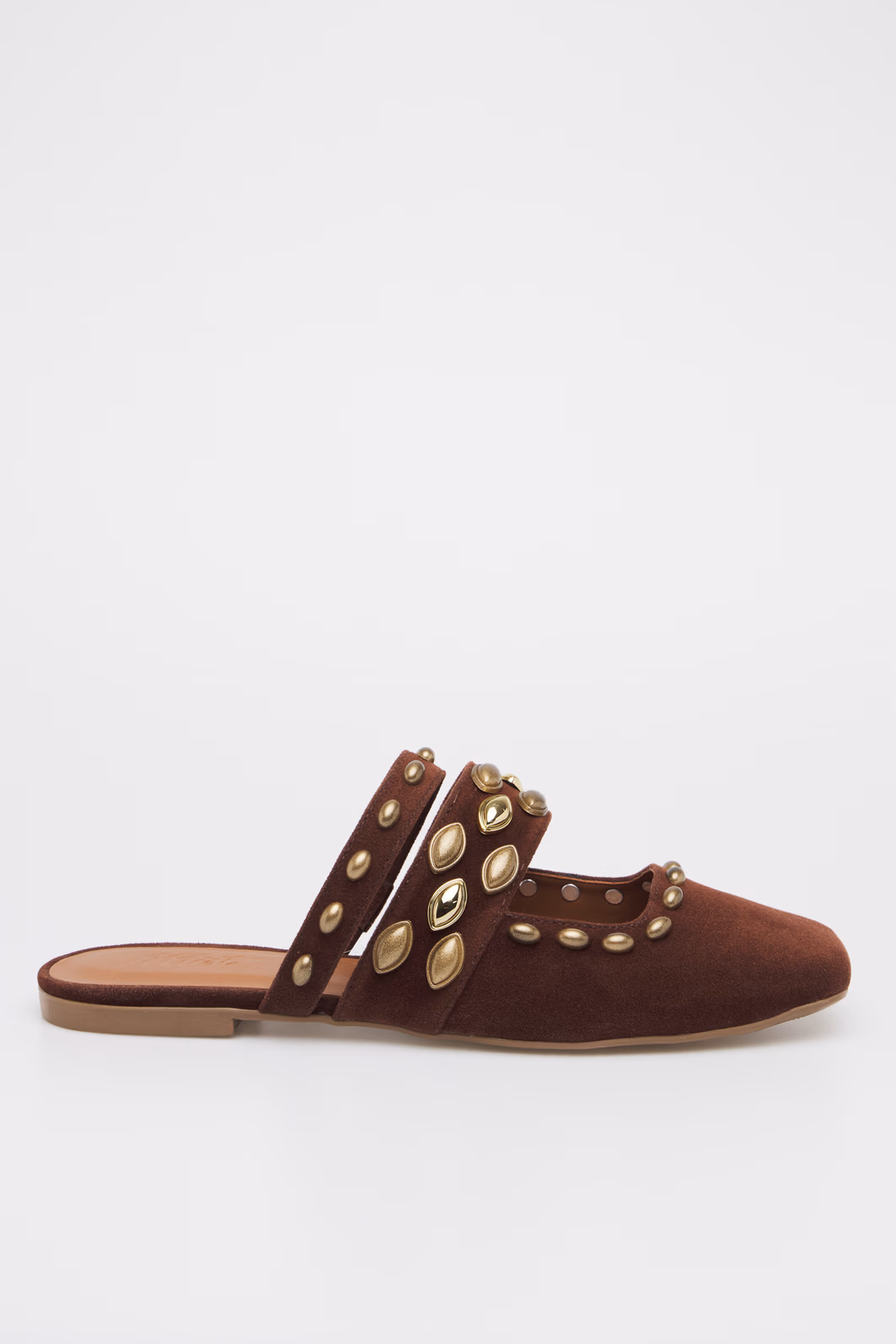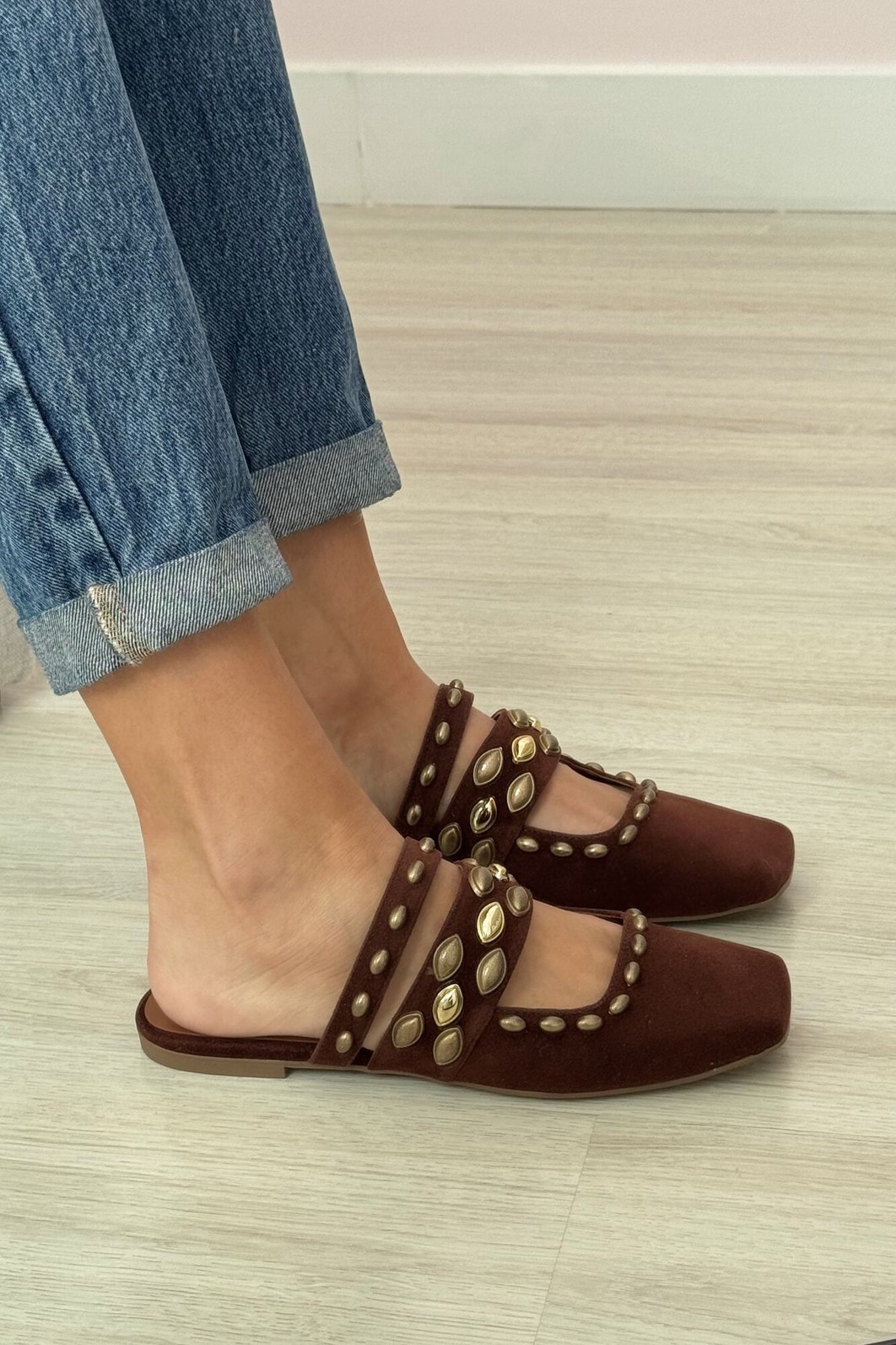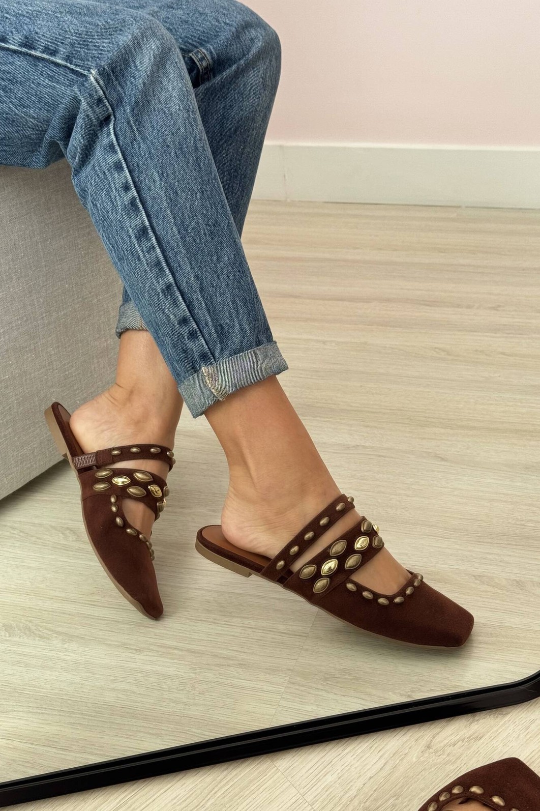A Mule Esther Marrom MIST é a prova de que praticidade e estilo podem andar juntos. Com design contemporâneo de bico quadrado, seu diferencial é a aplicação de um mix de tachas e studs em metal ouro velho, adicionando uma estética folk sofisticada.