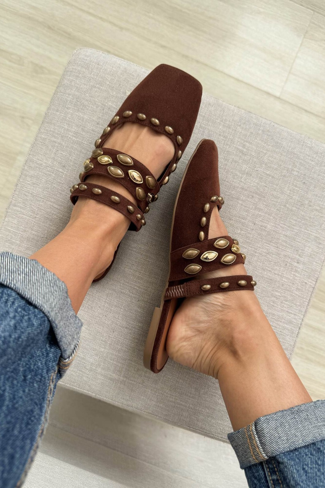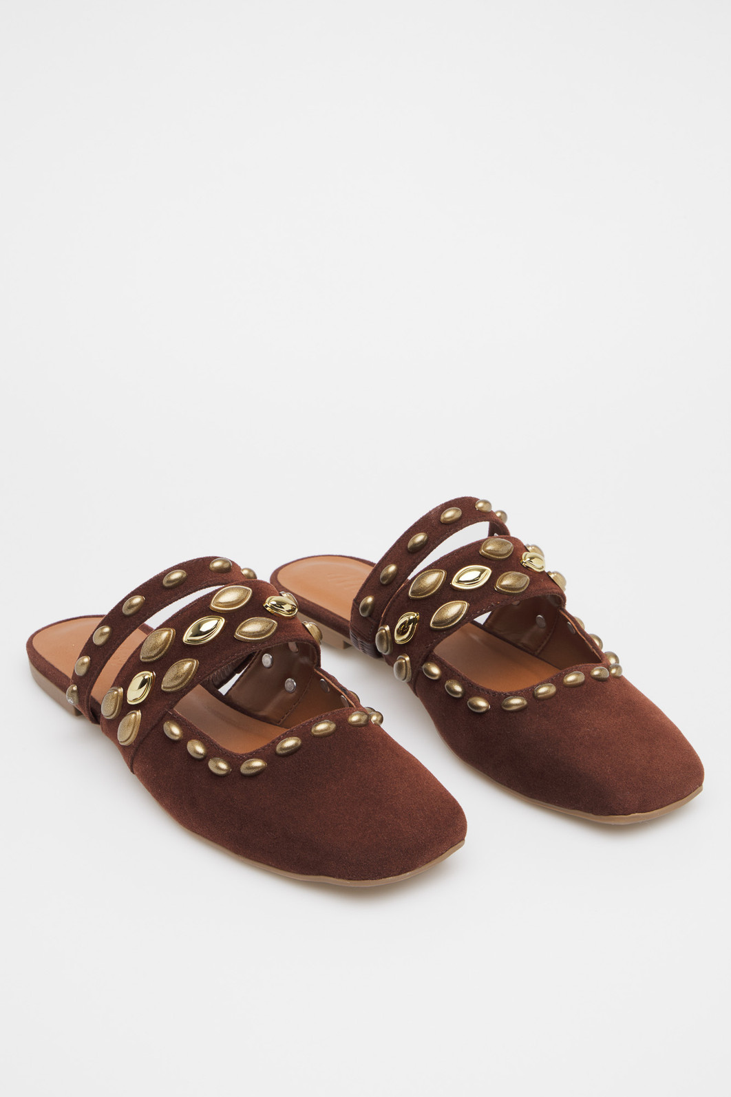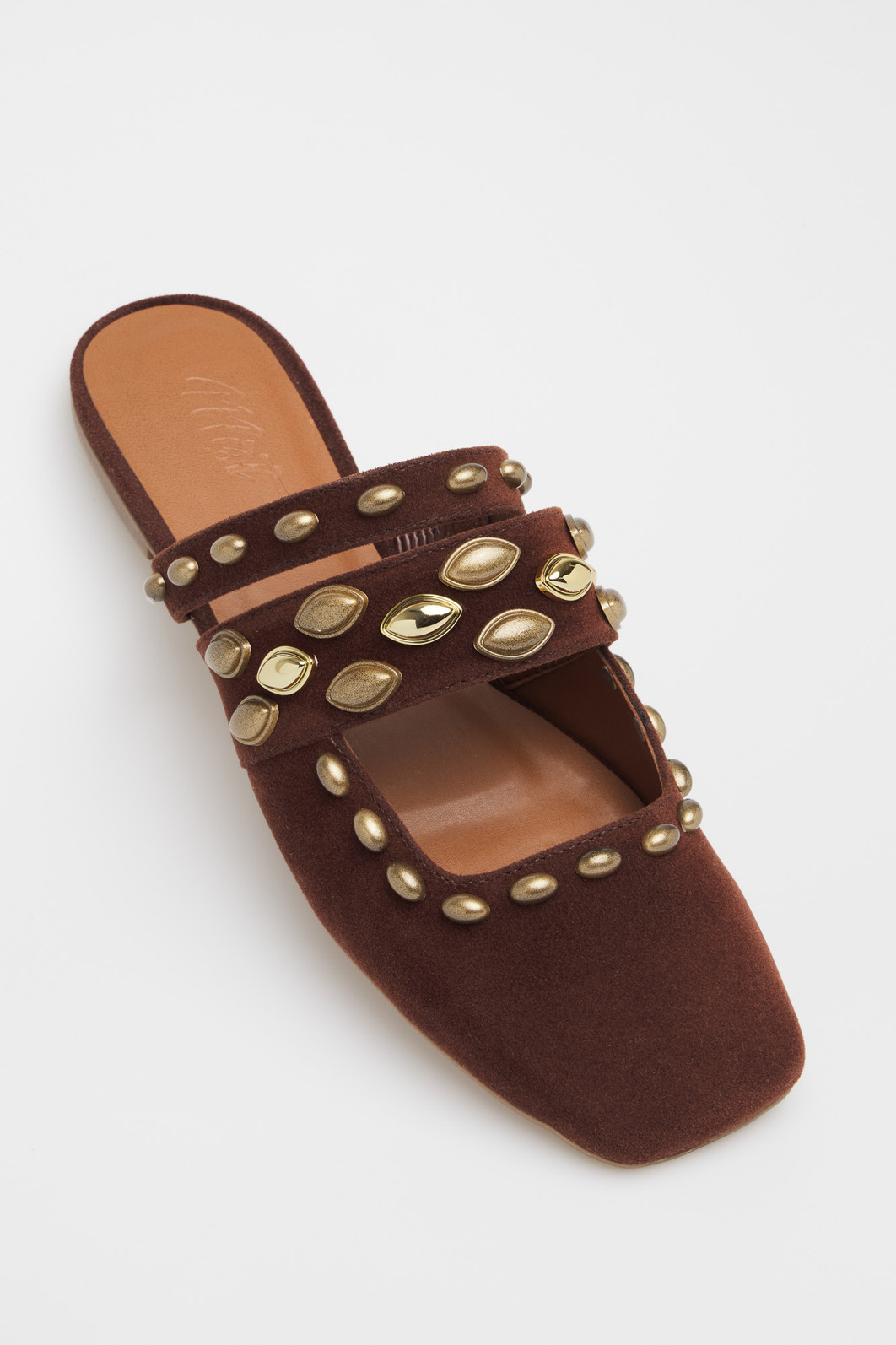 A Mule Esther Marrom MIST é a prova de que praticidade e estilo podem andar juntos. Com design contemporâneo de bico quadrado, seu diferencial é a aplicação de um mix de tachas e studs em metal ouro velho, adicionando uma estética folk sofisticada.