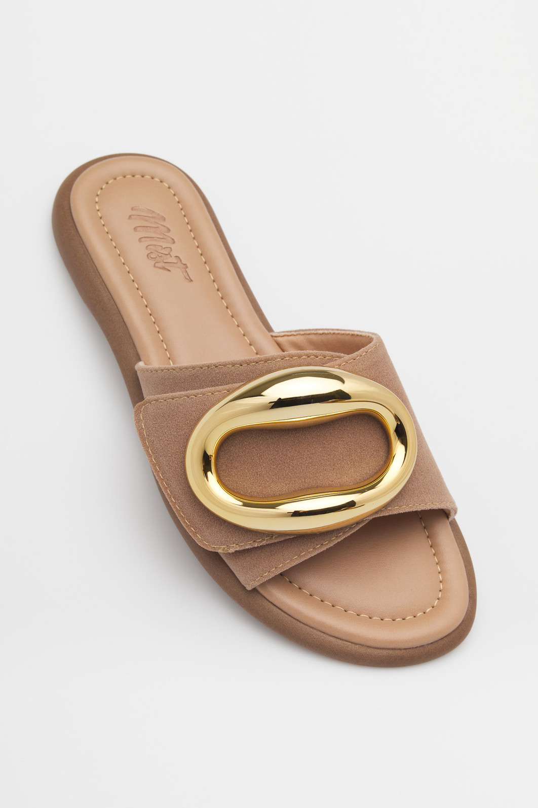 A Rasteira Martina Areia MIST é sinônimo de elegância descomplicada. Com design tipo slide, o modelo apresenta uma maxi fivela dourada escultural, adicionando um toque de brilho e sofisticação ao acabamento em camurça suave.