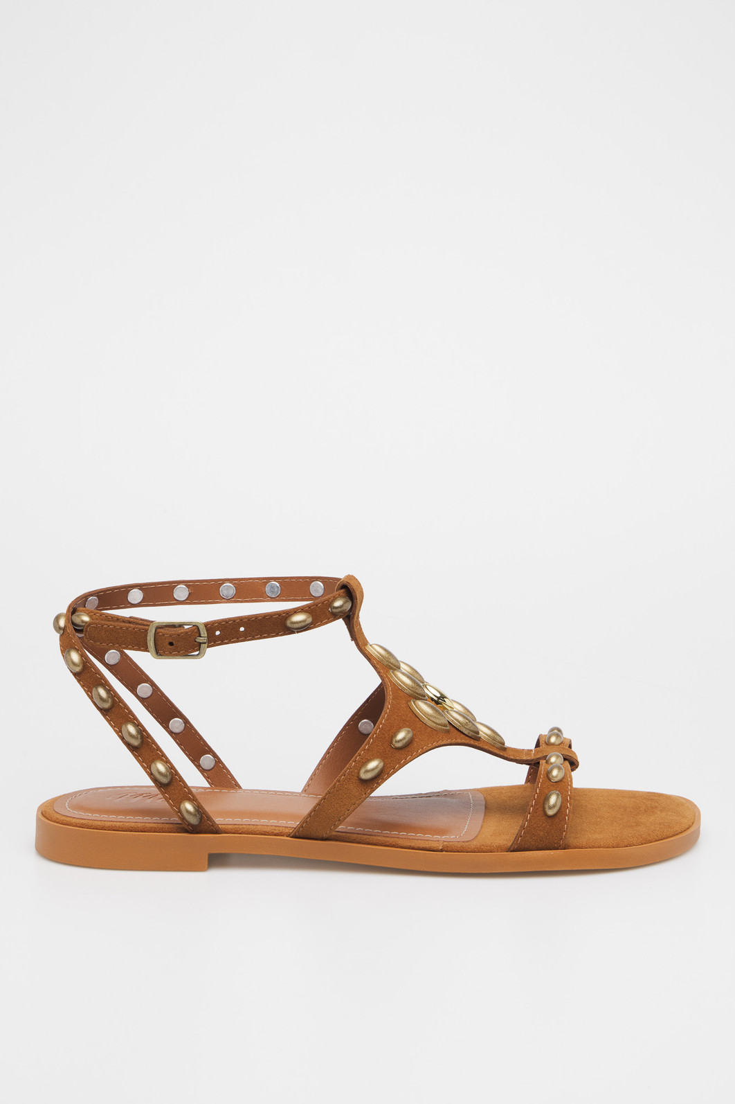 Com tiras em camurça camel adornadas por tachas e studs em ouro velho, o modelo traduz atitude folk com elegância boho-chic. Versátil, vai do jeans e t-shirt aos vestidos fluidos e saias midi, tornando-se uma peça-chave no guarda-roupa feminino.