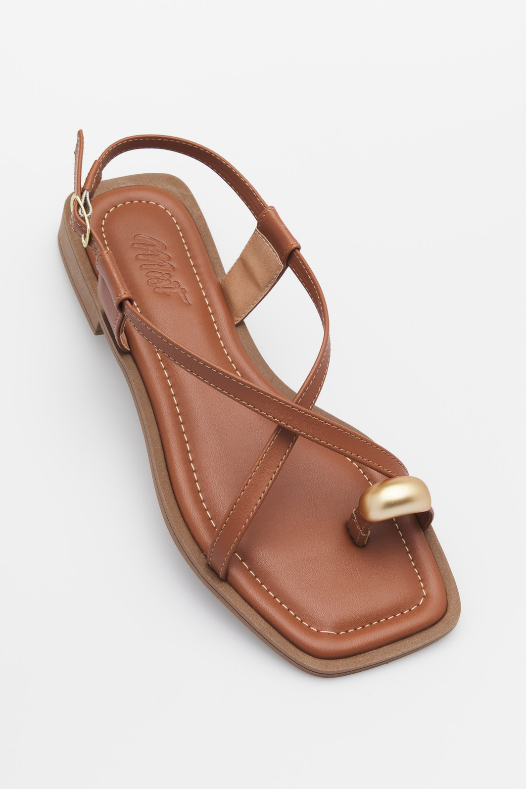 A Sandália Brisa Caramelo MIST une o minimalismo contemporâneo e o toque fashion dos detalhes dourados. Seu design com tiras finas cruzadas e o aplique metálico no dedo criam uma estética delicada que transforma o básico em um statement de estilo.