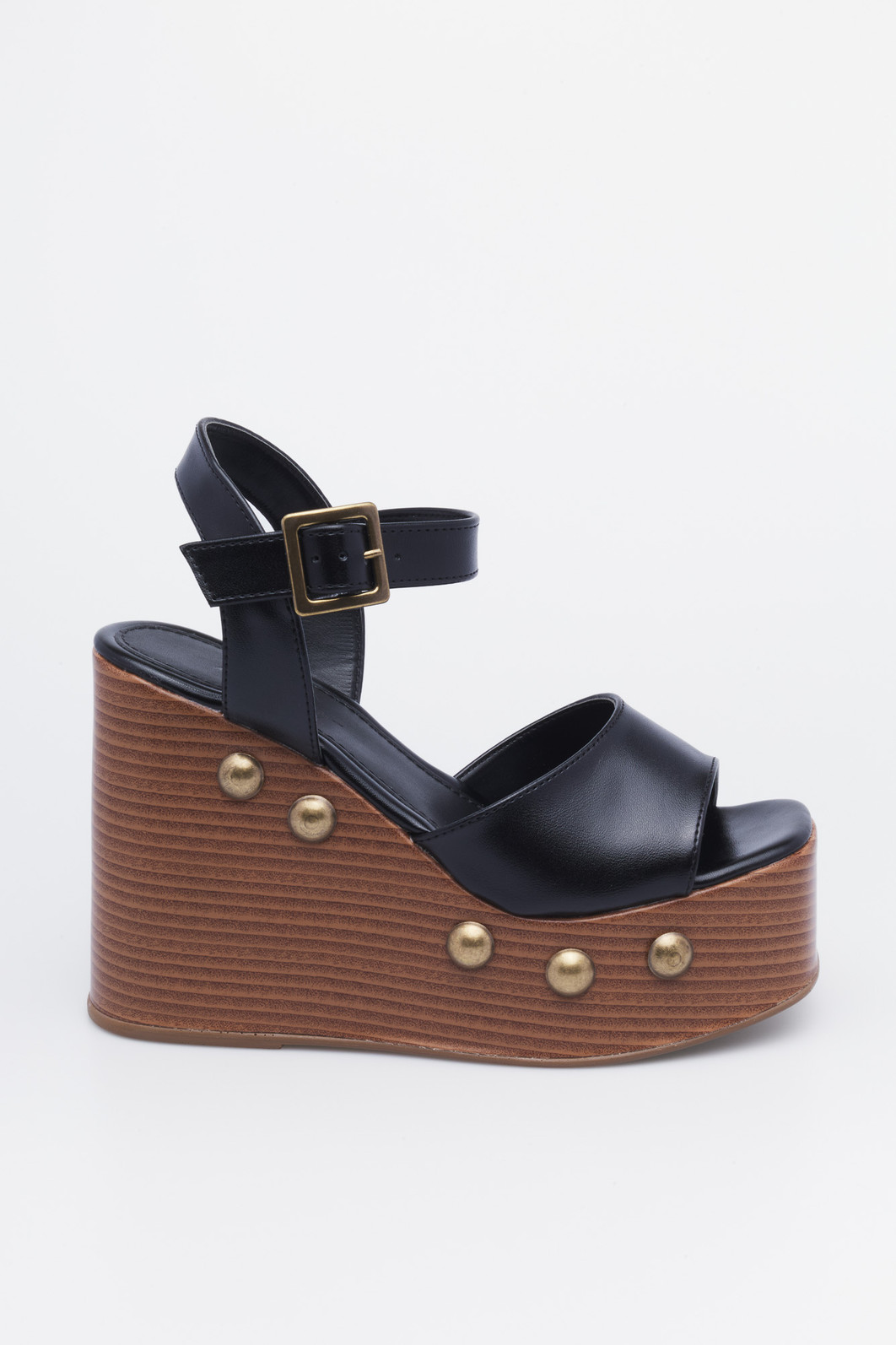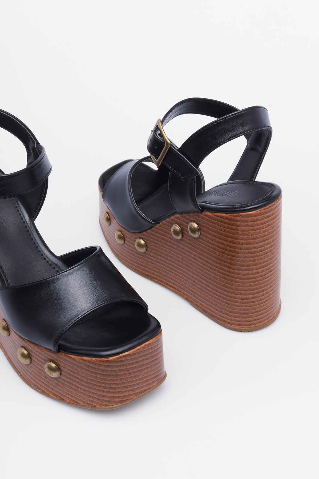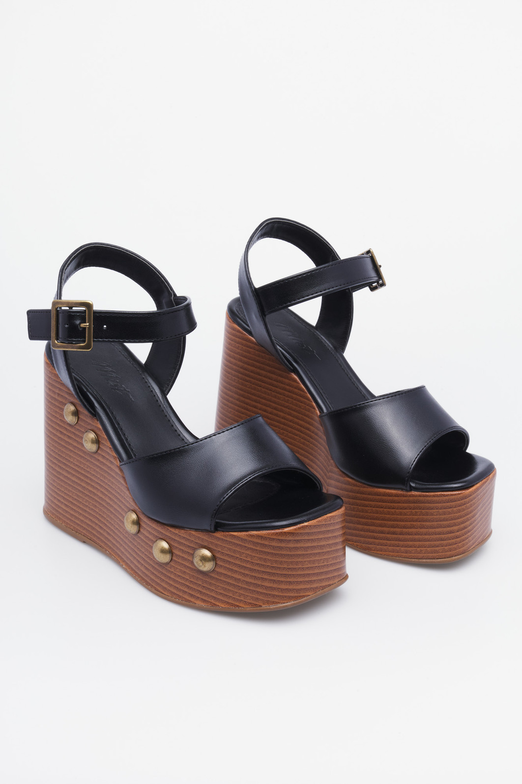 A Sandália Anabela Dalva Preta MIST é a peça perfeita para quem ama altura com conforto e um toque vintage. Seu design imponente combina o salto plataforma em tom amadeirado com tachinhas douradas, criando um visual retrô sofisticado.