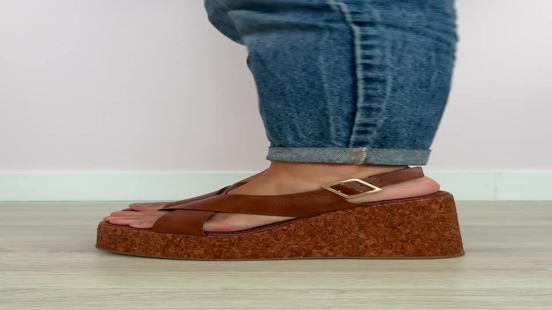 Detalhes: Plataforma revestida em cortiça, Tiras largas macias, Fivela ajustável no tornozelo