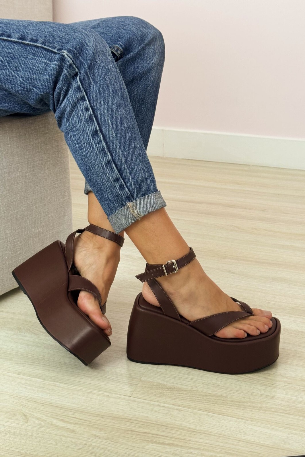 A Sandália Lola Marrom MIST é a combinação perfeita de impacto e sofisticação. Sua plataforma robusta de 10 cm adiciona altura e estilo, enquanto o design de dedo garante modernidade.