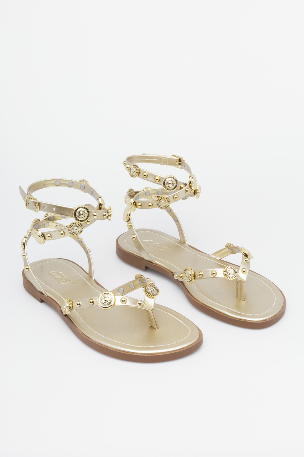 Detalhes: Aplicações metálicas douradas, Tiras delicadas, Estilo gladiador