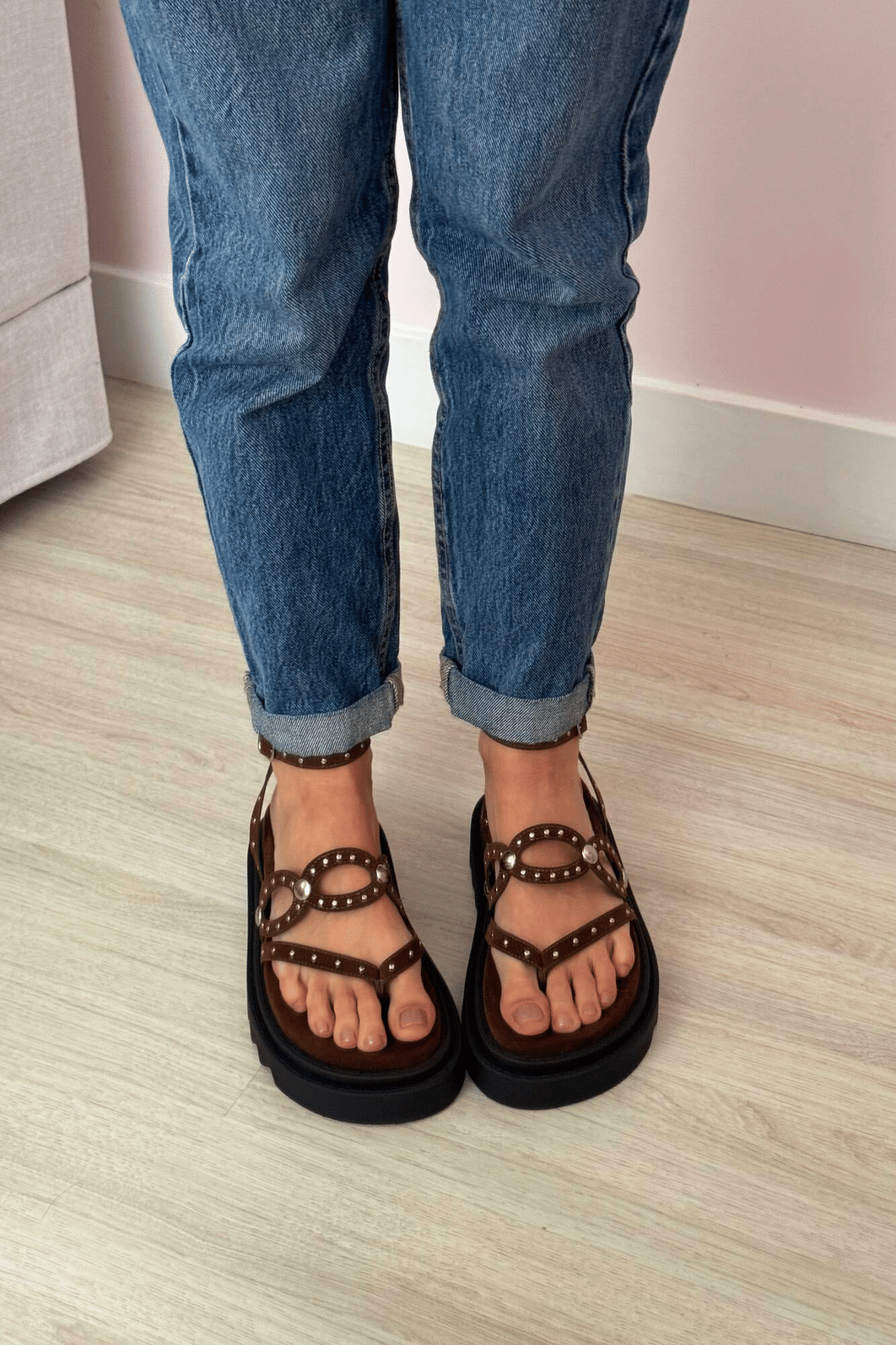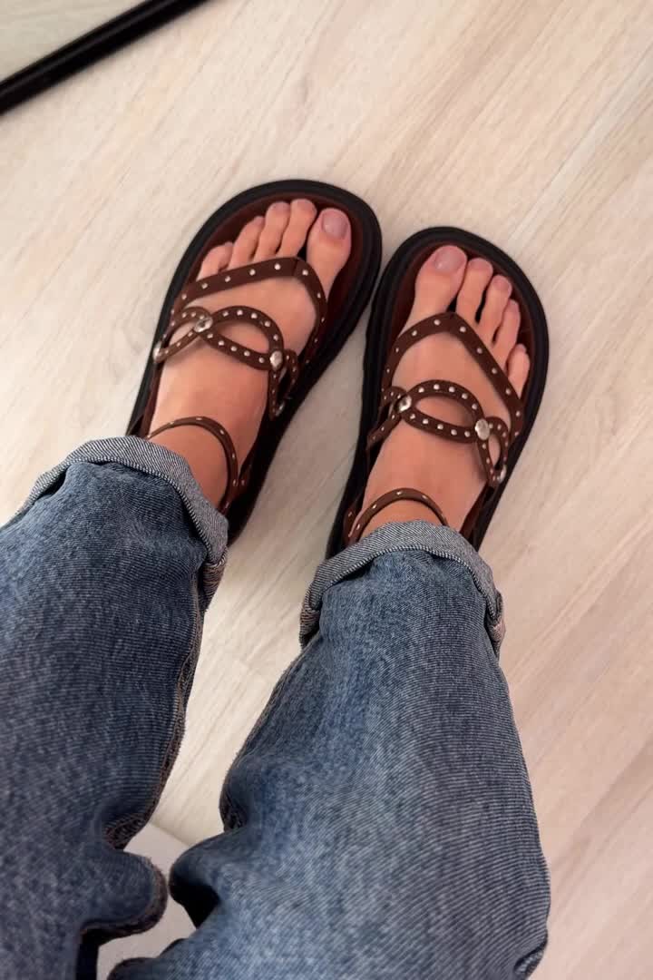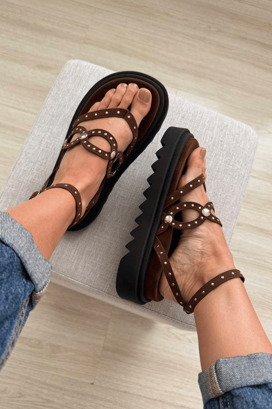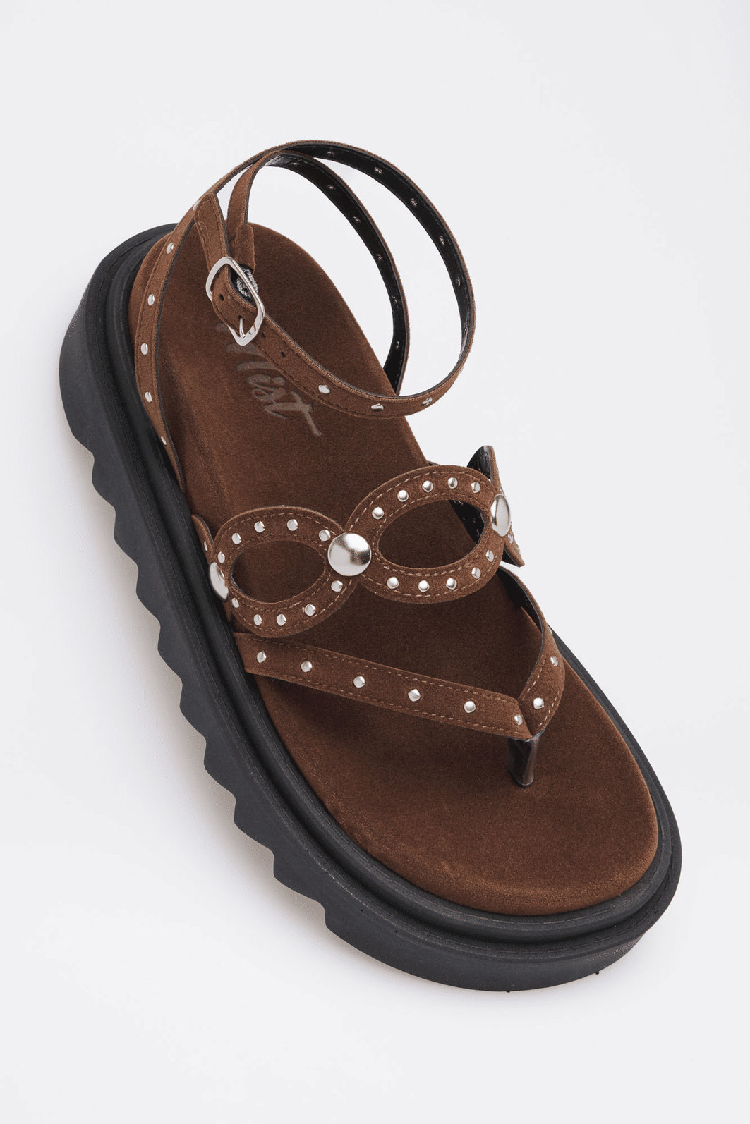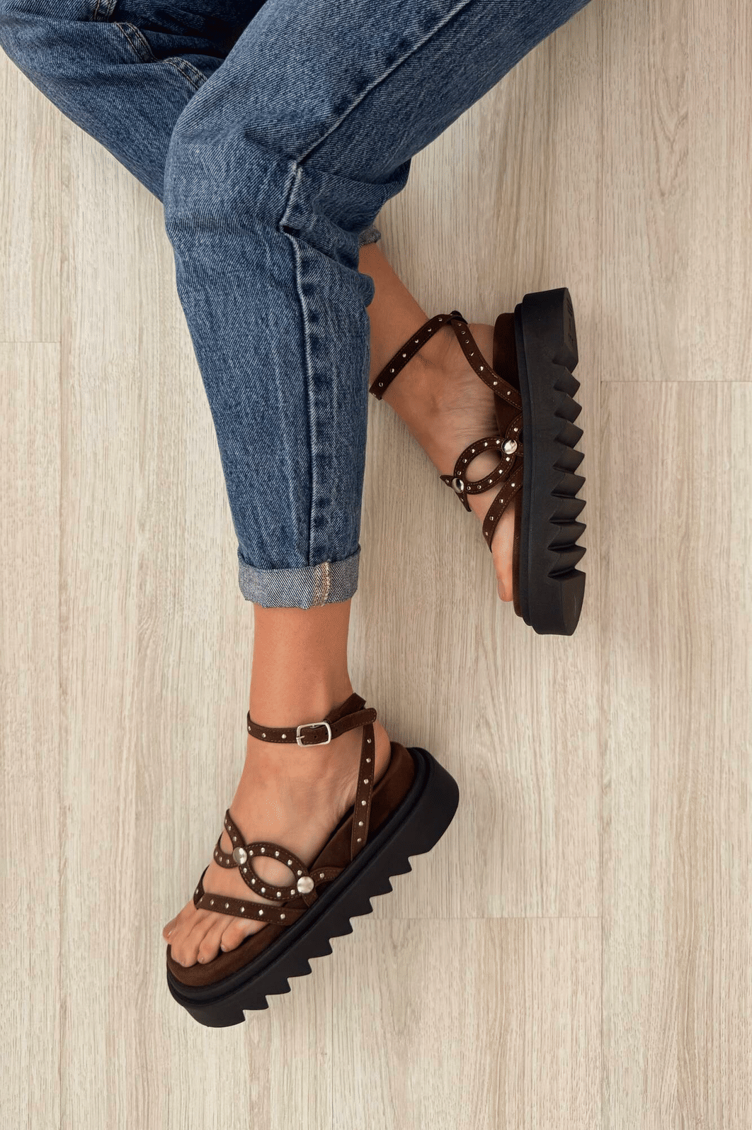A Sandália Matilda Marrom MIST é a fusão ideal entre design robusto e moderno. Com solado plataforma tratorado e tiras delicadas com rebites prateados, este modelo oferece um visual marcante e cheio de atitude para quem não tem medo de se destacar.