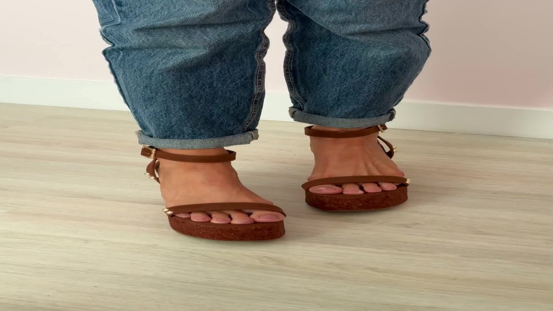 A Sandália Natália Caramelo MIST é a peça essencial que redefine o estilo e o conforto para o verão. Sua plataforma robusta, revestida em cortiça natural, confere um charme orgânico, enquanto as tiras delicadas são adornadas com rebites dourados.
