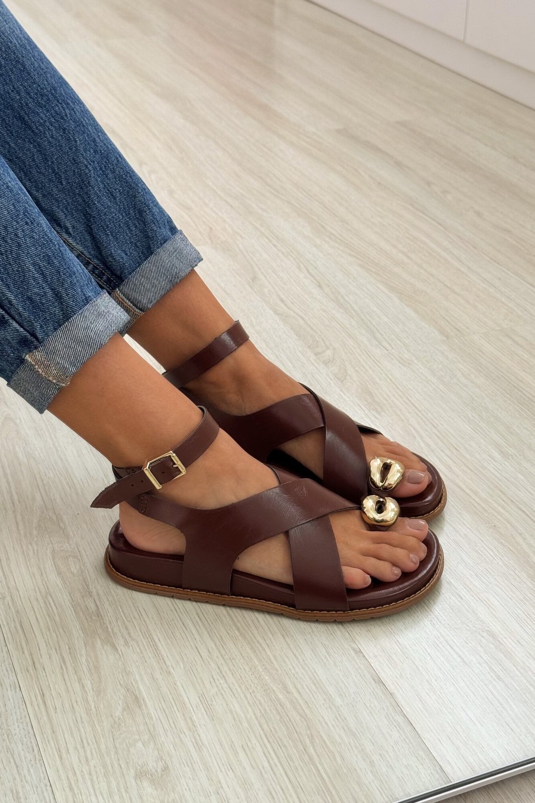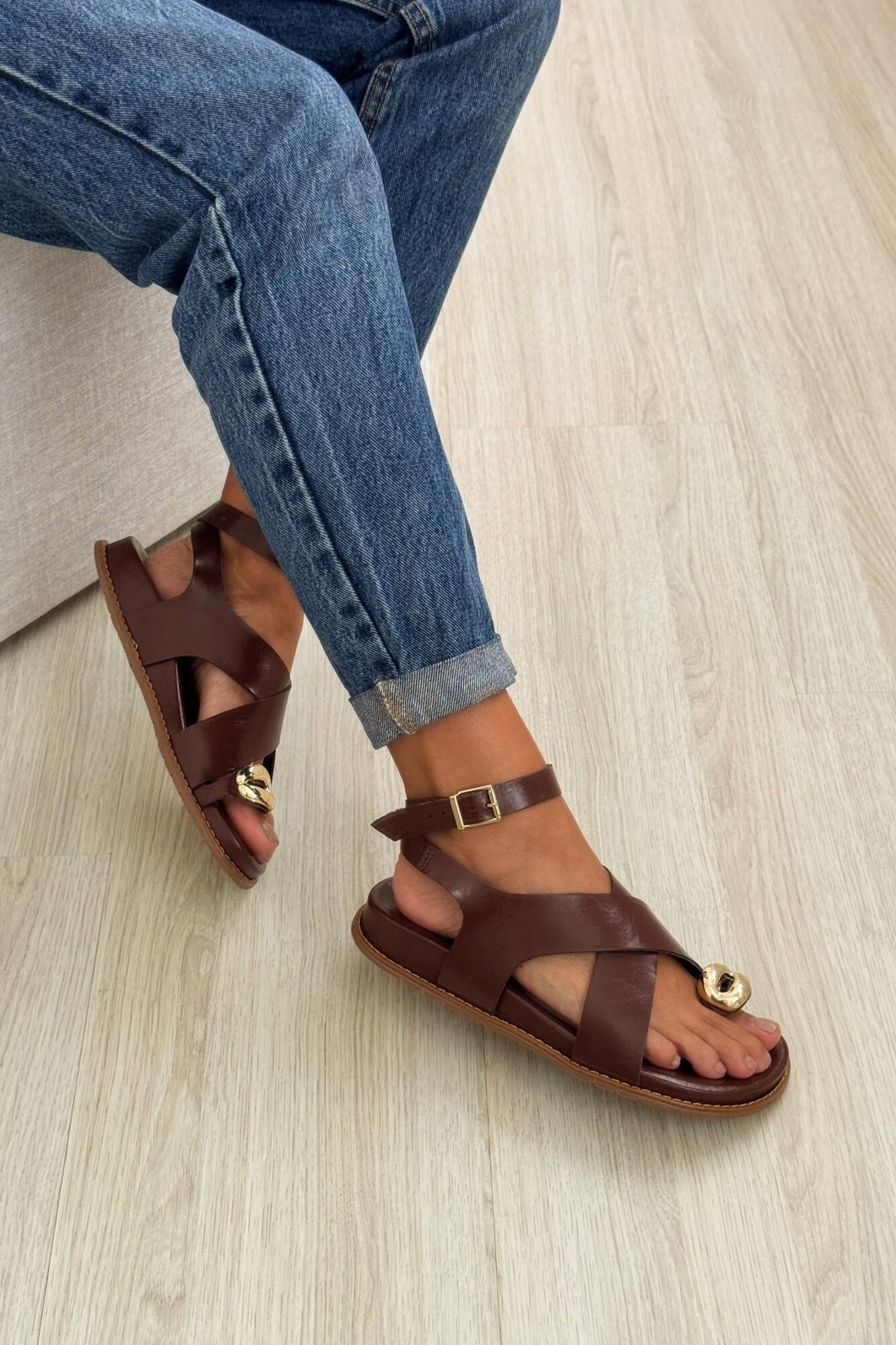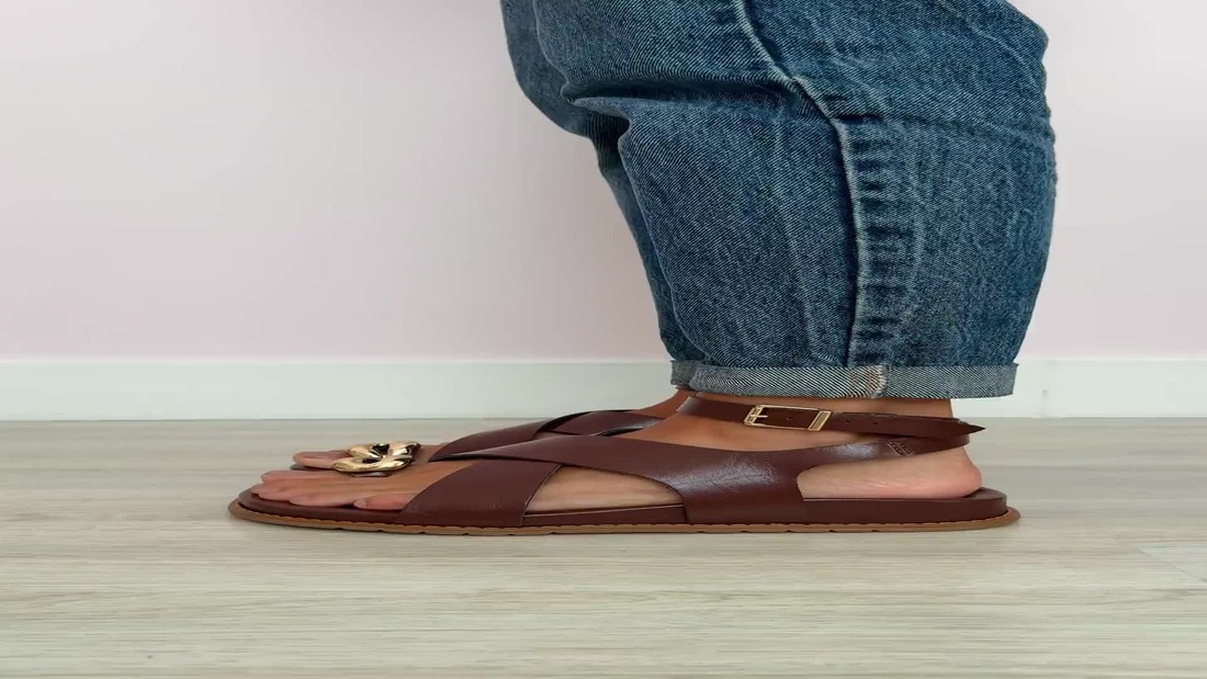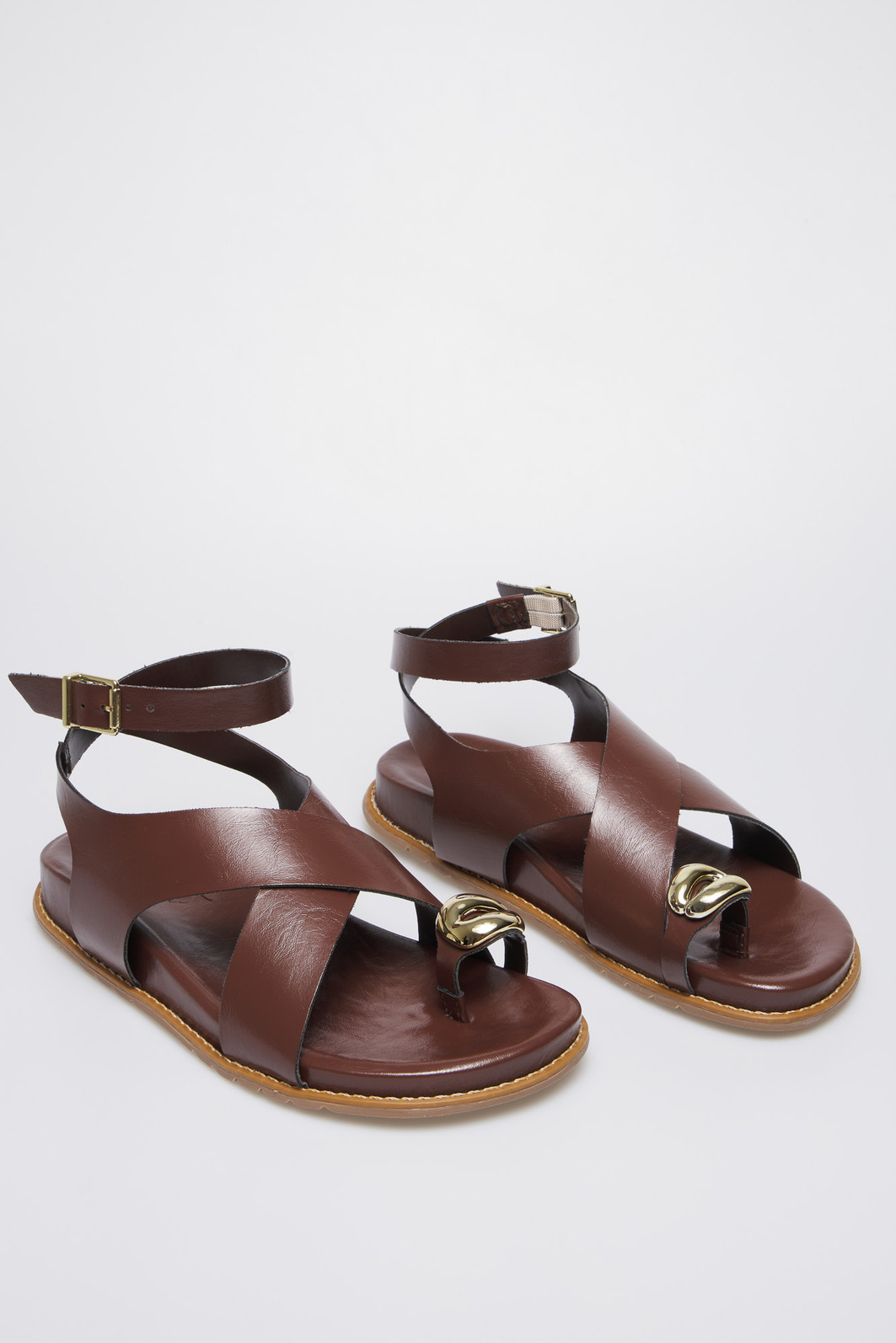 A Sandália Poly Terra MIST combina elegância e conforto em um design versátil e atemporal. Suas tiras cruzadas em napa marrom, junto ao detalhe dourado e à fivela ajustável, garantem segurança e estilo.