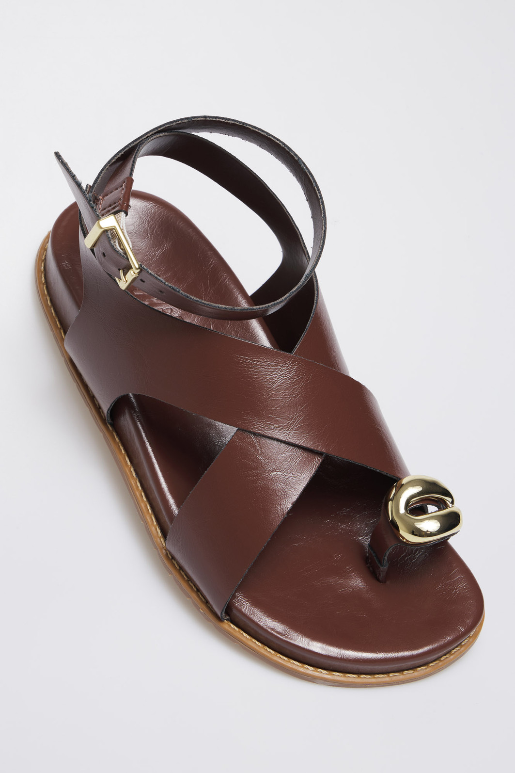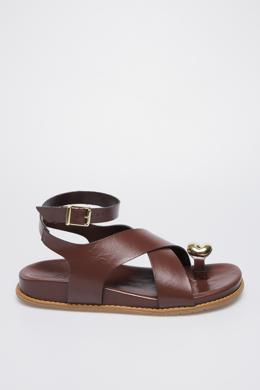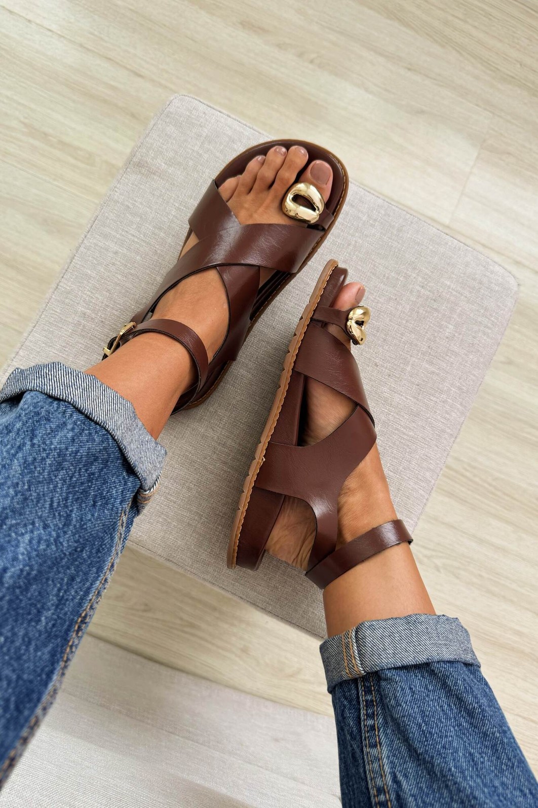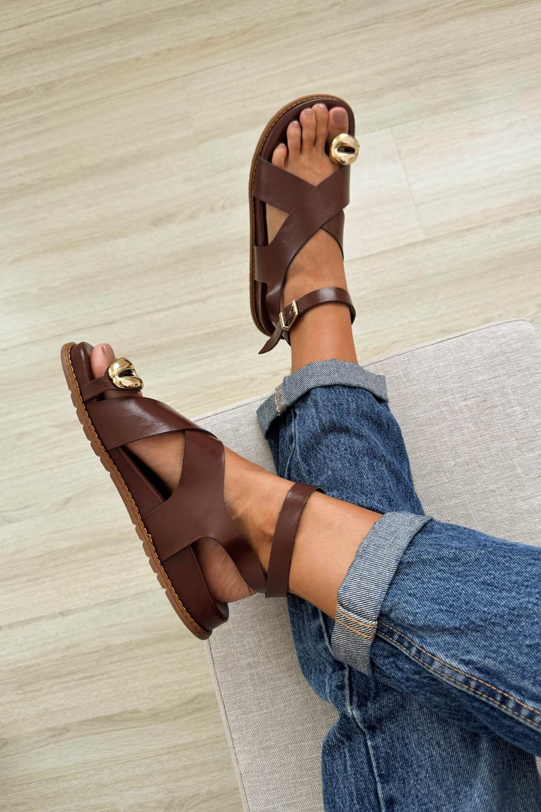 A Sandália Poly Terra MIST combina elegância e conforto em um design versátil e atemporal. Suas tiras cruzadas em napa marrom, junto ao detalhe dourado e à fivela ajustável, garantem segurança e estilo.