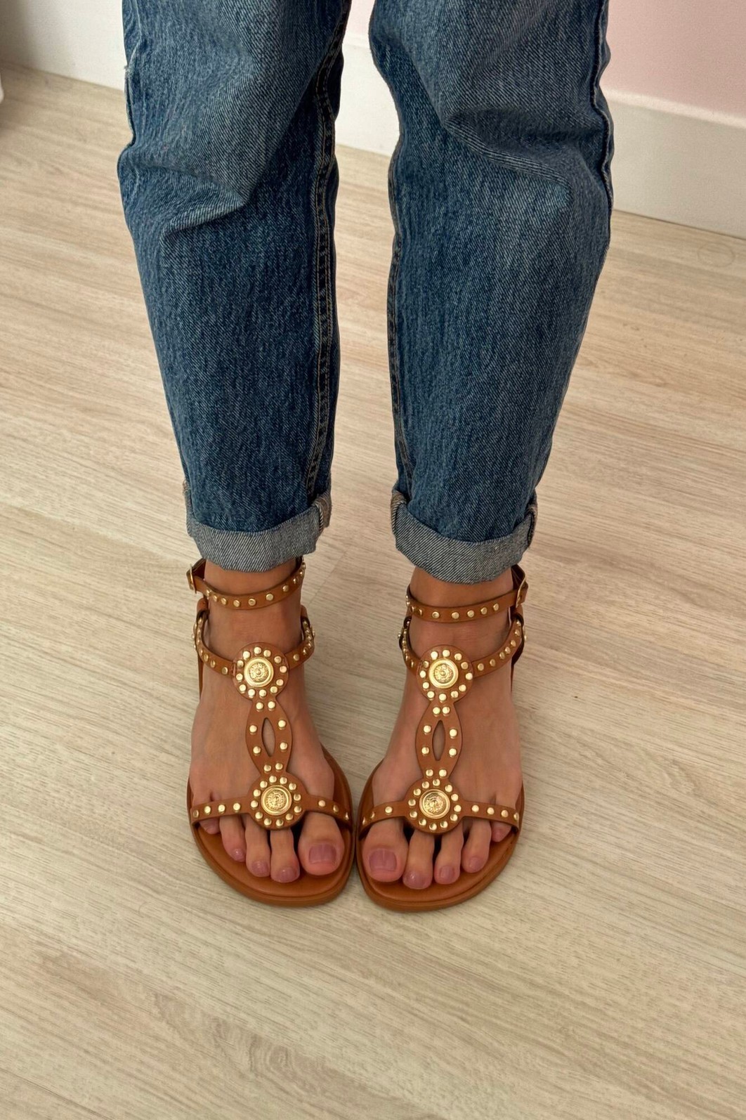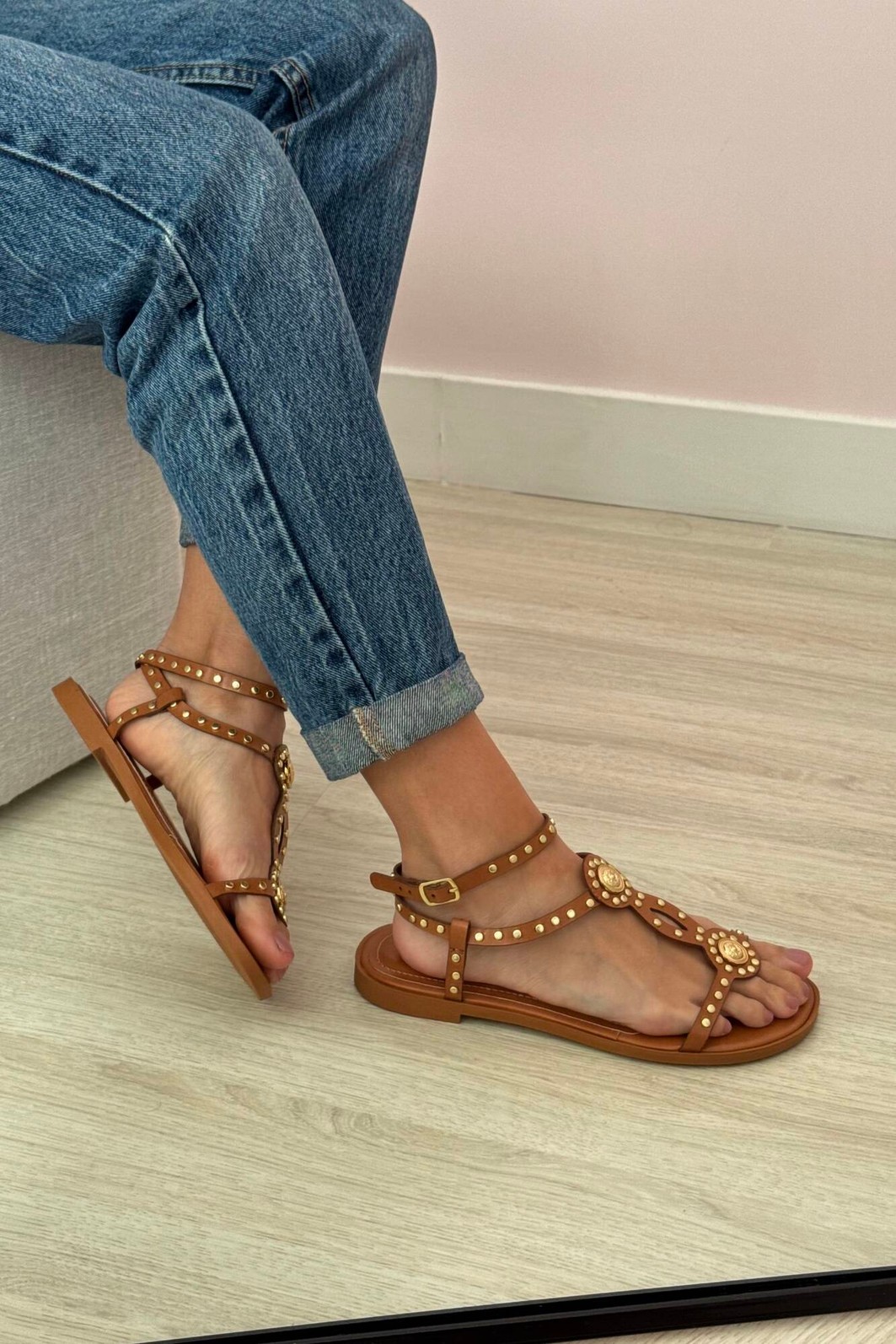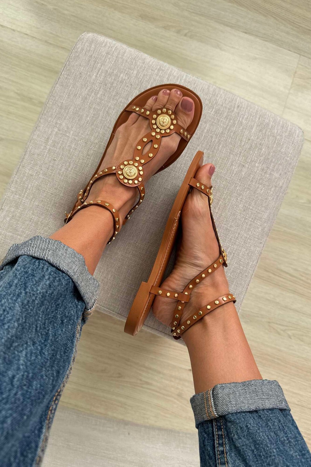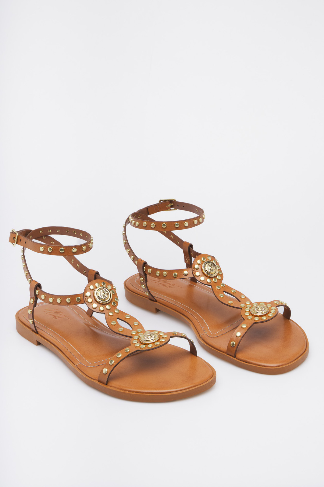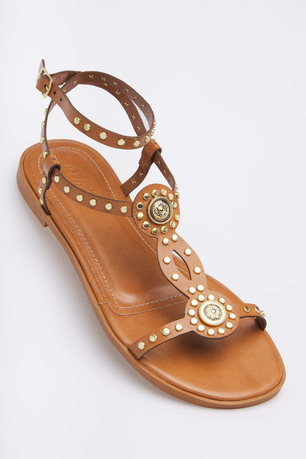 Detalhes: Rebites e adornos circulares dourados, Tiras T-strap (gladiador)