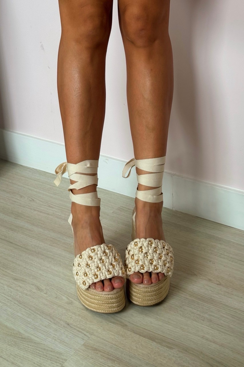 O salto plataforma estilo anabela espadrille garante conforto e estabilidade, enquanto a amarração em fita adiciona um toque romântico. Ideal para casamentos, festas ou looks casuais de verão com um toque chic.