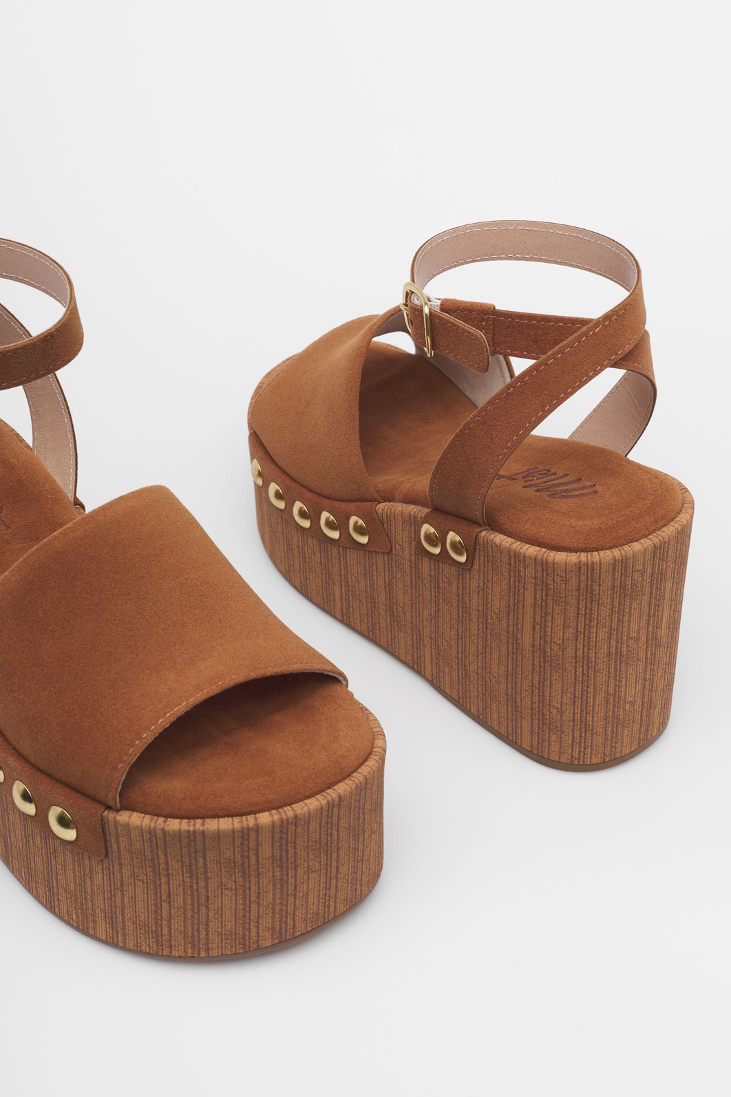 Detalhes: Tachas douradas, Tira larga, Acabamento amadeirado