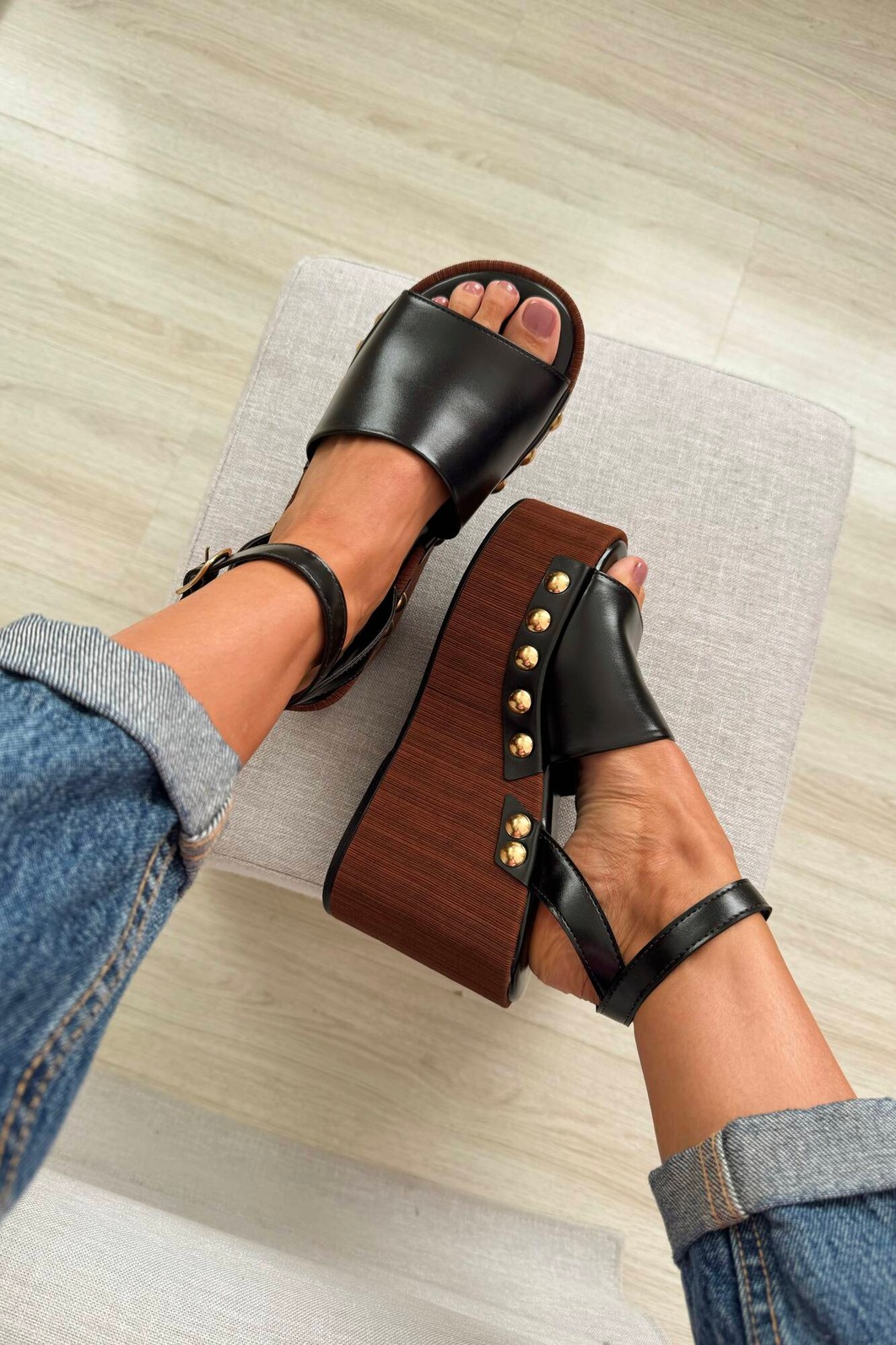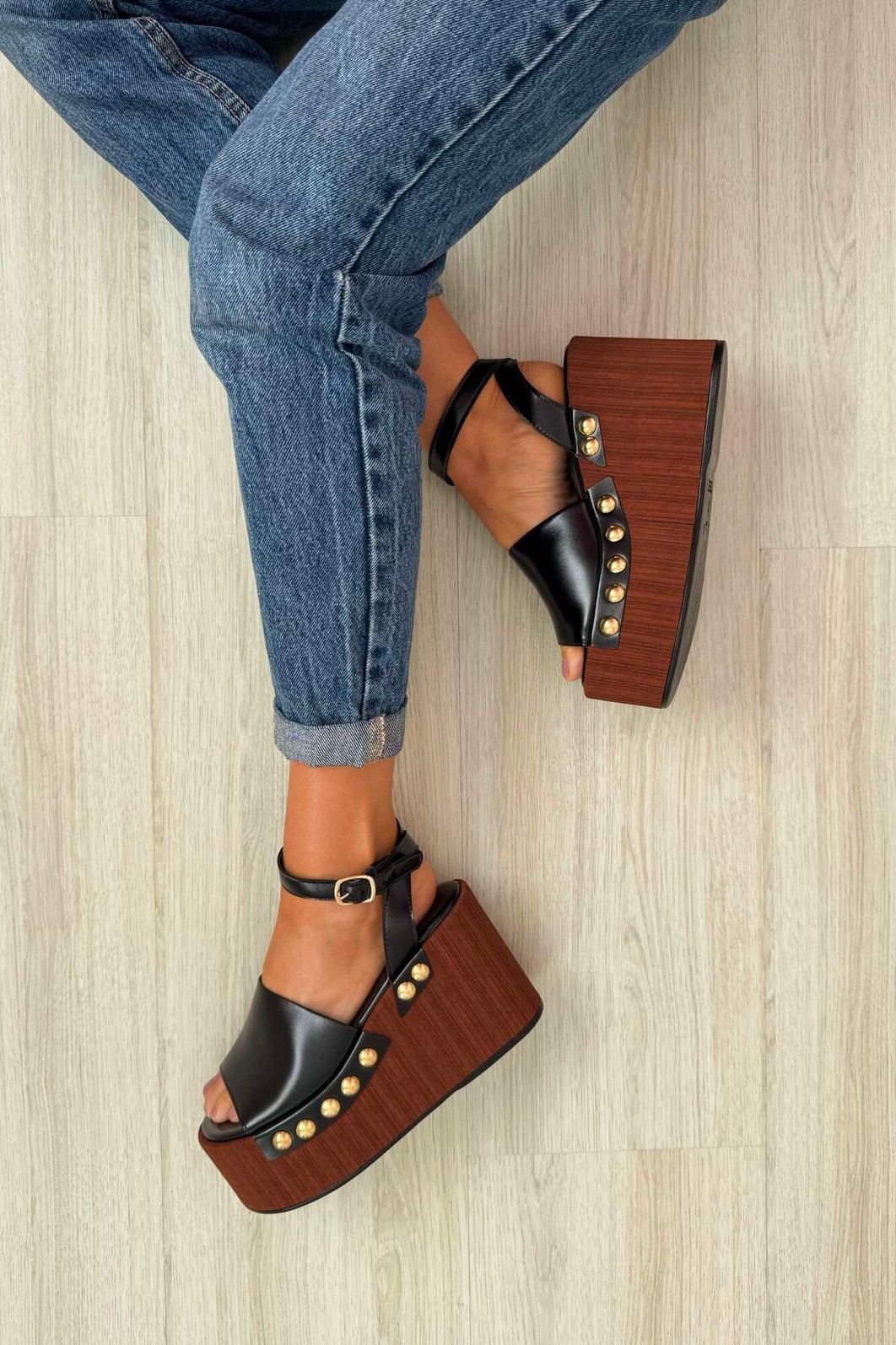 A Sandália Tamires Preto MIST exala atitude e sofisticação. Com imponente plataforma com efeito madeira, o modelo se destaca pelas tiras largas adornadas com rebites dourados, adicionando um toque de glamour e charme rocker à peça.