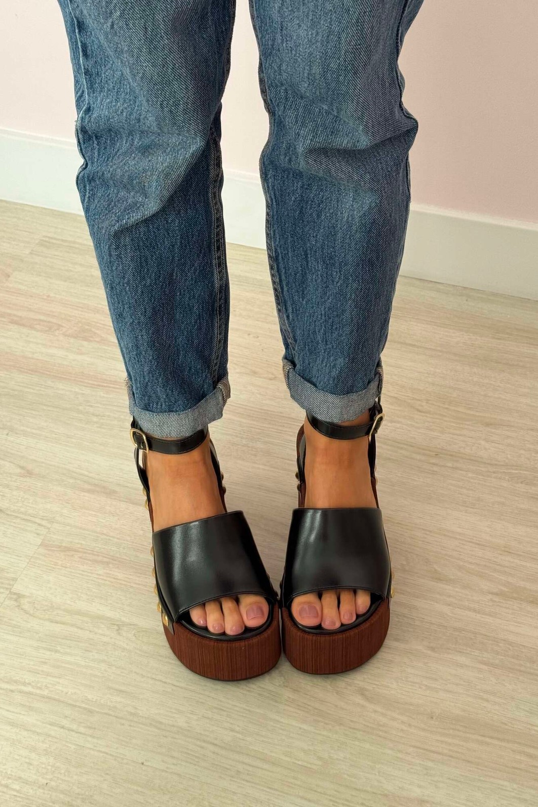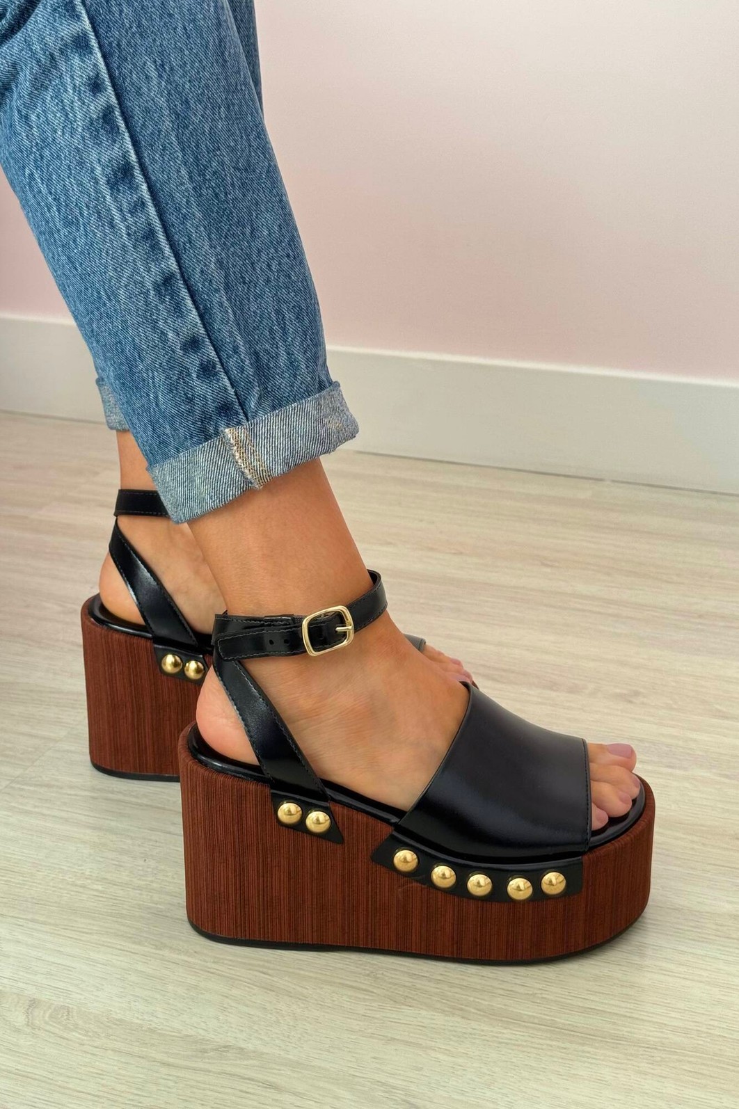 Detalhes: Plataforma efeito madeira, Rebites dourados nas tiras