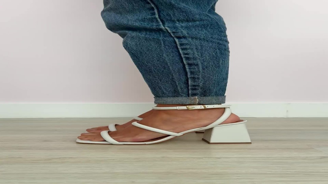 A Sandália Tay Off-White MIST possui um design minimalista e sofisticado. Suas três tiras finas e o salto bloco geométrico garantem estabilidade e um toque moderno, enquanto a fivela dourada adiciona um charme extra.