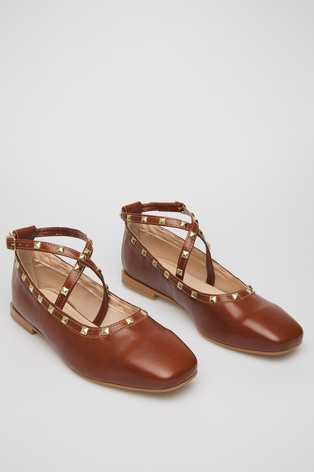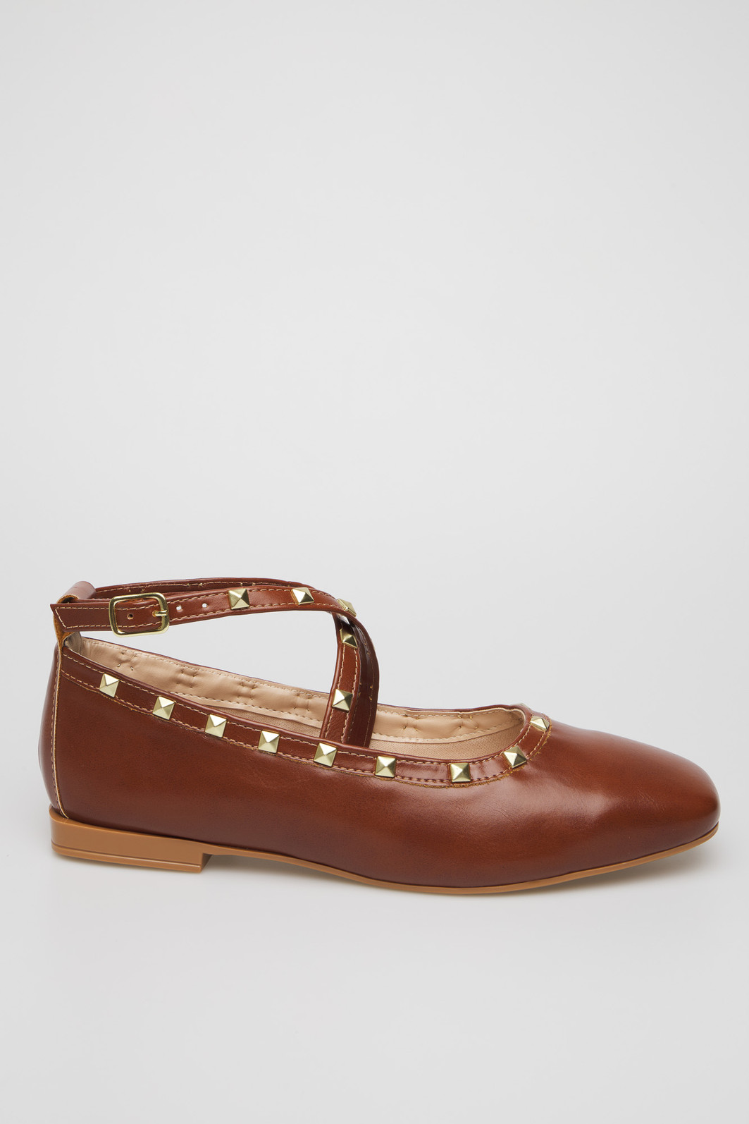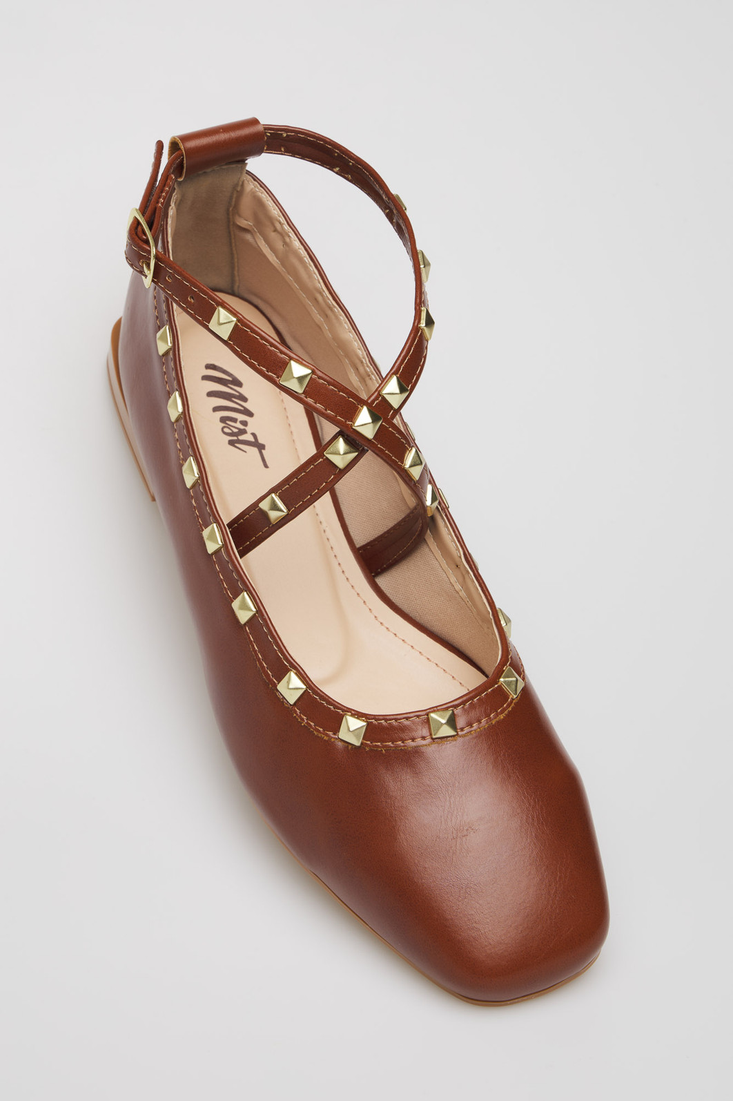 Sapatilha feminina Gaby da MIST em napa caramelo com design elegante e sofisticado. Destaque para suas tiras cruzadas decoradas com tachas douradas quadradas e fivela lateral ajustável. Interior acolchoado em tom nude para maior conforto, salto baixo e solado em tom caramelo. Versatilidade que combina com looks casuais e semi-formais, perfeita para o dia a dia com estilo.