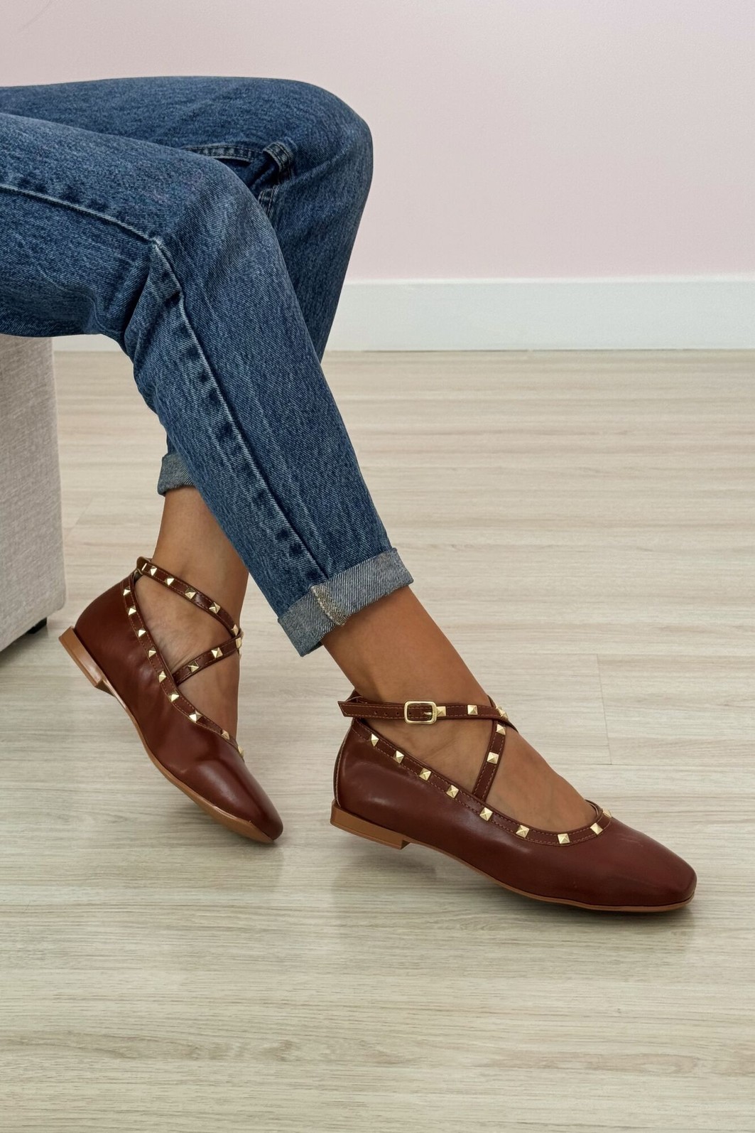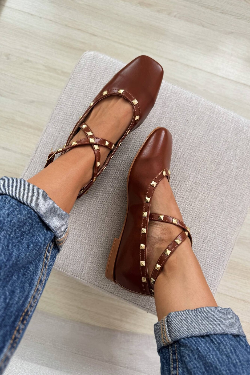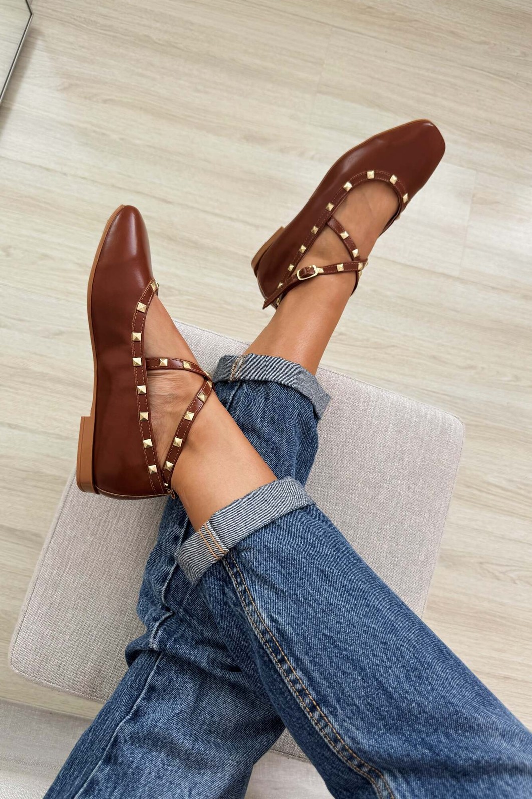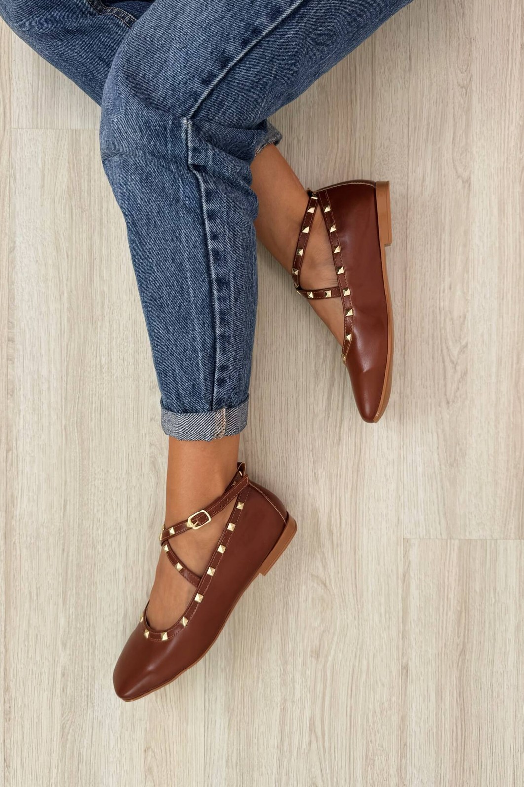 Sapatilha feminina Gaby da MIST em napa caramelo com design elegante e sofisticado. Destaque para suas tiras cruzadas decoradas com tachas douradas quadradas e fivela lateral ajustável. Interior acolchoado em tom nude para maior conforto, salto baixo e solado em tom caramelo. Versatilidade que combina com looks casuais e semi-formais, perfeita para o dia a dia com estilo.