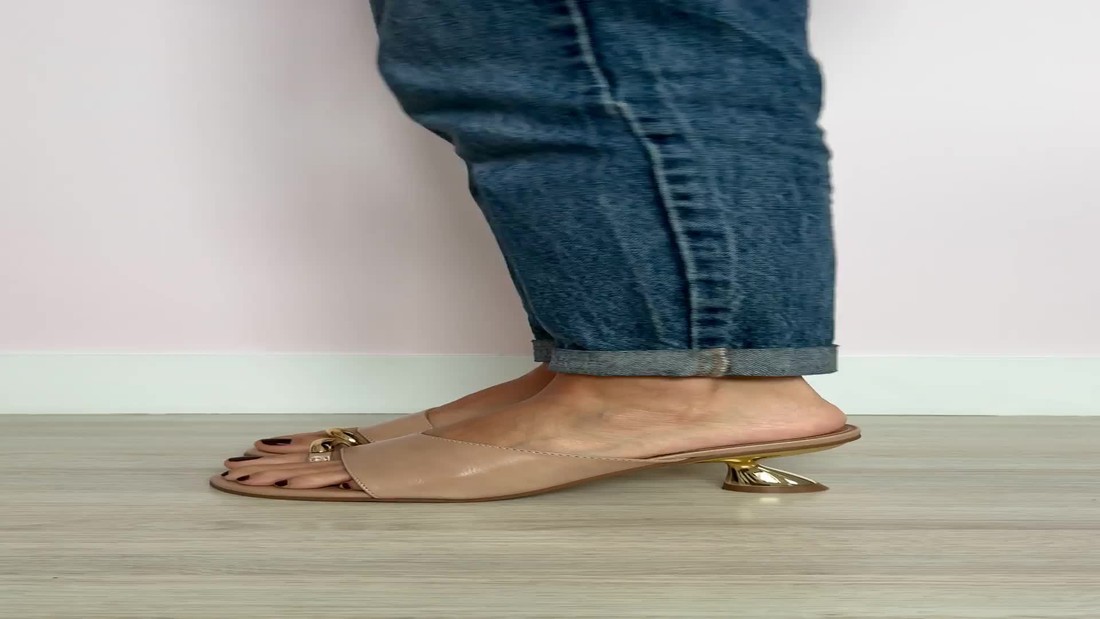 O Tamanco Lis Nude MIST é a definição de sofisticação moderna. Com design único e arquitetônico, seu protagonista é o salto escultural em formato de taça com acabamento dourado, que confere um ar luxuoso e ousado à produção.