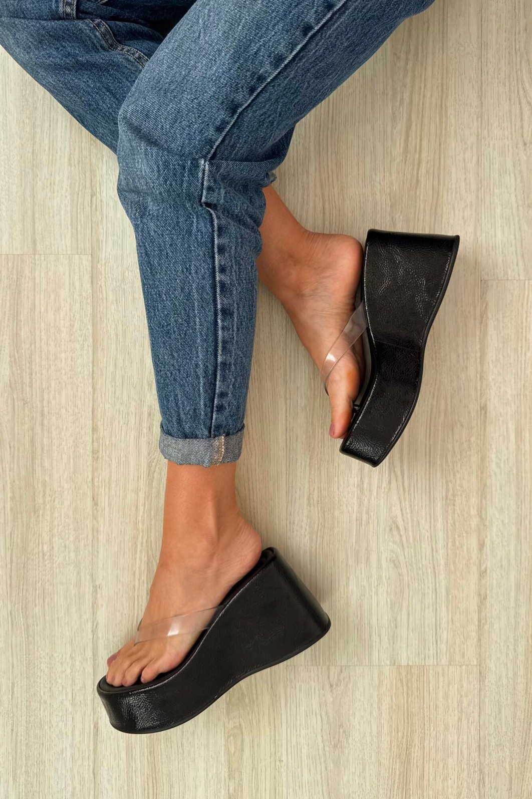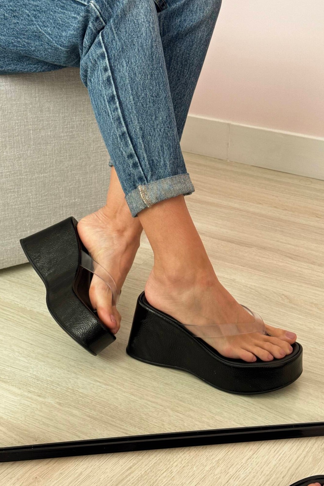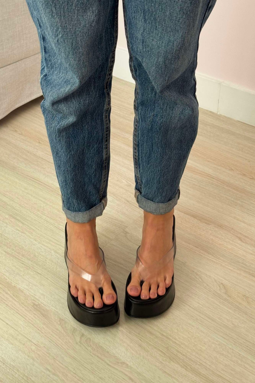 O Tamanco Vinil Preto MIST combina a modernidade da transparência com a robustez da plataforma. Sua tira frontal em vinil cria efeito "naked" elegante e atual, enquanto a base preta proporciona impacto visual e estabilidade no caminhar.