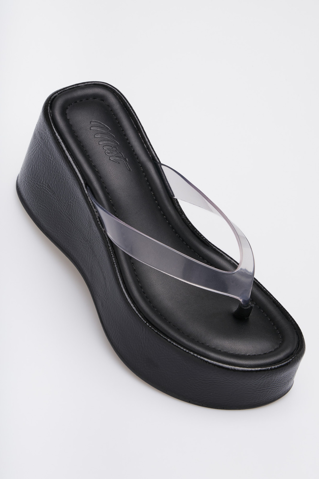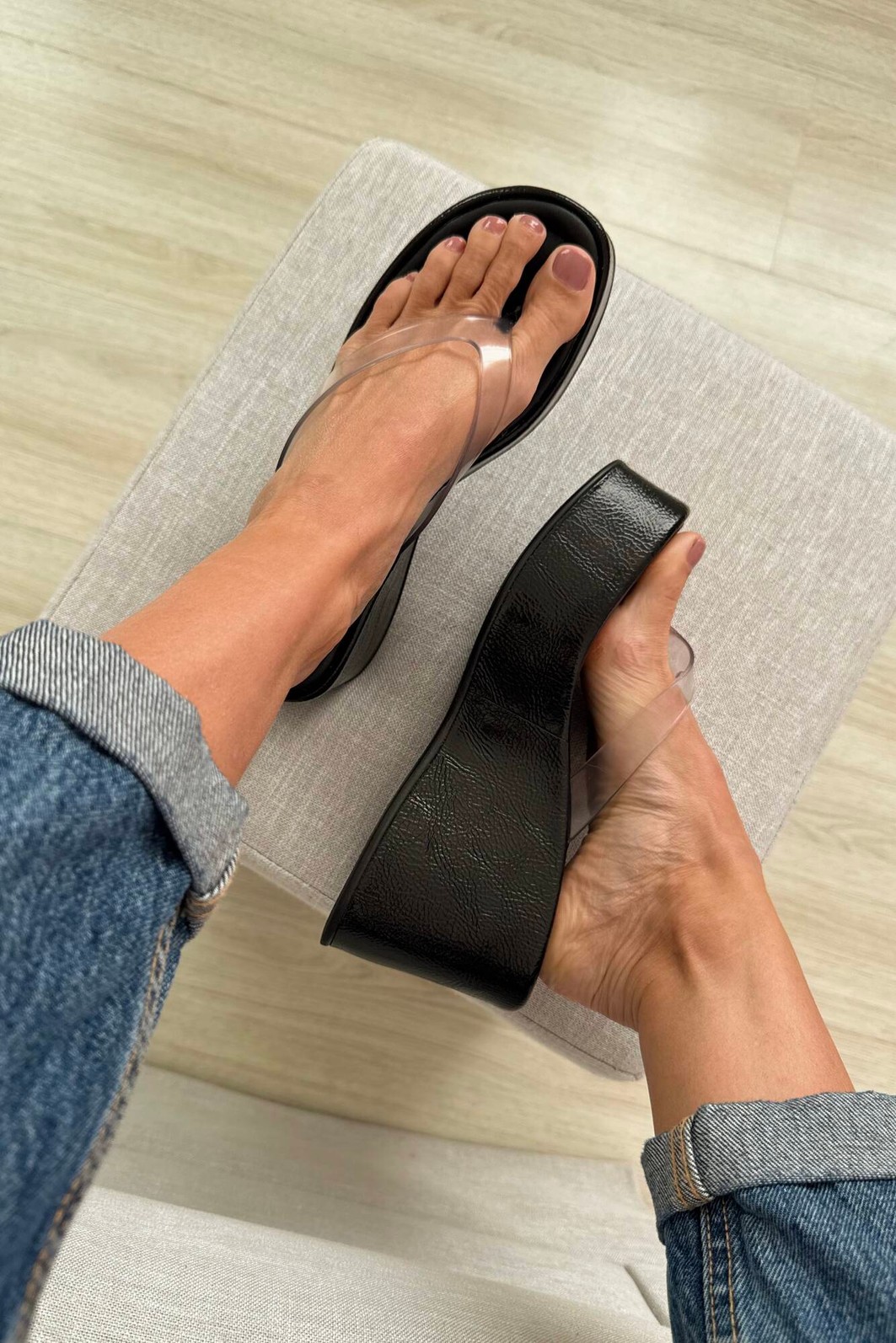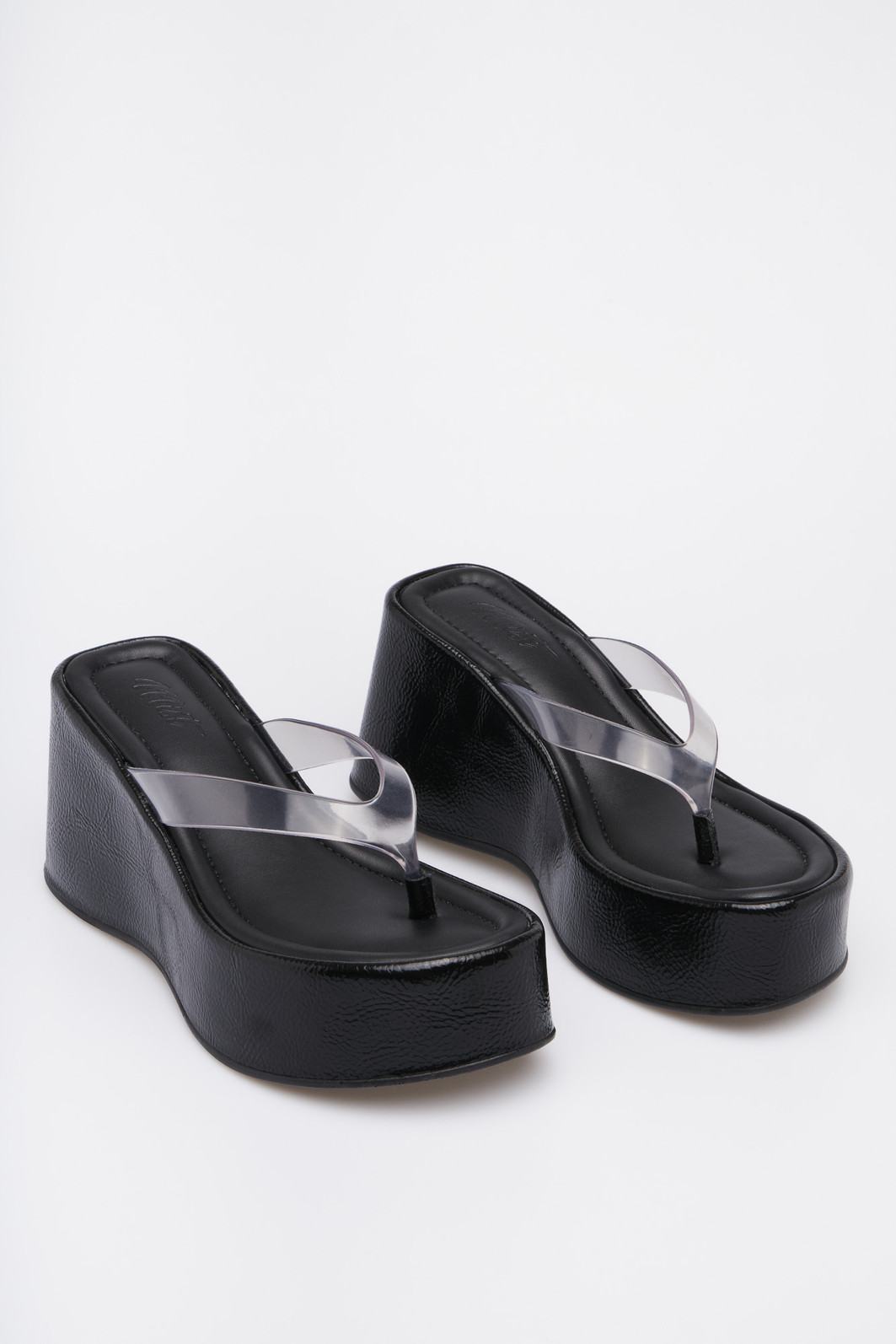 O Tamanco Vinil Preto MIST combina a modernidade da transparência com a robustez da plataforma. Sua tira frontal em vinil cria efeito "naked" elegante e atual, enquanto a base preta proporciona impacto visual e estabilidade no caminhar.