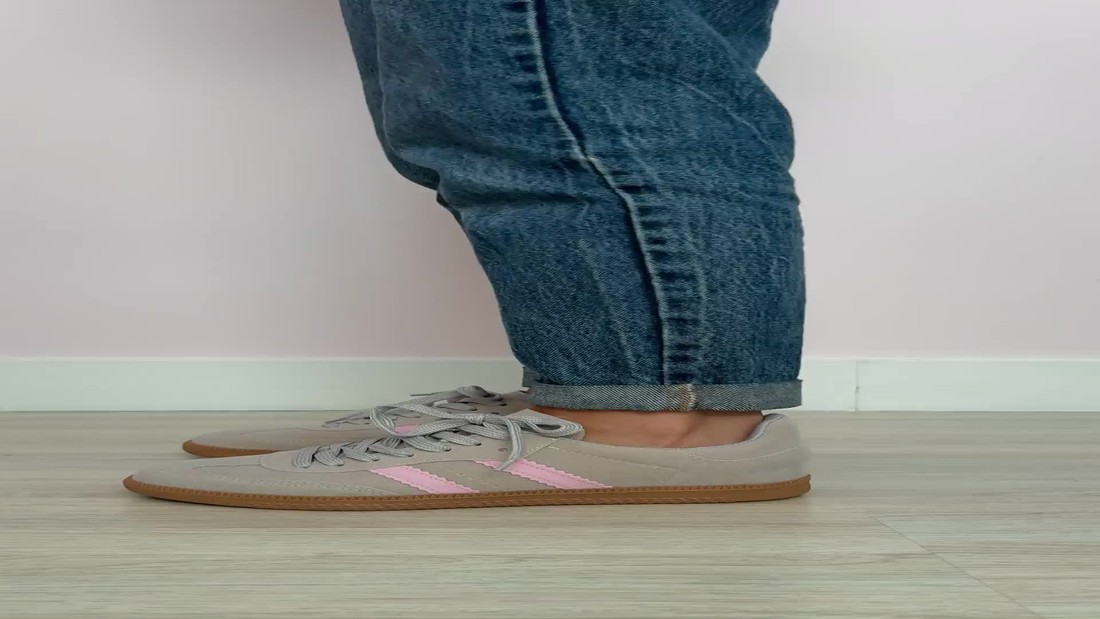 Detalhes: Listras laterais em rosa, Solado caramelo retrô em borracha natural, Cadarços cinza claro