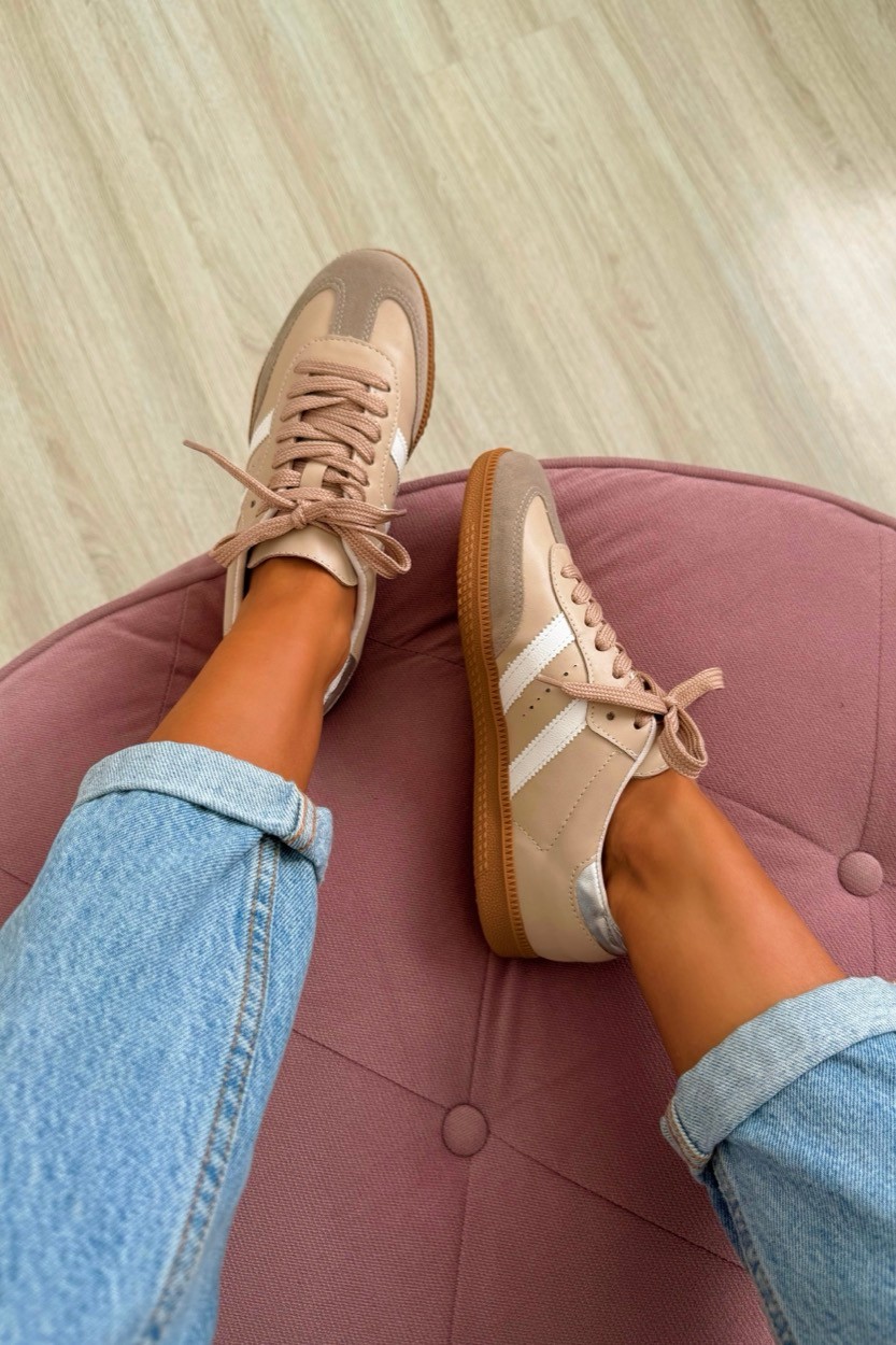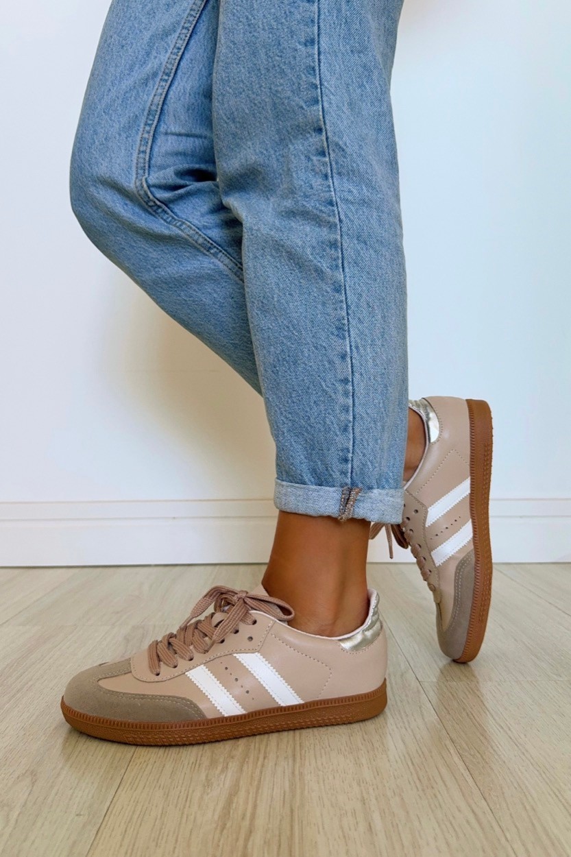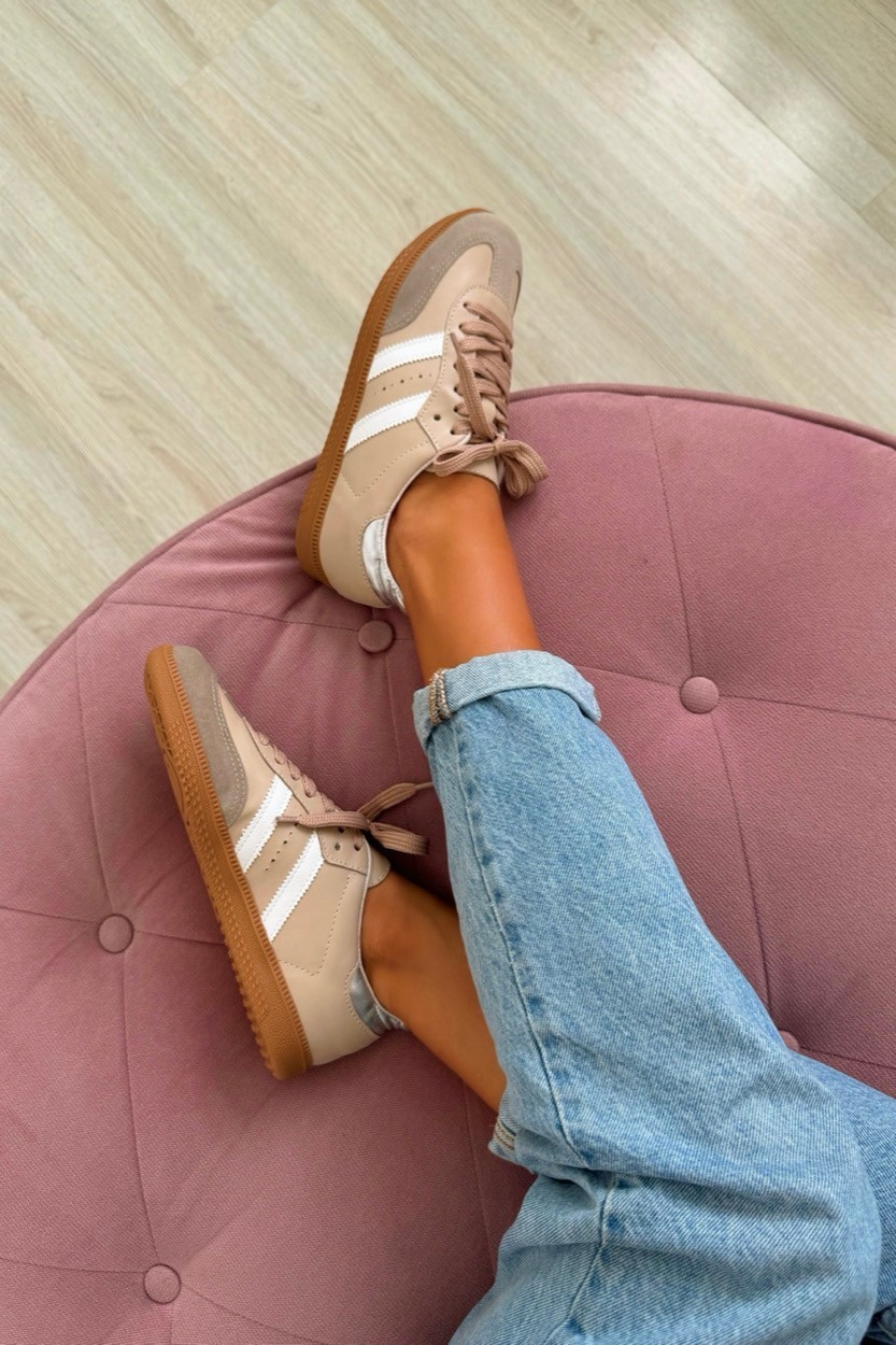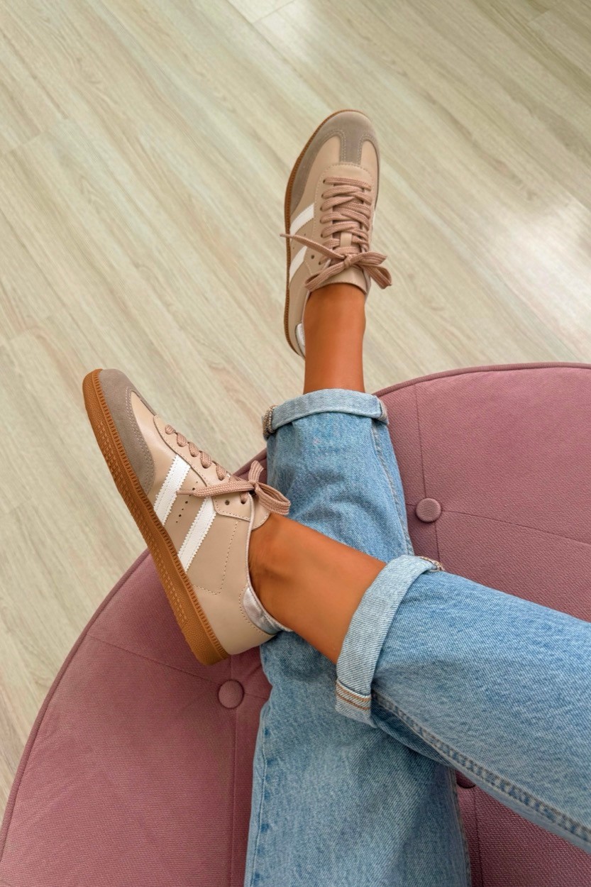 A combinação do cabedal em nude com a biqueira em camurça, as icônicas listras laterais brancas e a sola gum garantem um visual autêntico. O detalhe prateado no calcanhar adiciona sofisticação à versatilidade, perfeito para elevar do jeans básico à alfaiataria desconstruída.