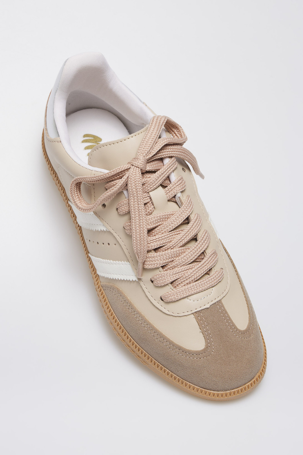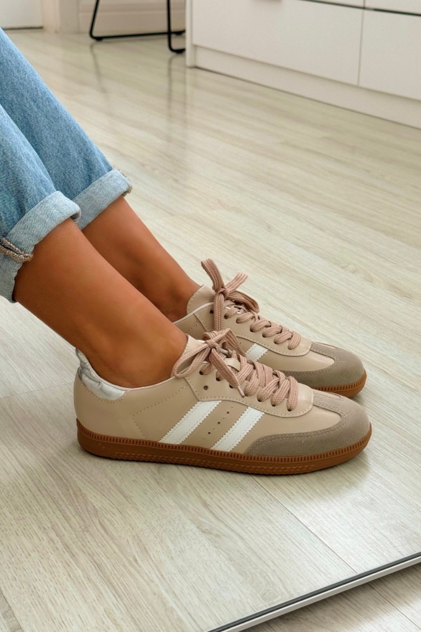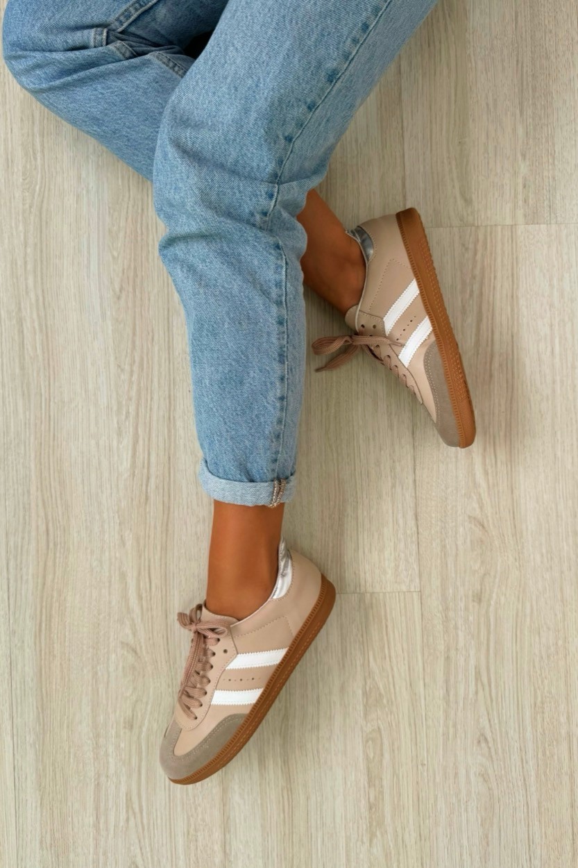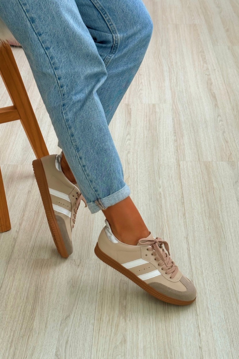 A combinação do cabedal em nude com a biqueira em camurça, as icônicas listras laterais brancas e a sola gum garantem um visual autêntico. O detalhe prateado no calcanhar adiciona sofisticação à versatilidade, perfeito para elevar do jeans básico à alfaiataria desconstruída.