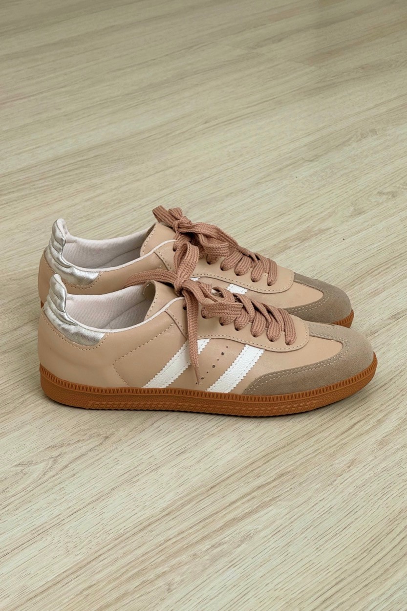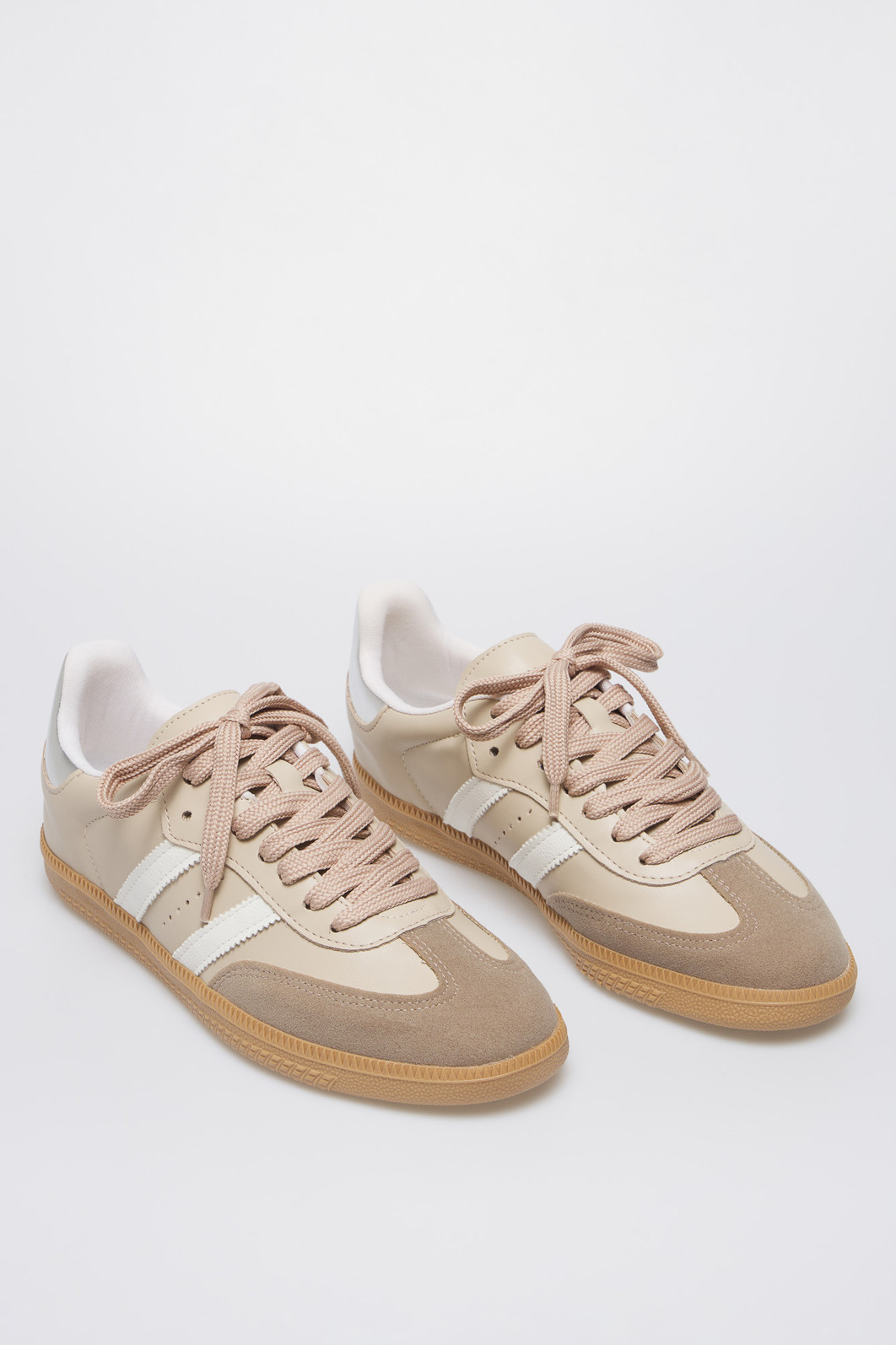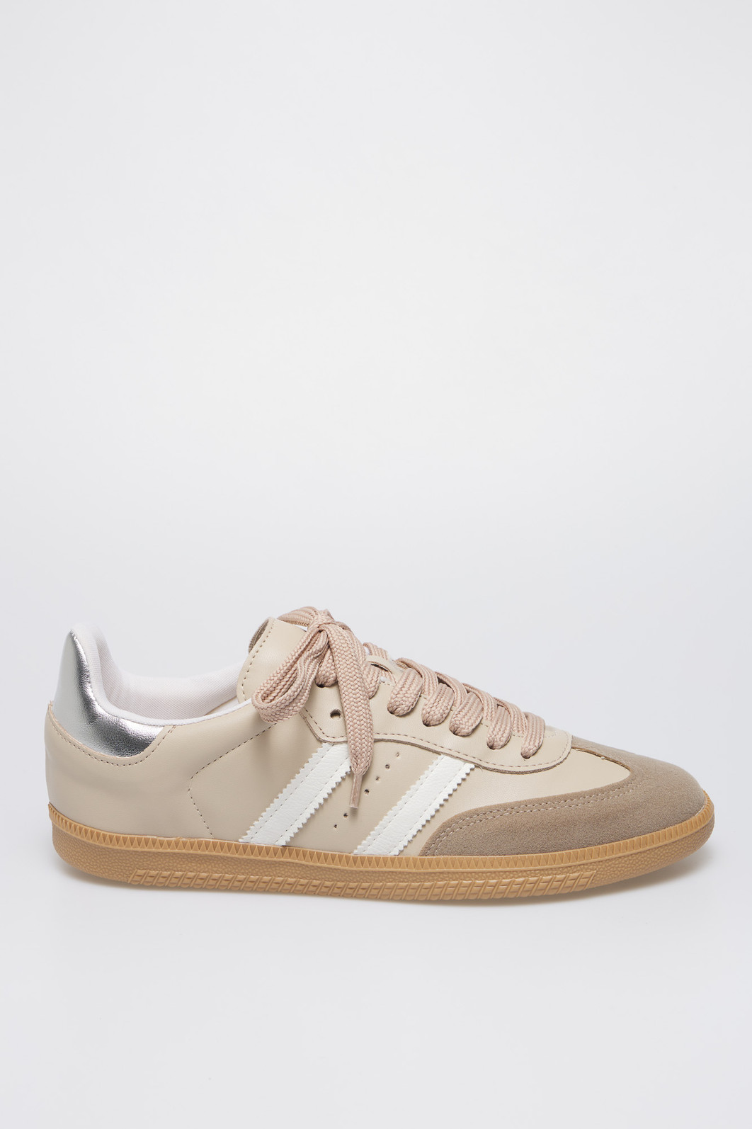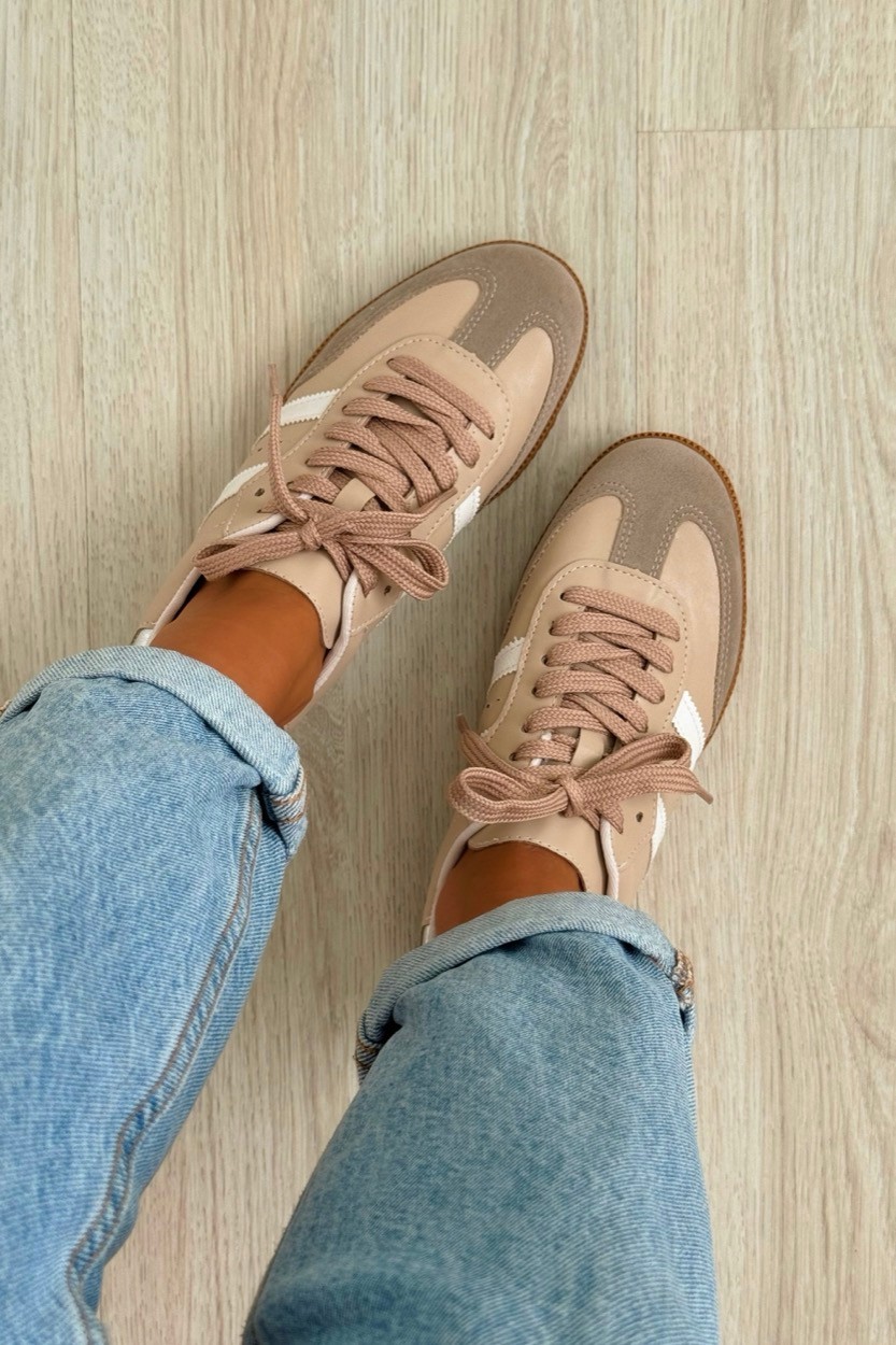 A combinação do cabedal em nude com a biqueira em camurça, as icônicas listras laterais brancas e a sola gum garantem um visual autêntico. O detalhe prateado no calcanhar adiciona sofisticação à versatilidade, perfeito para elevar do jeans básico à alfaiataria desconstruída.